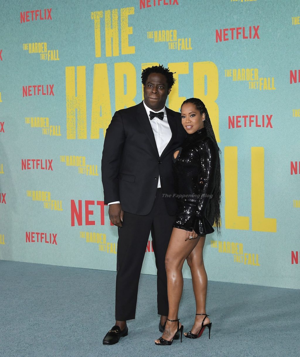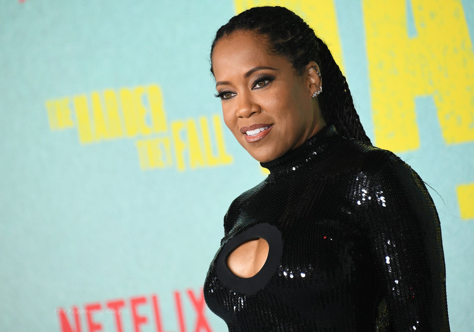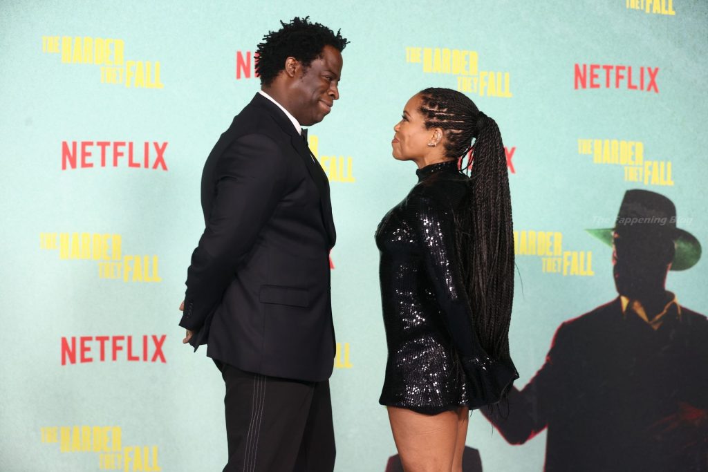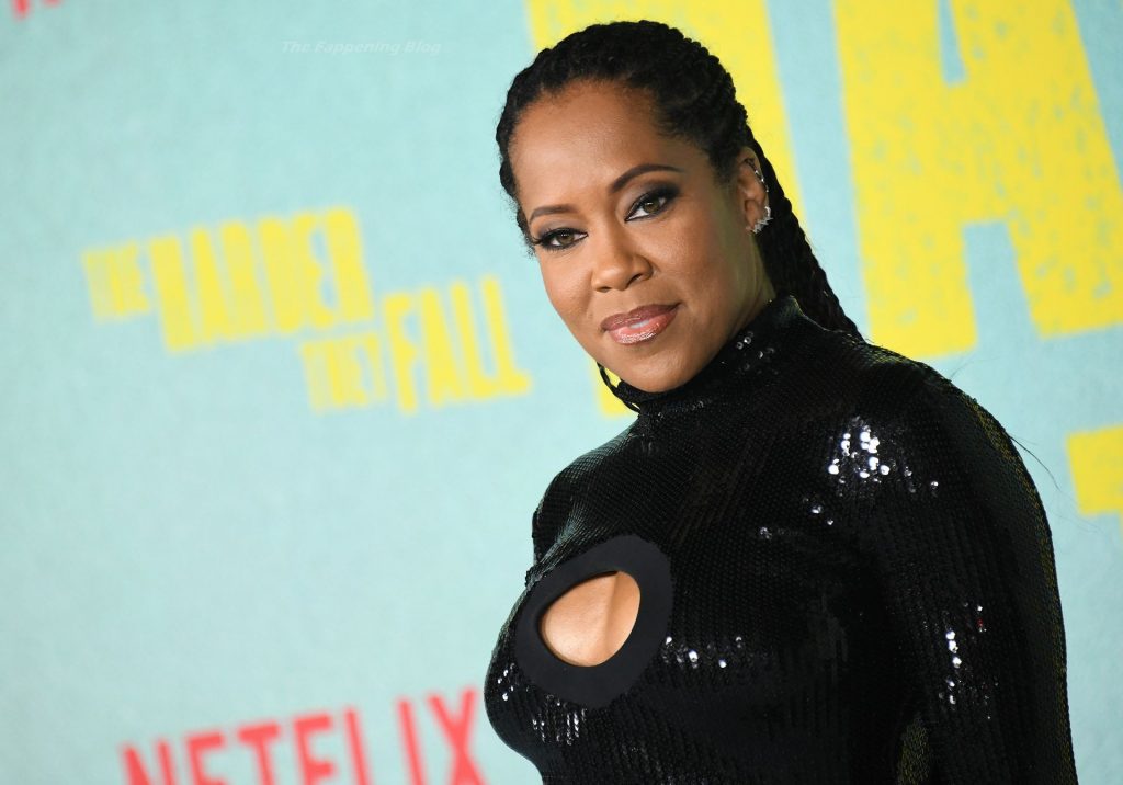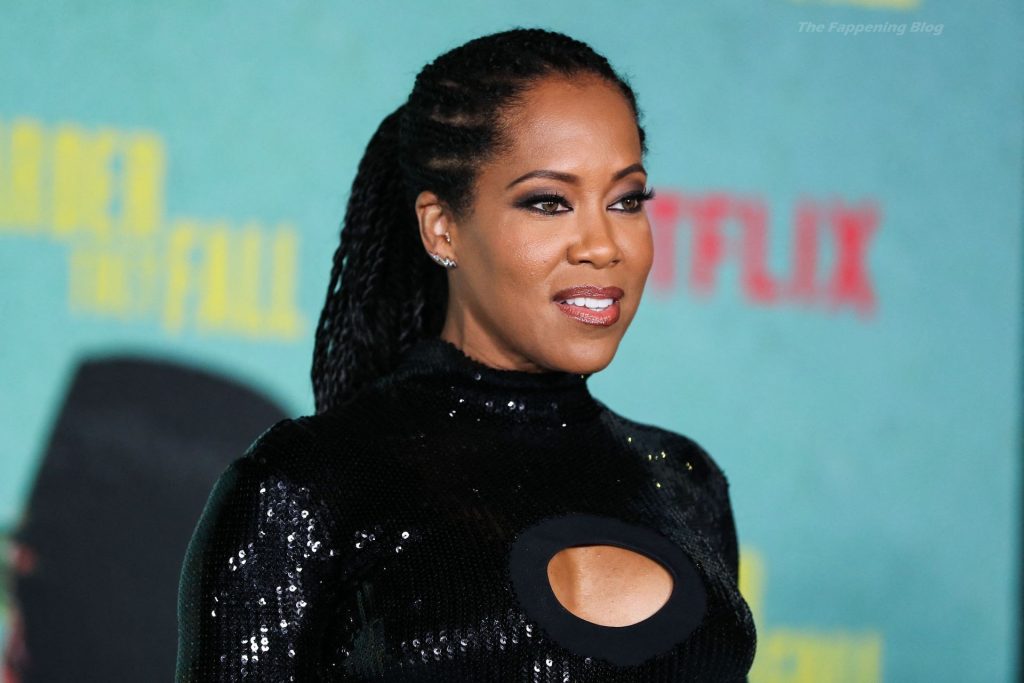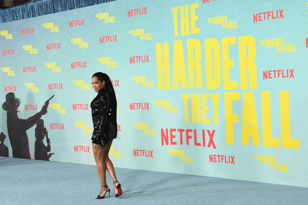 Actriz Regina King posa con un vestido negro en la alfombra roja del estreno en Los Ángeles de “The Harder They Fall” en el Shrine Auditorium and Expo Hall, 13/10/2021.