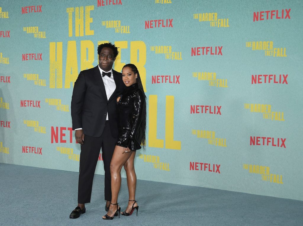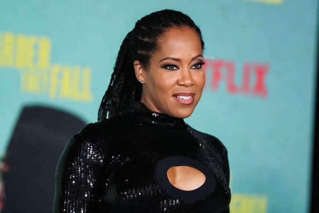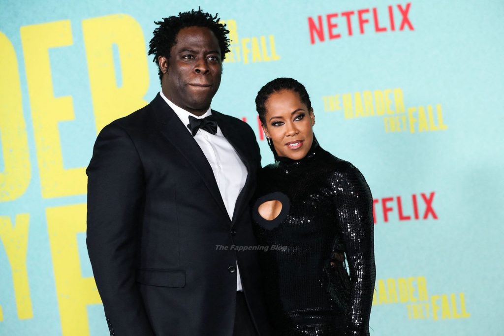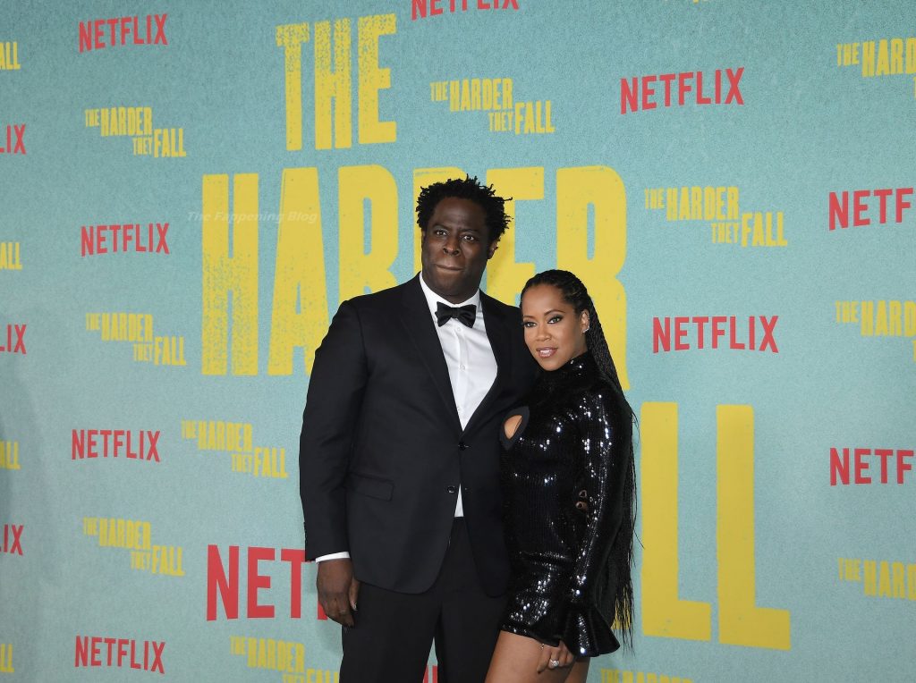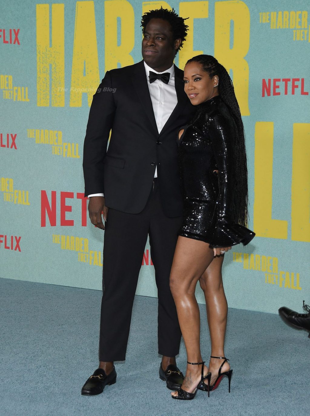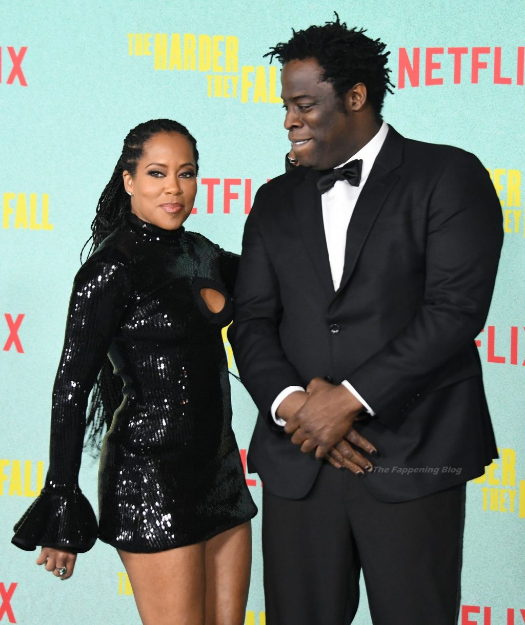 Actriz Regina King posa con un vestido negro en la alfombra roja del estreno en Los Ángeles de “The Harder They Fall” en el Shrine Auditorium and Expo Hall, 13/10/2021.