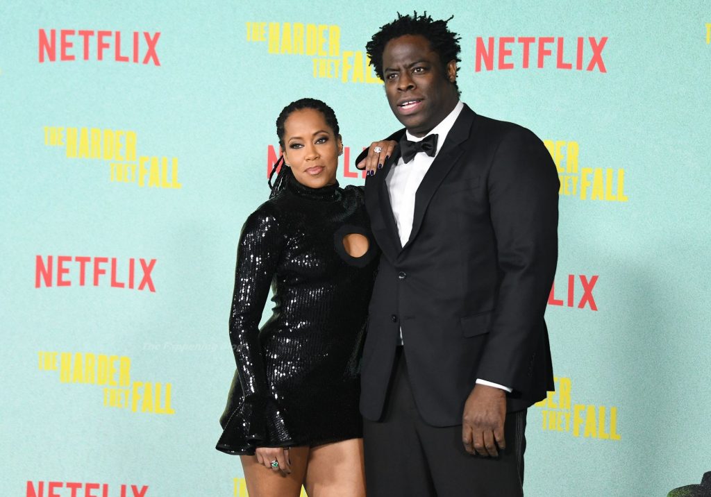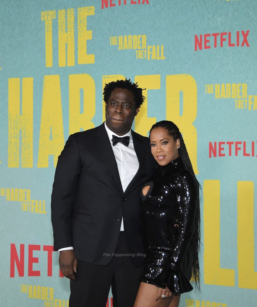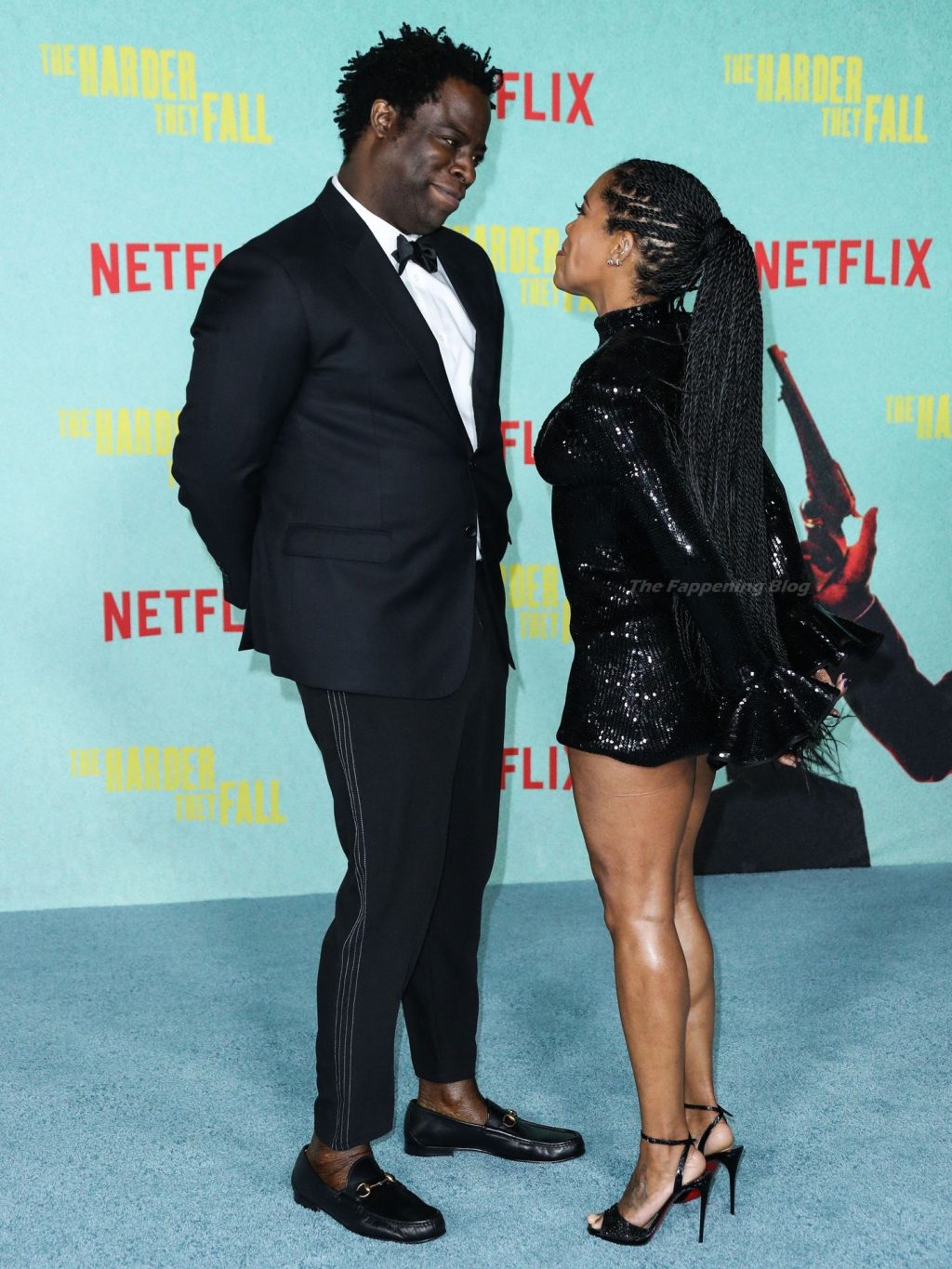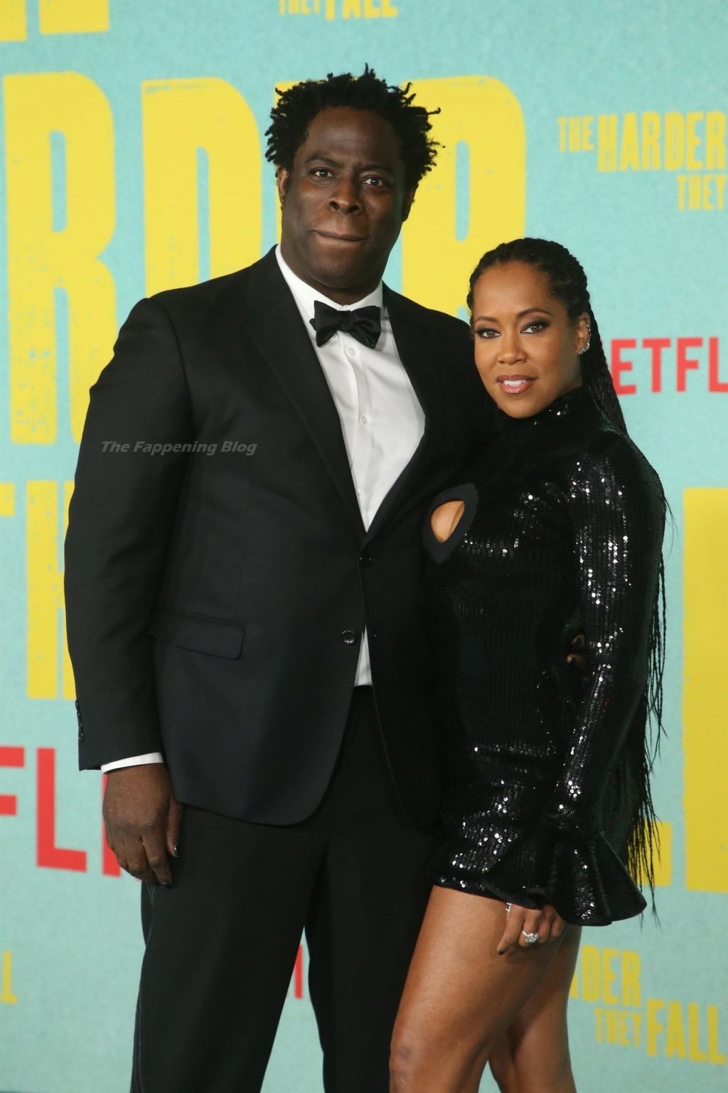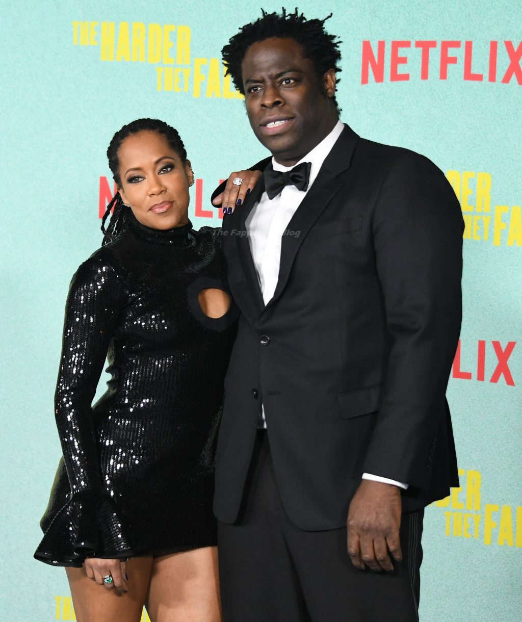 Actriz Regina King posa con un vestido negro en la alfombra roja del estreno en Los Ángeles de “The Harder They Fall” en el Shrine Auditorium and Expo Hall, 13/10/2021.