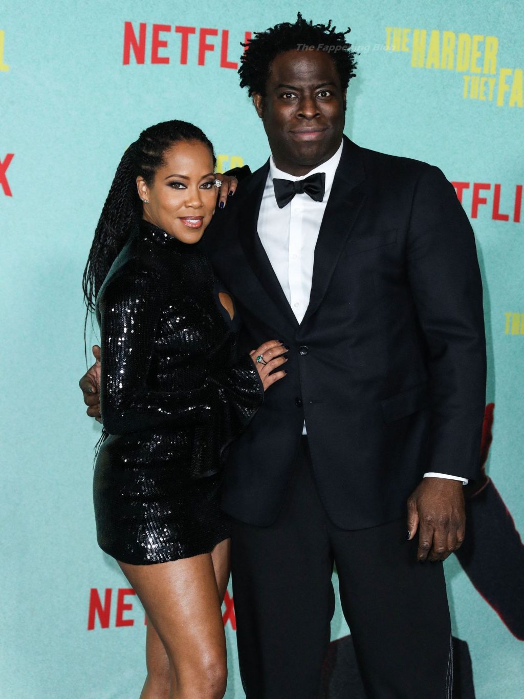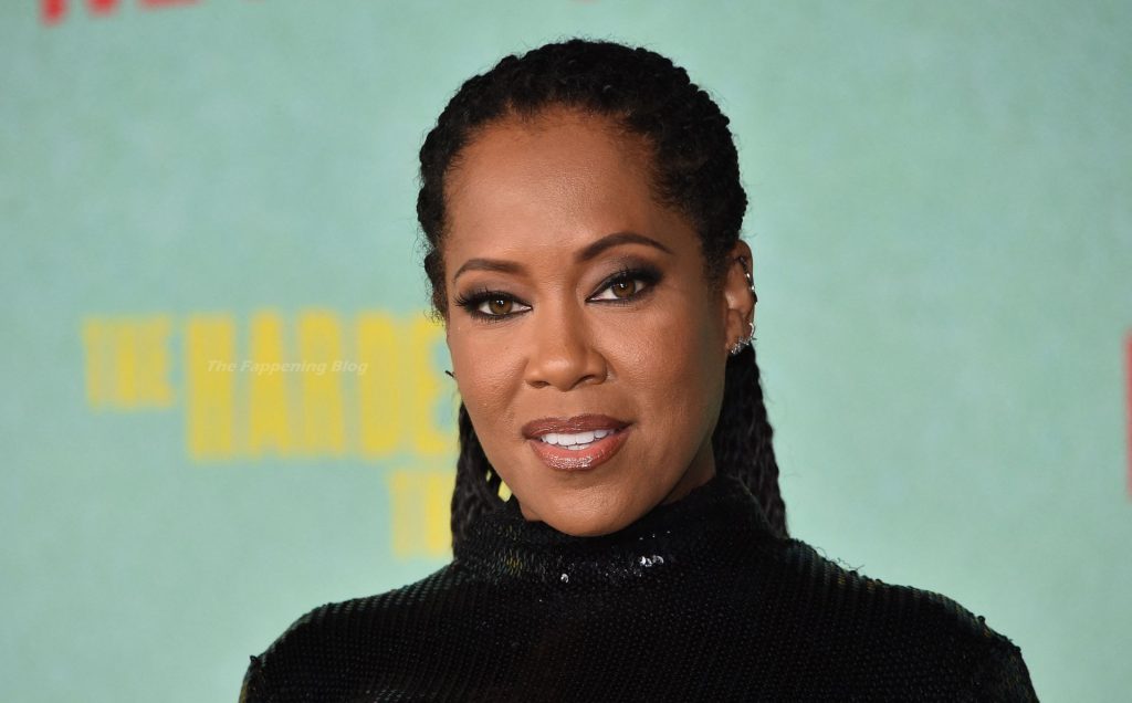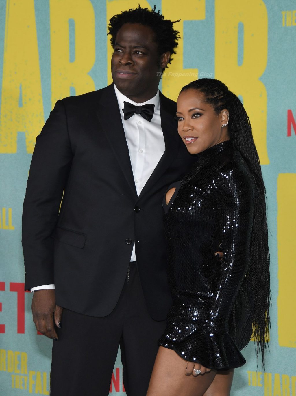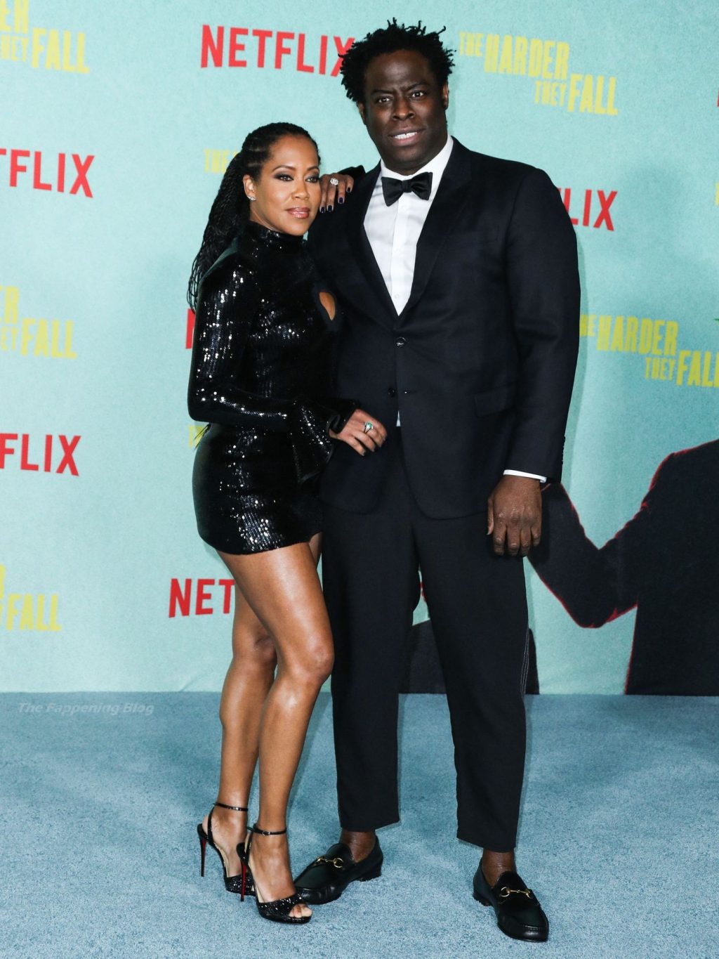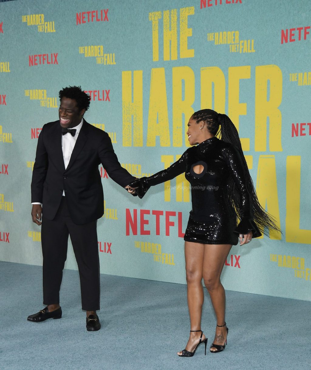 Actriz Regina King posa con un vestido negro en la alfombra roja del estreno en Los Ángeles de “The Harder They Fall” en el Shrine Auditorium and Expo Hall, 13/10/2021.