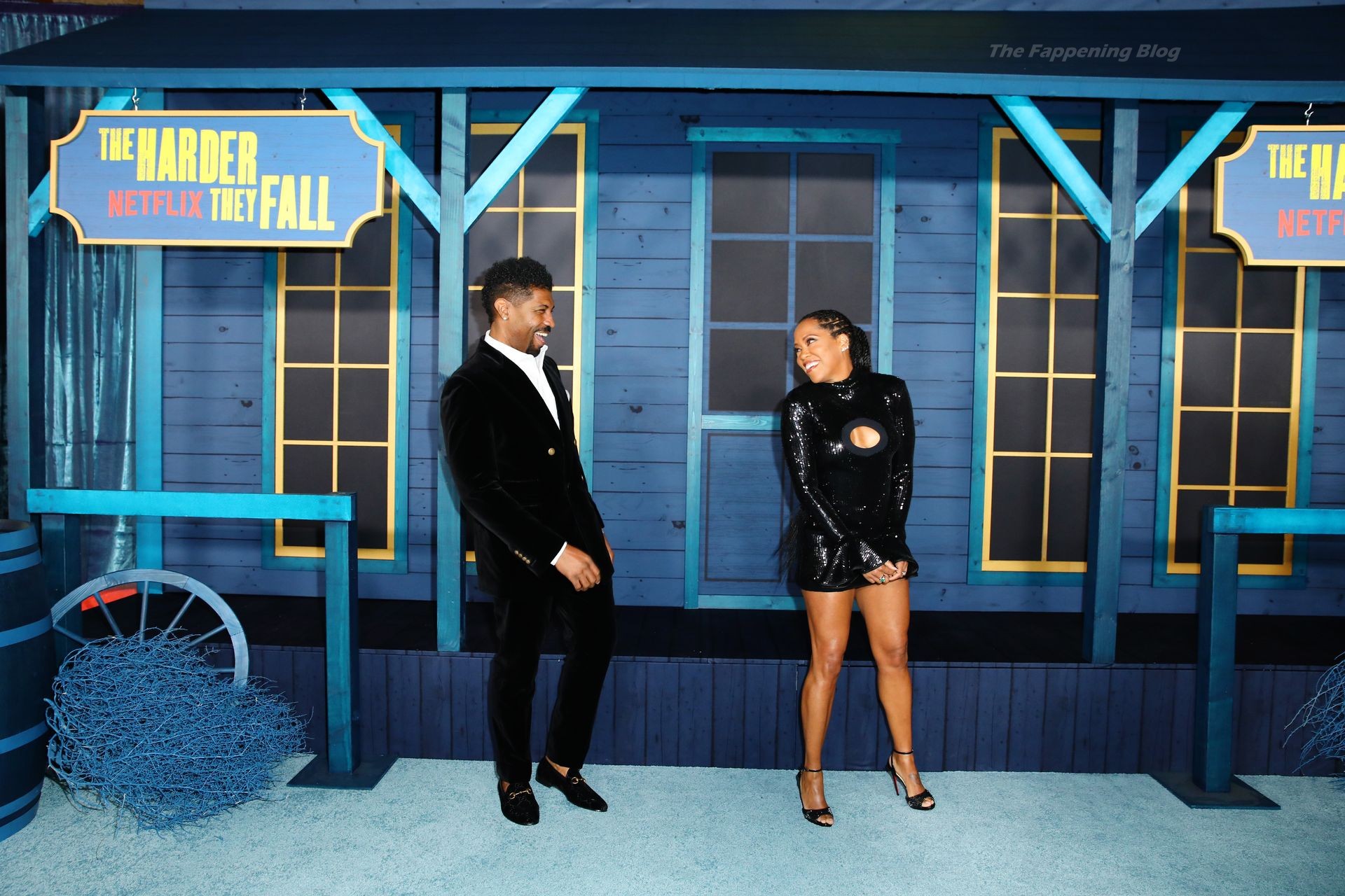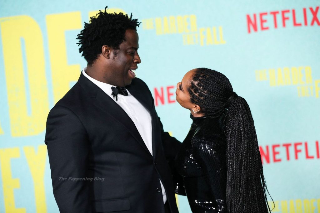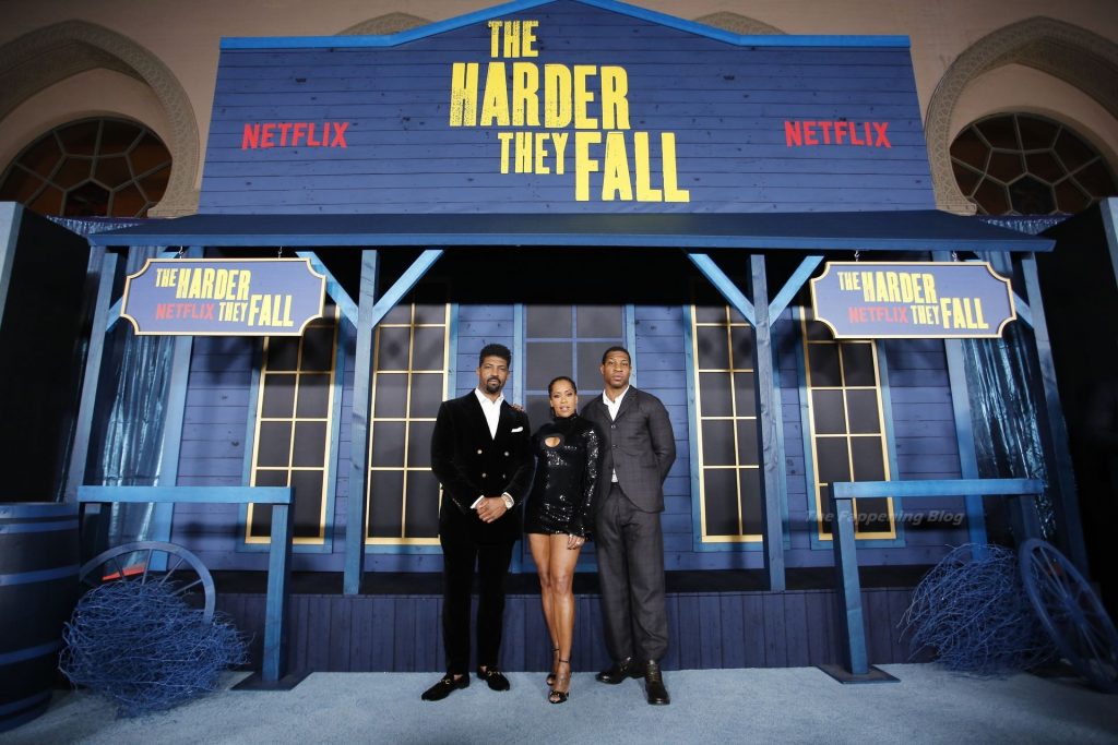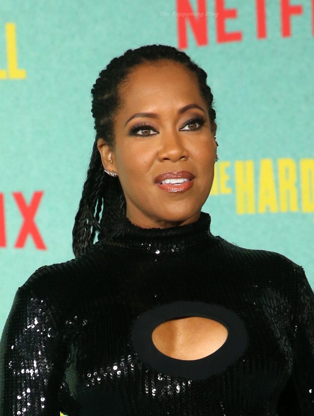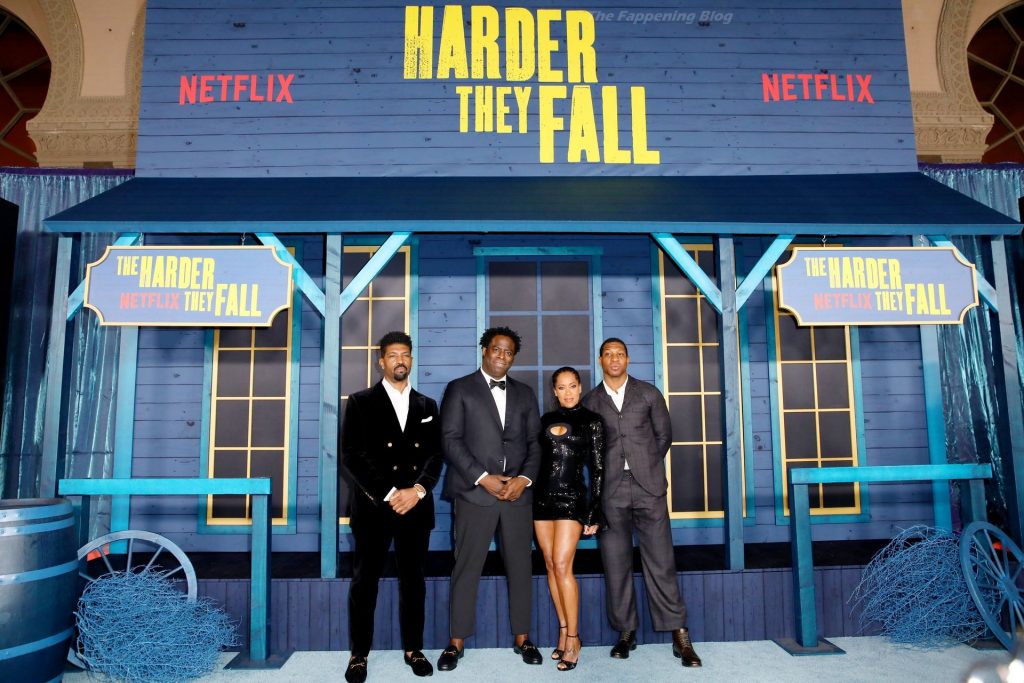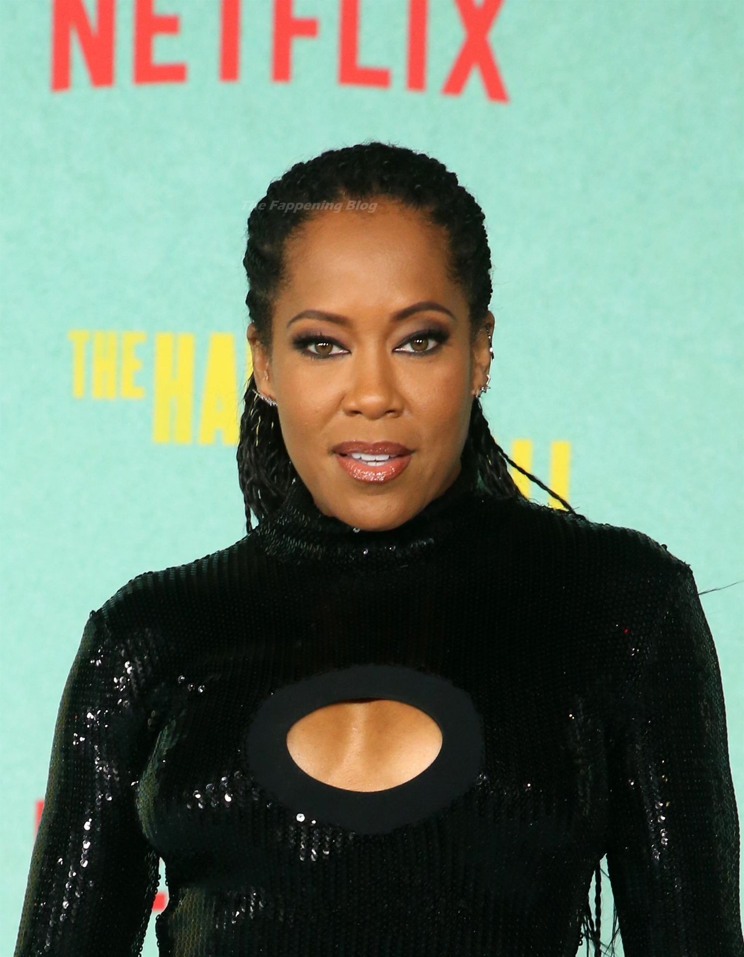 Actriz Regina King posa con un vestido negro en la alfombra roja del estreno en Los Ángeles de “The Harder They Fall” en el Shrine Auditorium and Expo Hall, 13/10/2021.