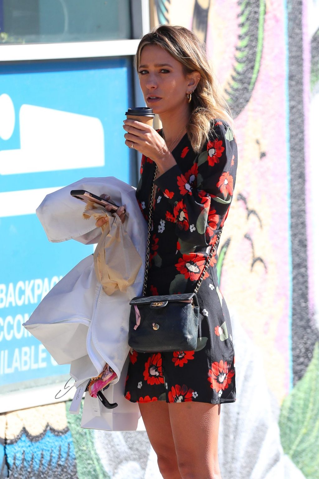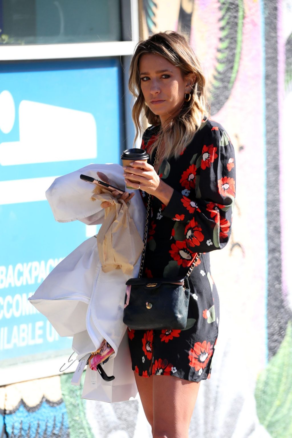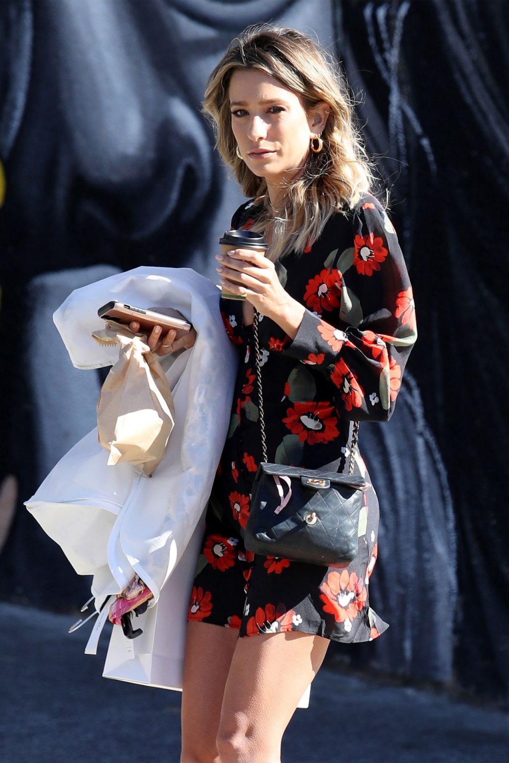 Leggy reportera de entretenimiento de Extra TV australiana Renée Bargh fue fotografiada atrayendo la atención de algunos hombres mientras tomaba café en Bondi, 11/10/2019.