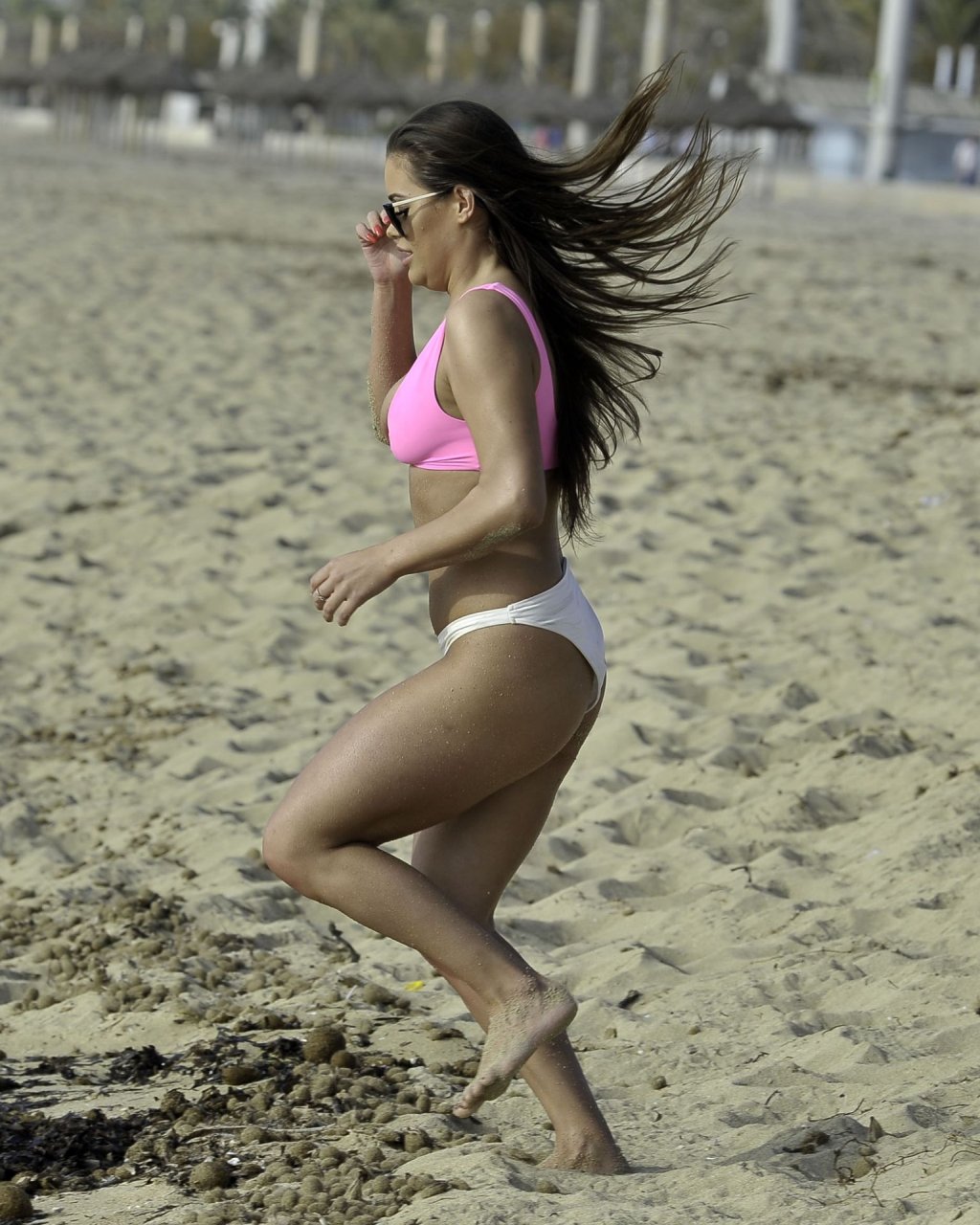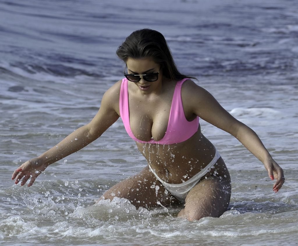 “Ex on the Beach” S9 Rhianne Saxby lucha por contener sus atributos mientras estalla de su bikini rosa brillante durante una escapada en solitario a España, mientras juega en la playa mostrando sus enormes atributos, 01/08/2019.
