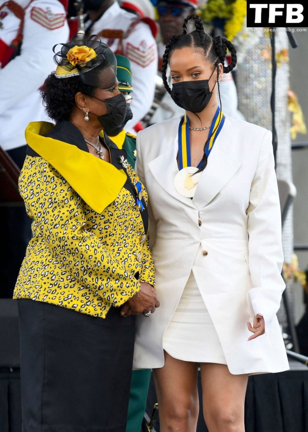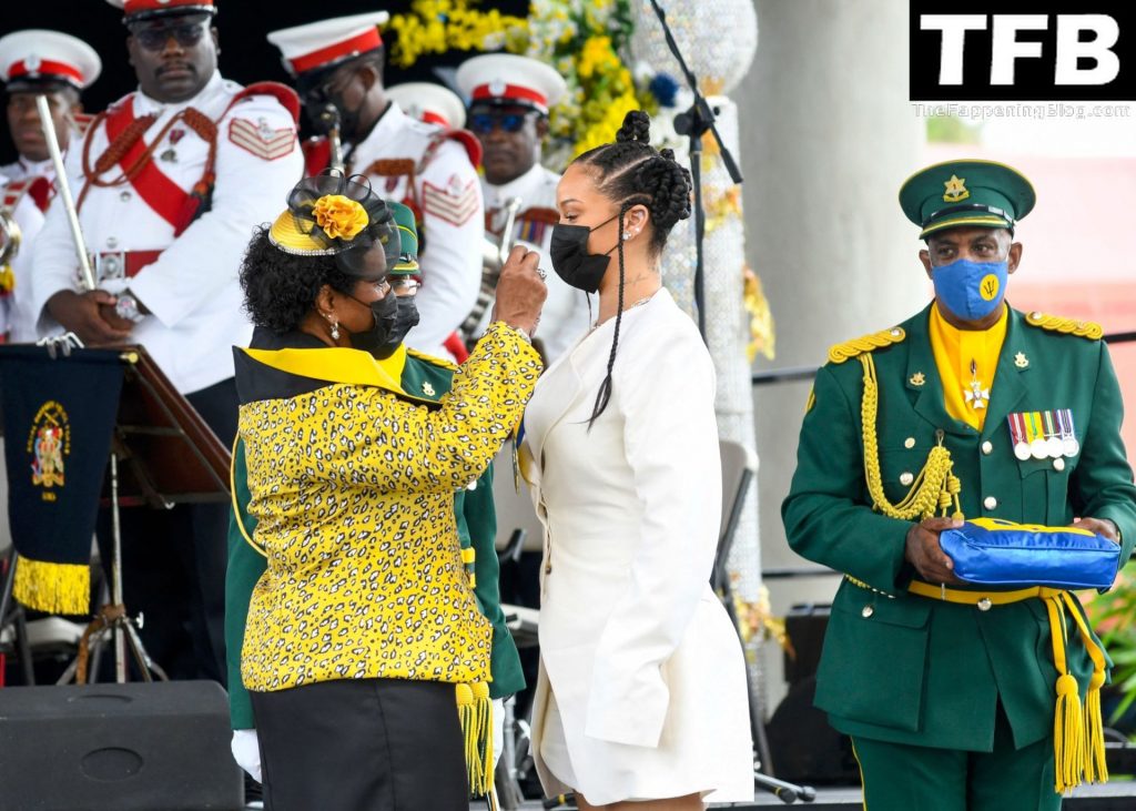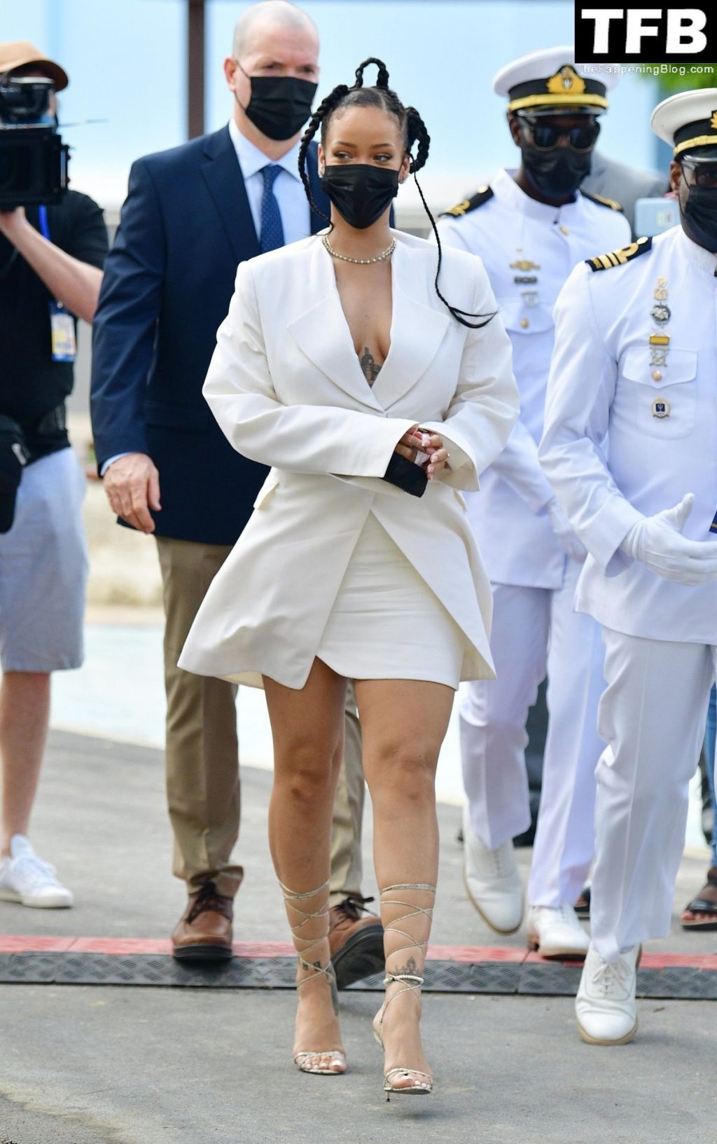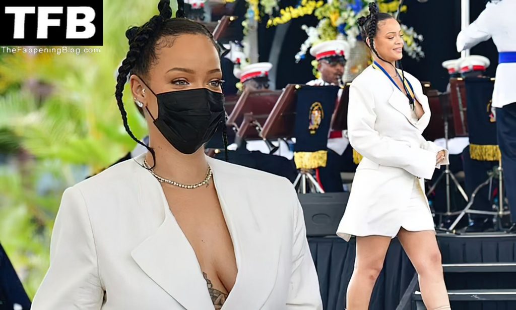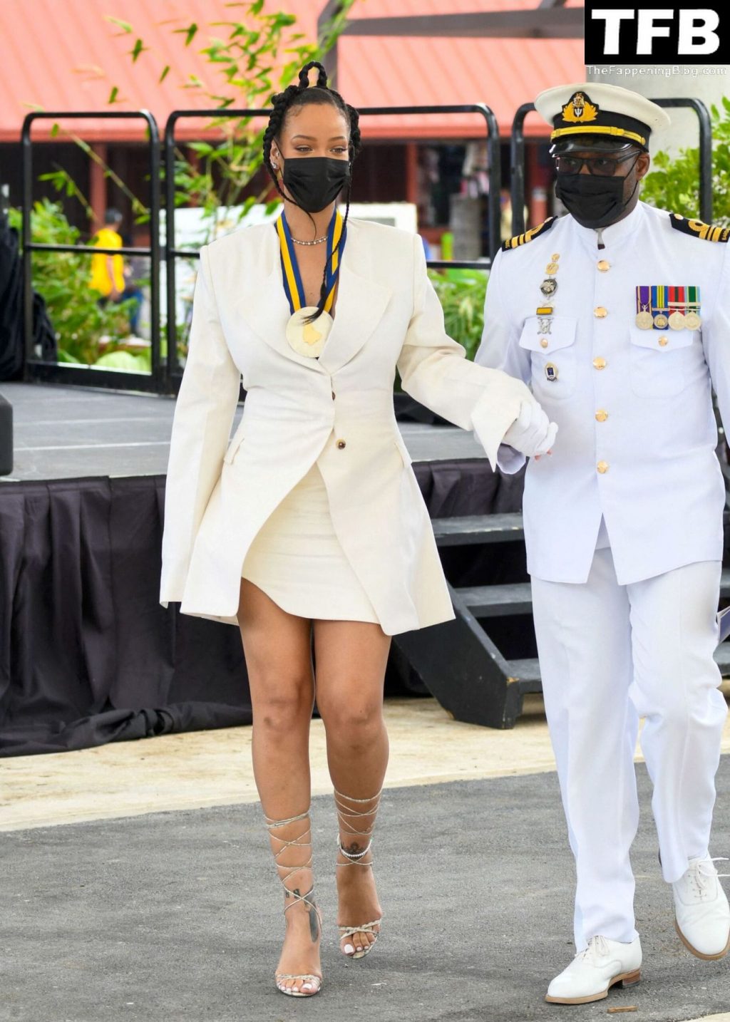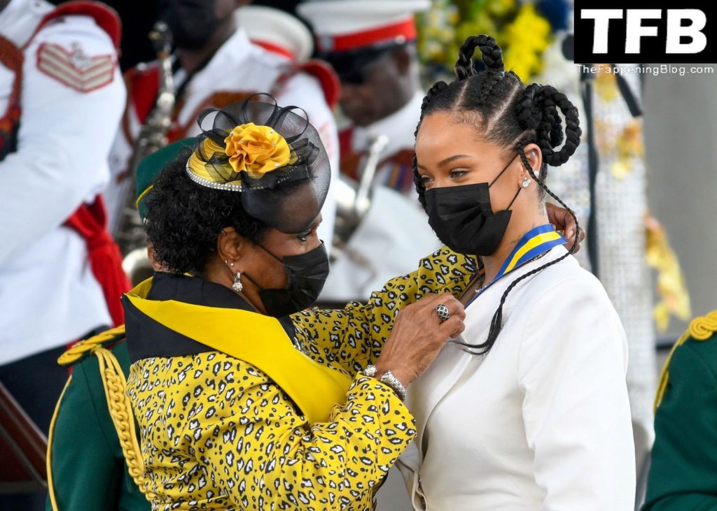 La estrella de The Fappening Rihanna luce impresionante con un mini vestido blanco escotado y blazer mientras acepta su insignia de Héroe Nacional en las celebraciones republicanas de Barbados en Bridgetown, 30/11/2021.