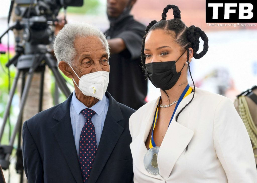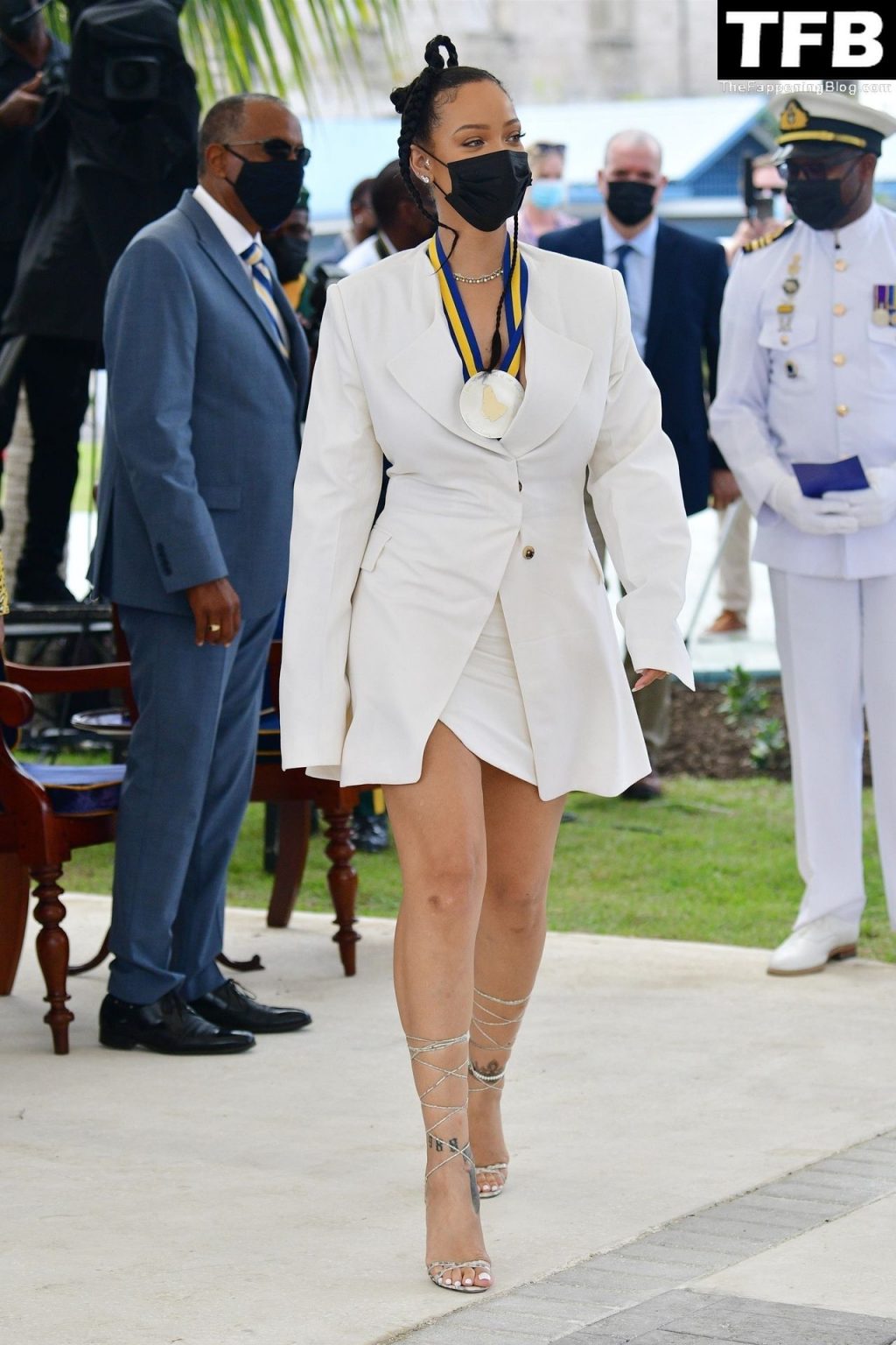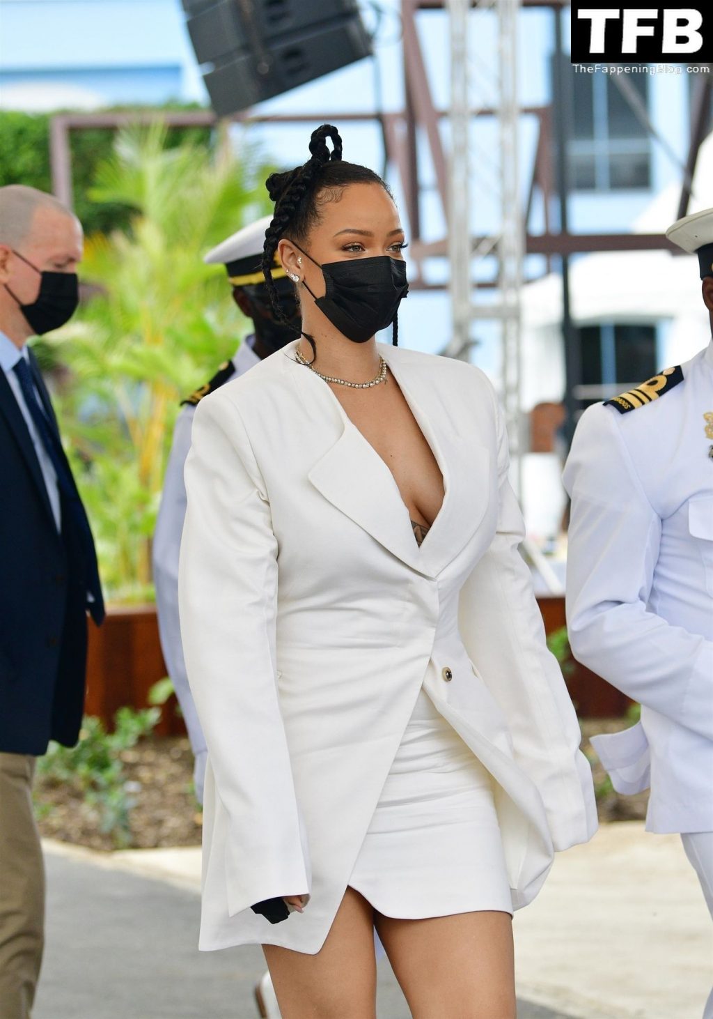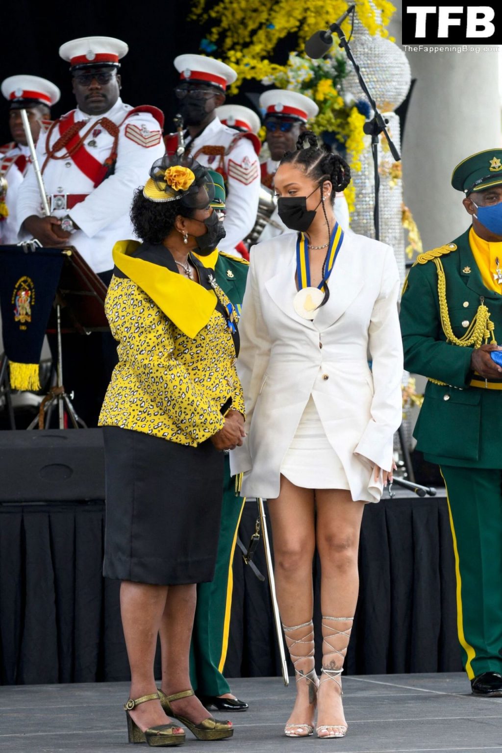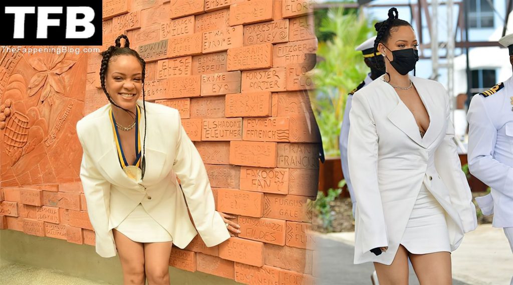 La estrella de The Fappening Rihanna luce impresionante con un mini vestido blanco escotado y blazer mientras acepta su insignia de Héroe Nacional en las celebraciones republicanas de Barbados en Bridgetown, 30/11/2021.