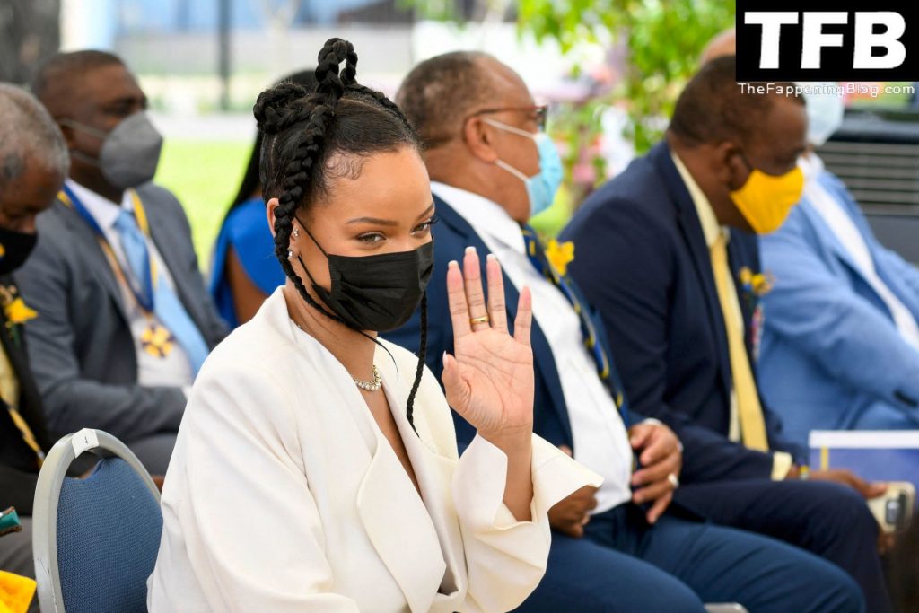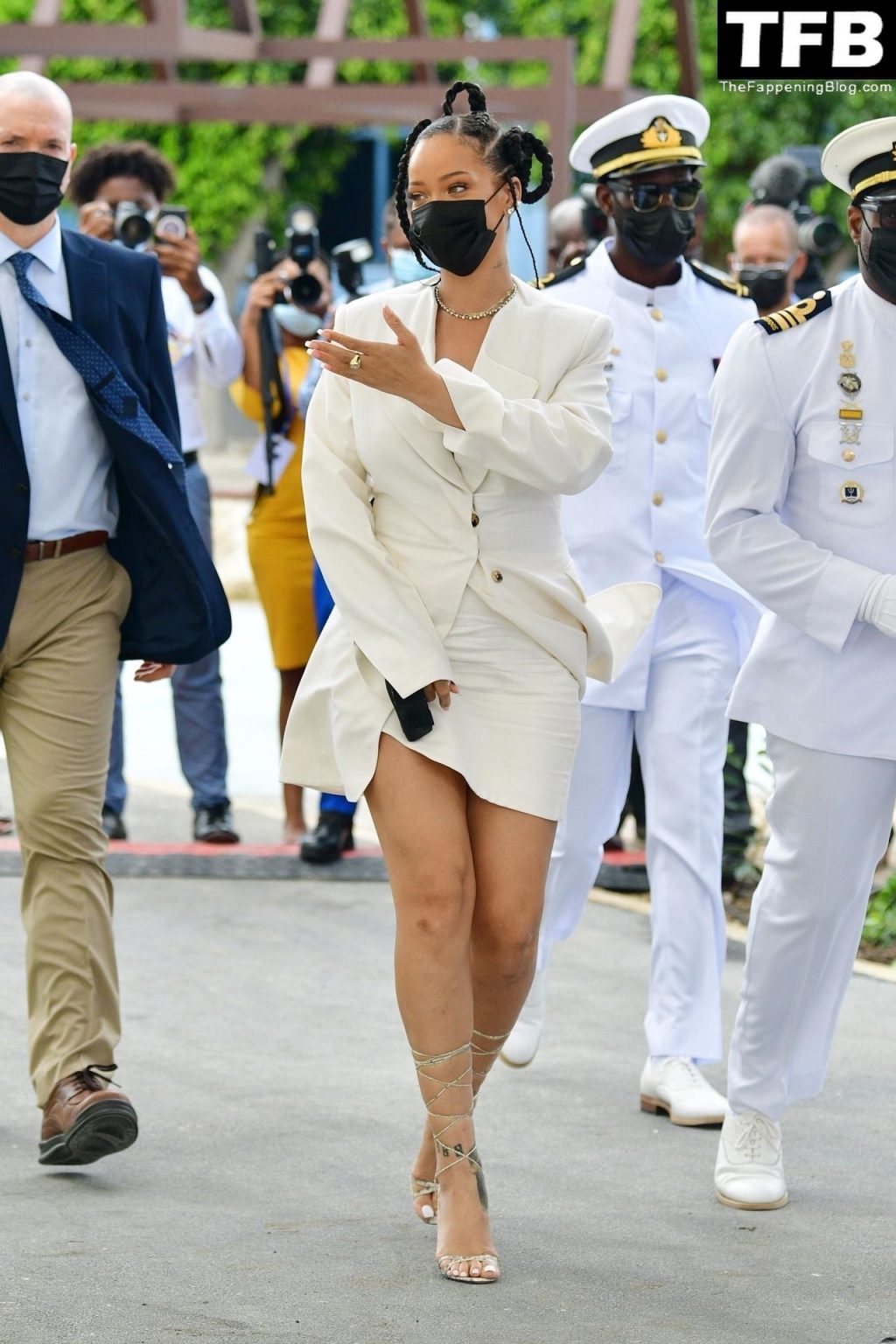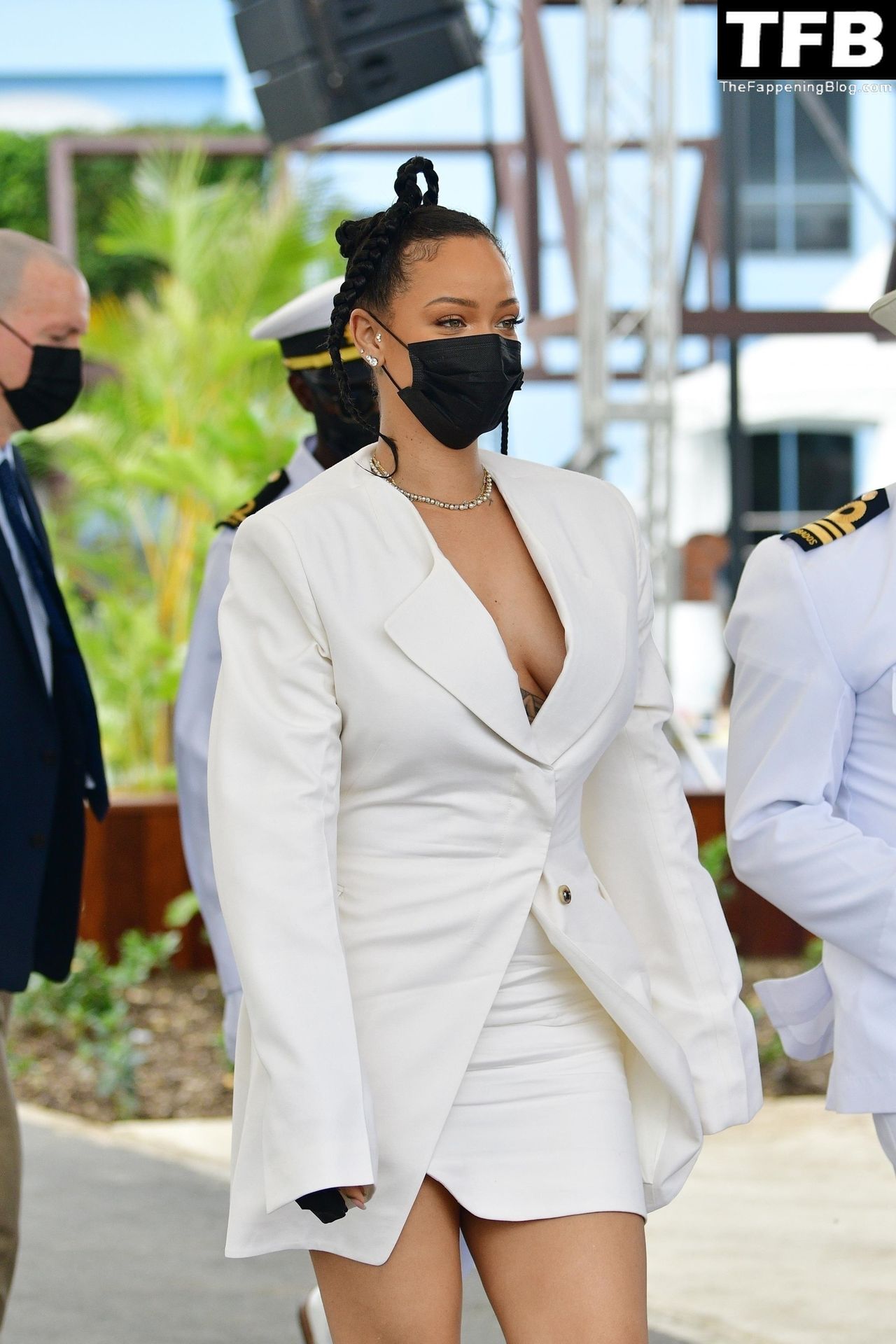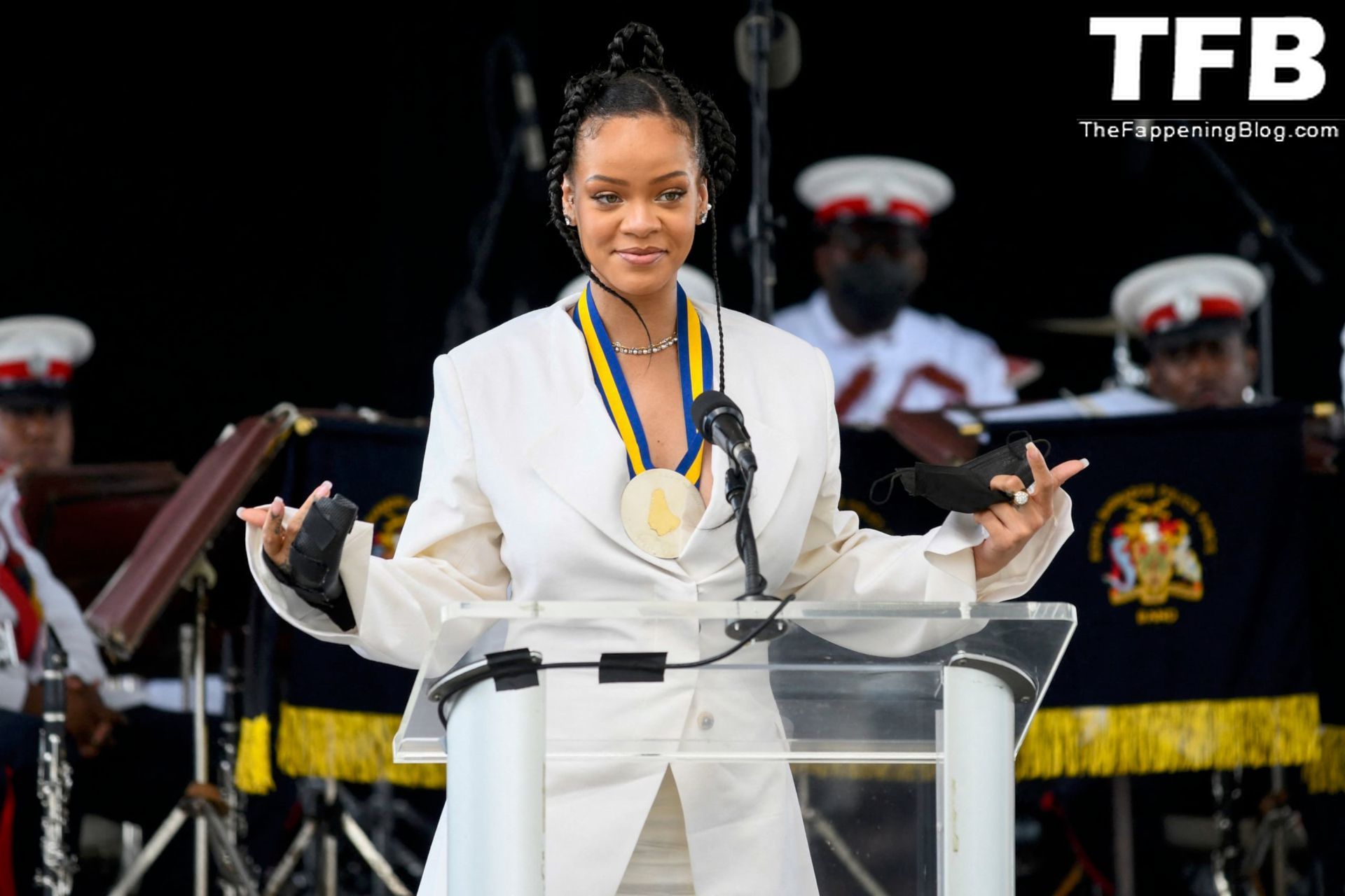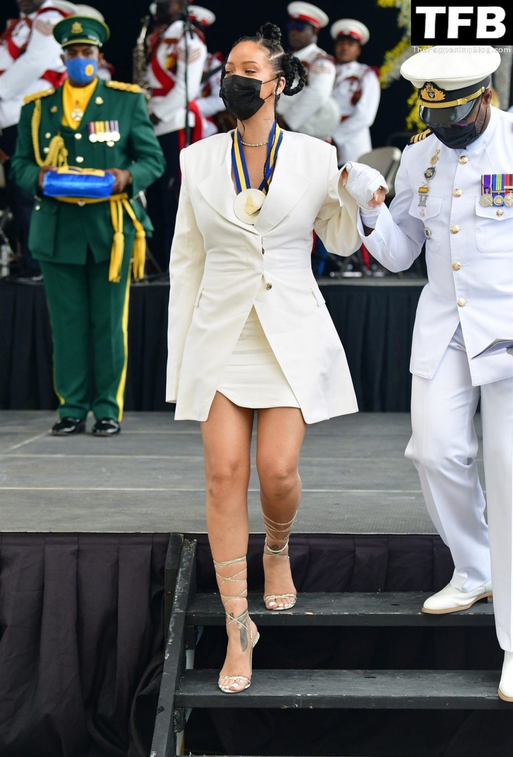 La estrella de The Fappening Rihanna luce impresionante con un mini vestido blanco escotado y blazer mientras acepta su insignia de Héroe Nacional en las celebraciones republicanas de Barbados en Bridgetown, 30/11/2021.