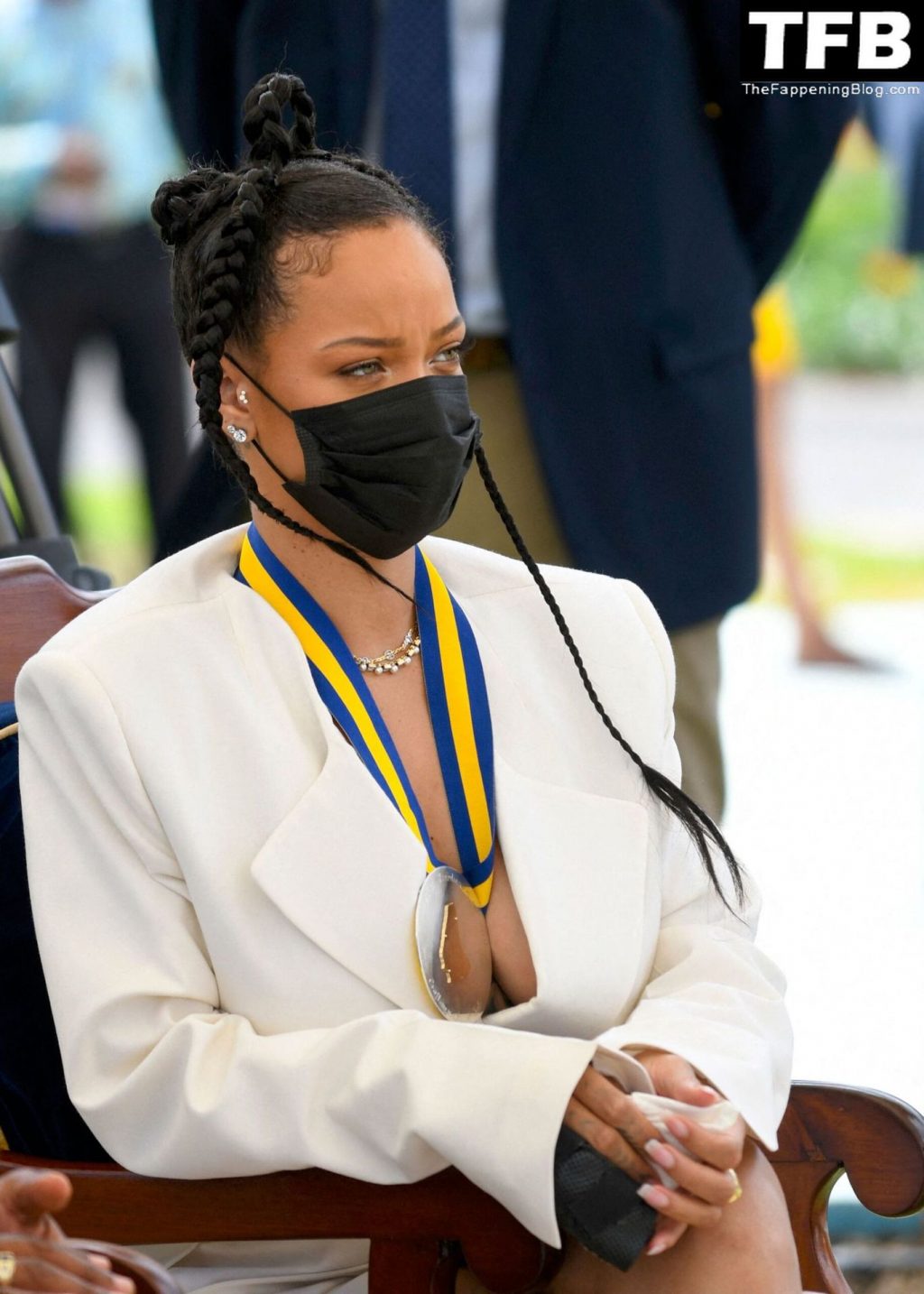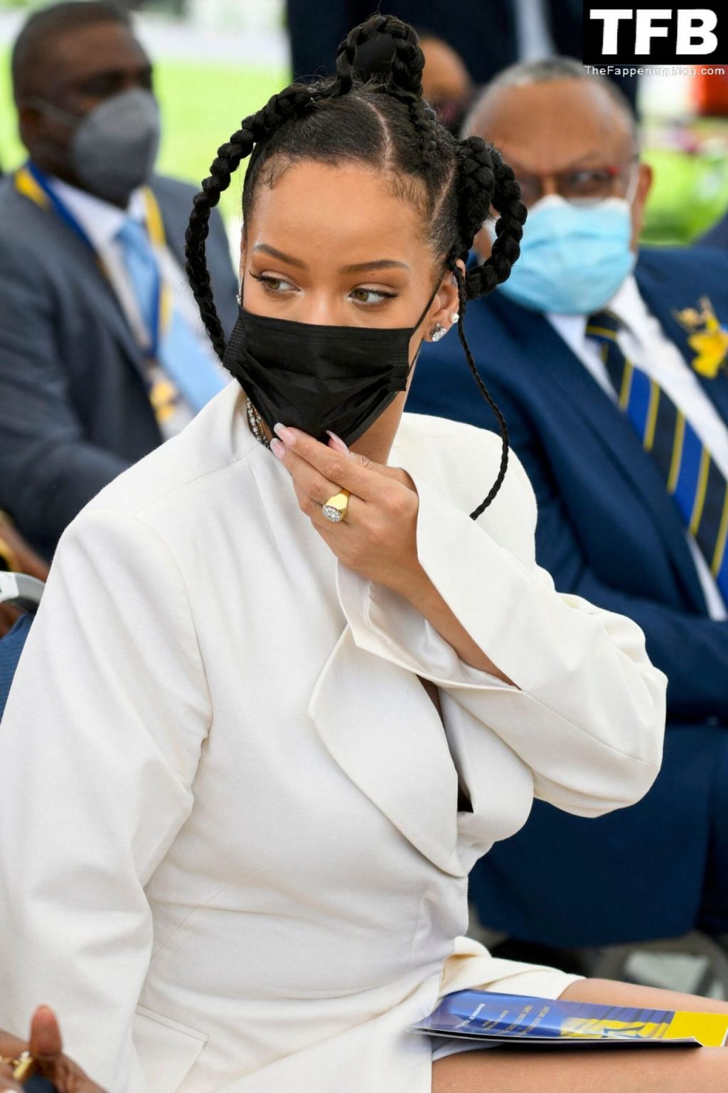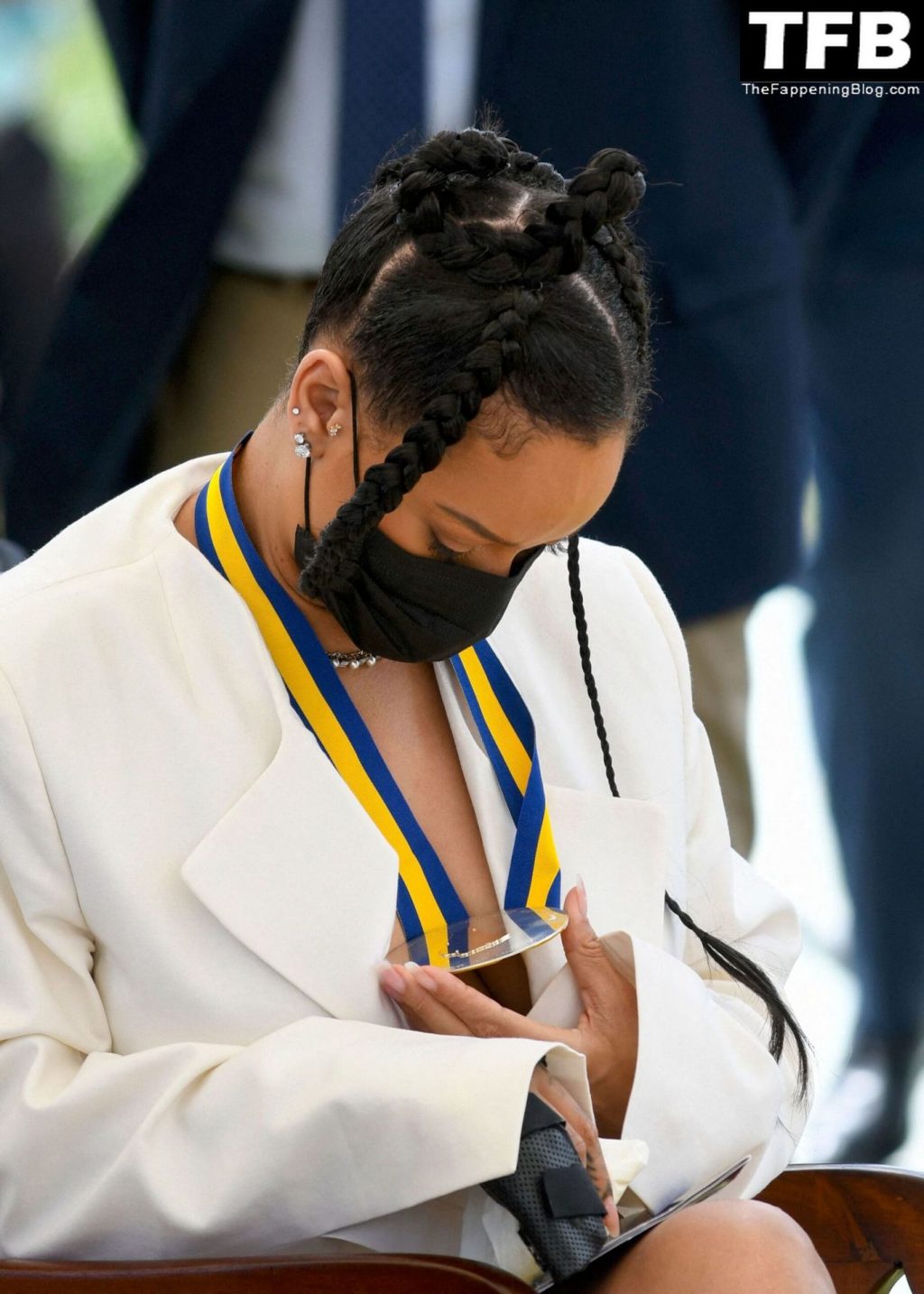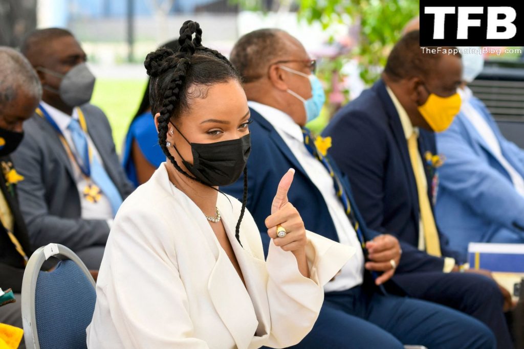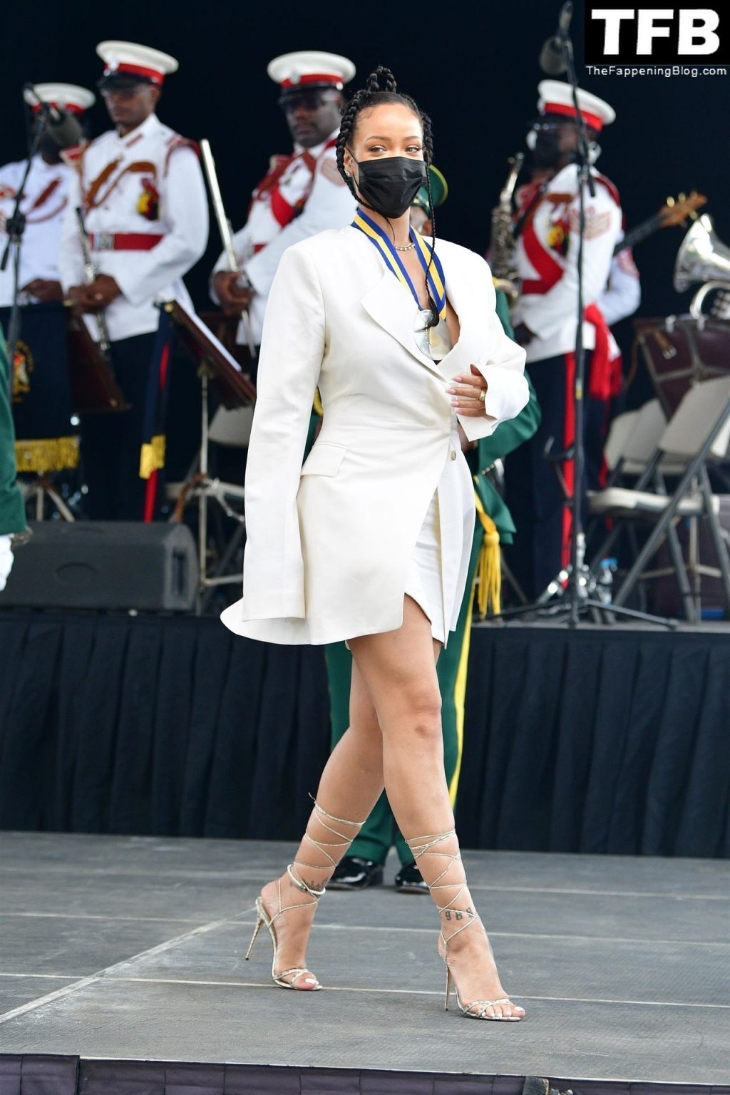 La estrella de The Fappening Rihanna luce impresionante con un mini vestido blanco escotado y blazer mientras acepta su insignia de Héroe Nacional en las celebraciones republicanas de Barbados en Bridgetown, 30/11/2021.