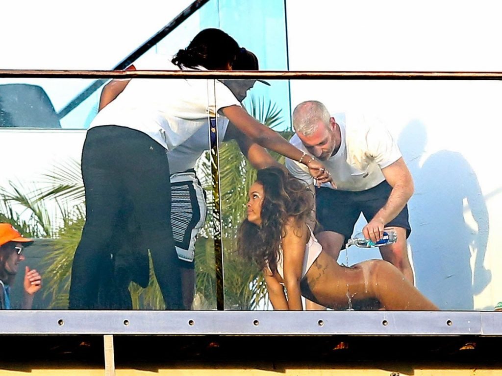 La cantante apareció en la terraza de una lujosa mansión en Hollywood casi desnuda. El pecho de Rihanna estaba al menos ligeramente cubierto con un top corto, y la parte inferior del atuendo estaba a la vista del personal.