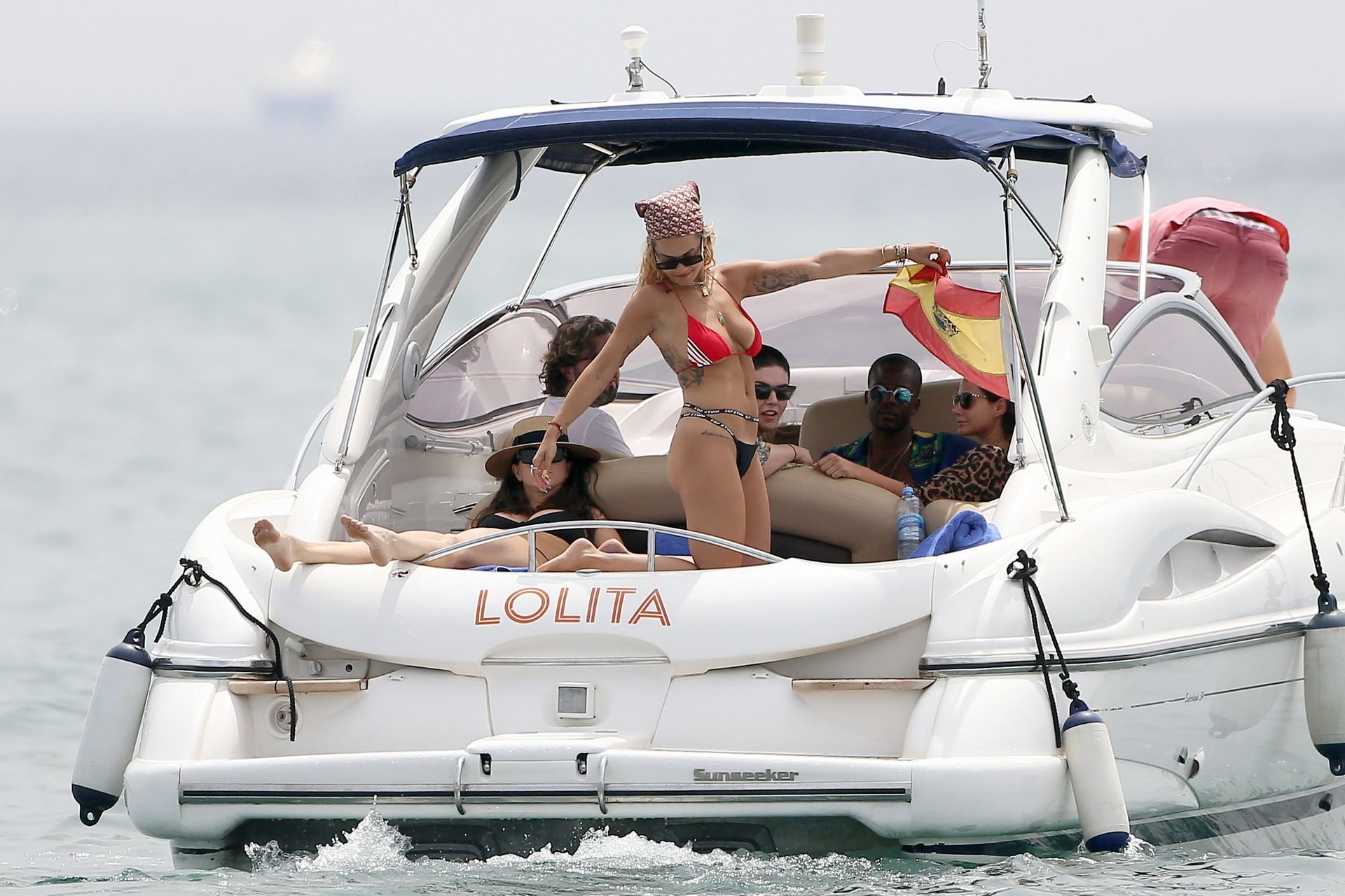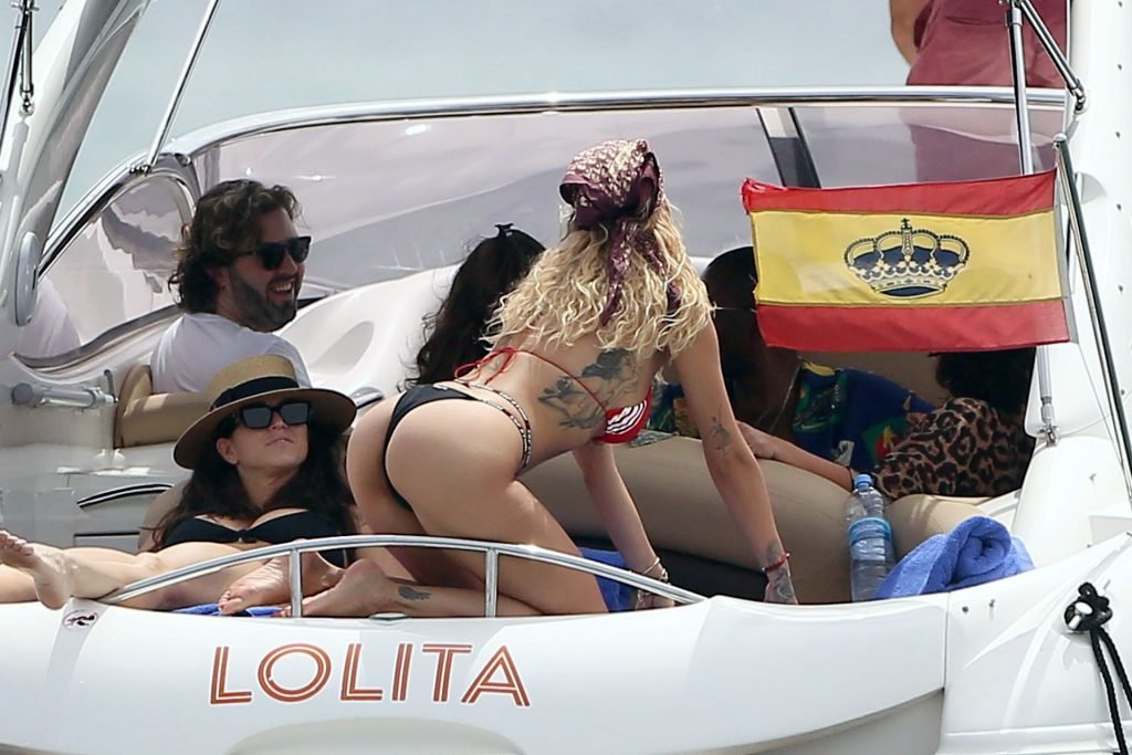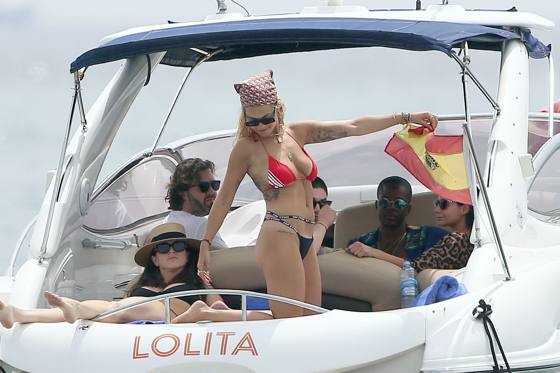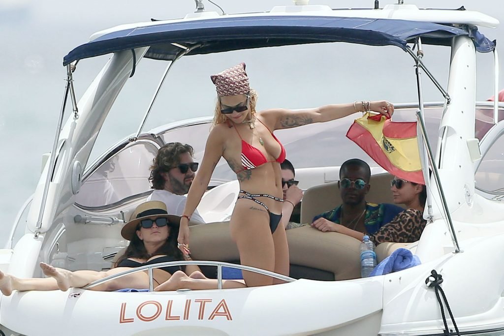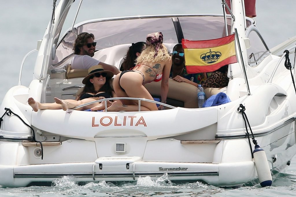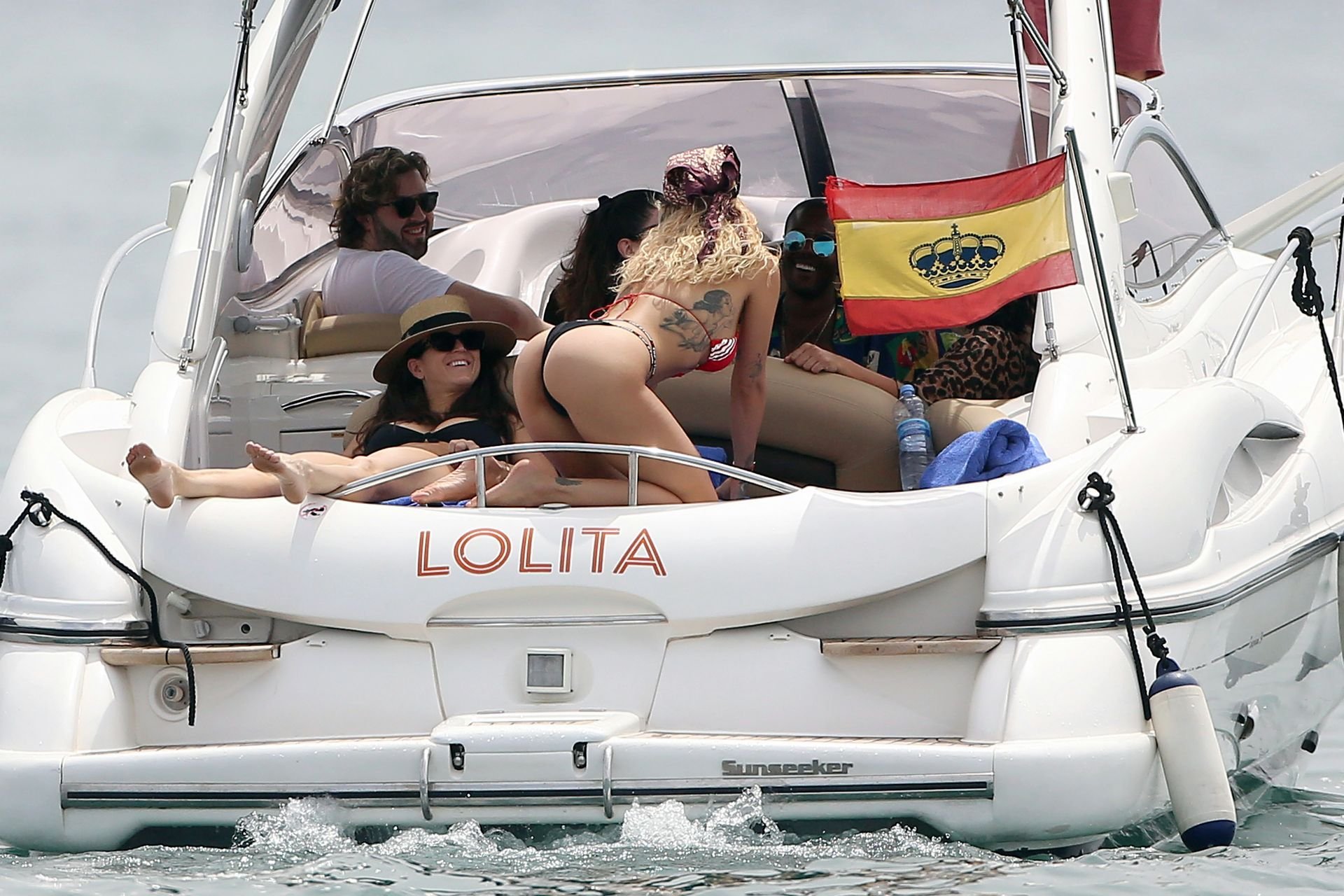 La cantante británica Rita Ora y sus amigos fueron fotografiados en un barco en Ibiza, 07/08/2019. Rita llevaba un pequeño bikini de White Fox mientras posaba con mucha actitud. El barco se llamaba “Lolita”.