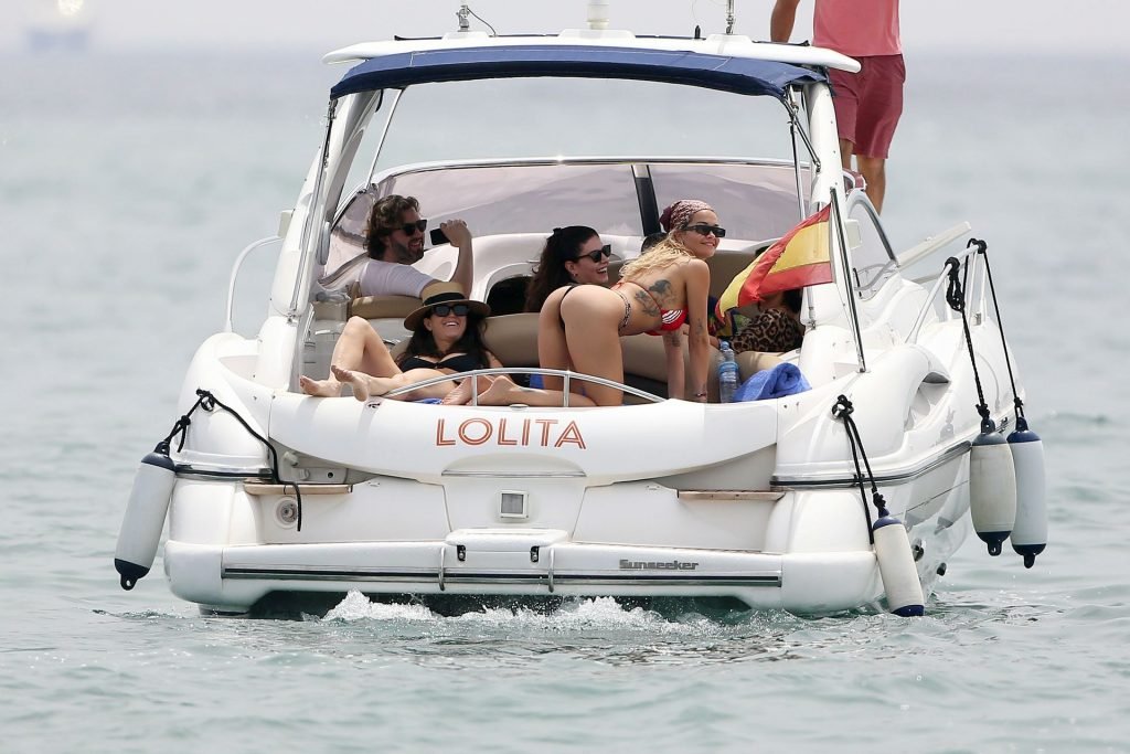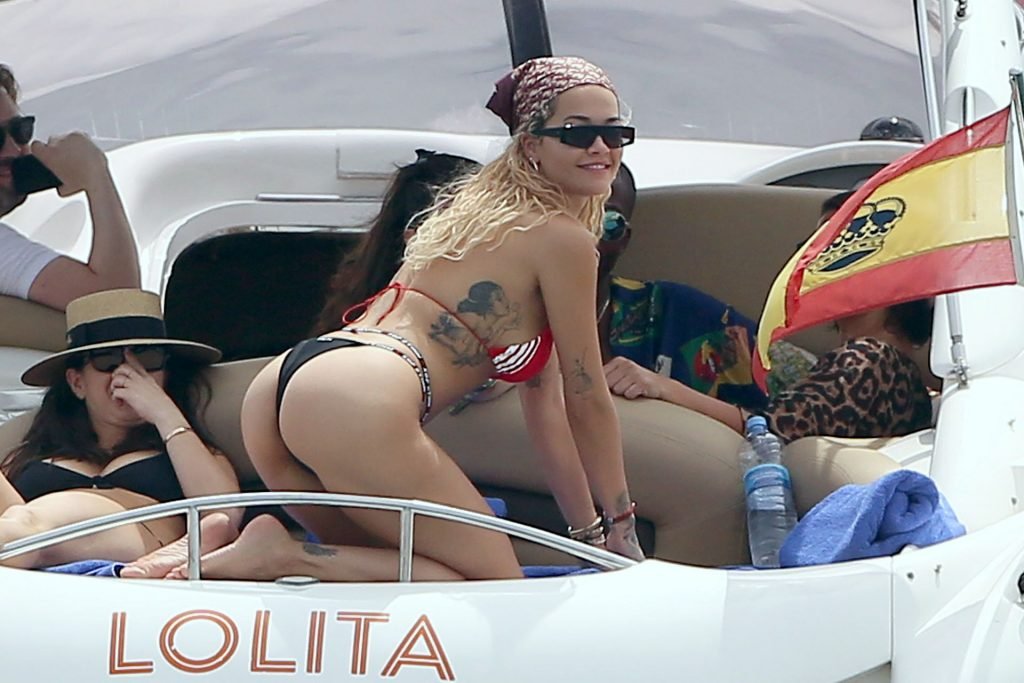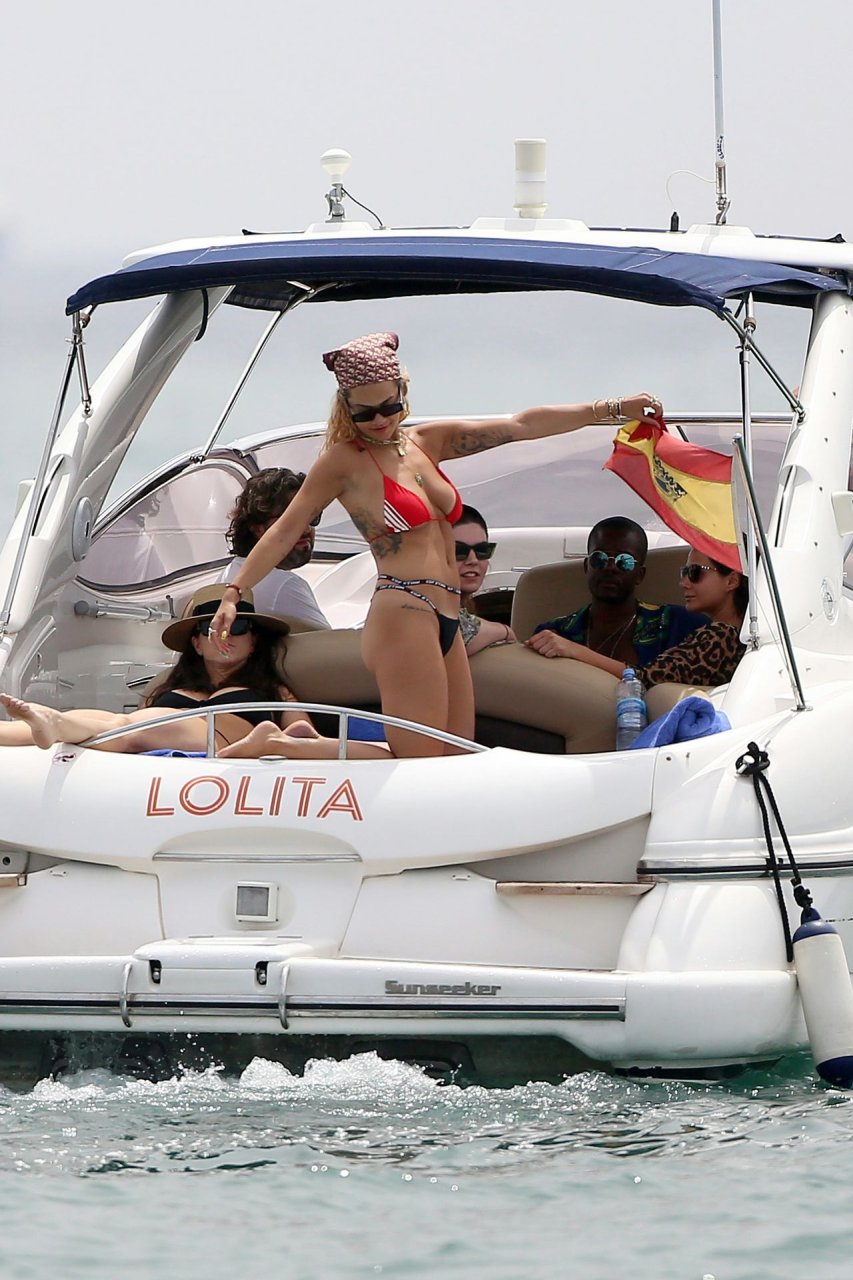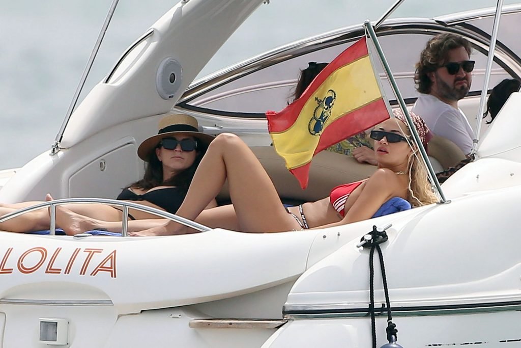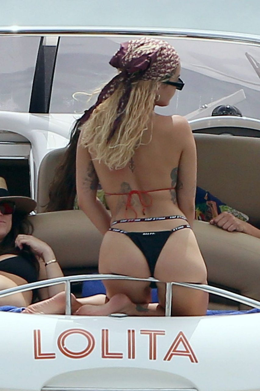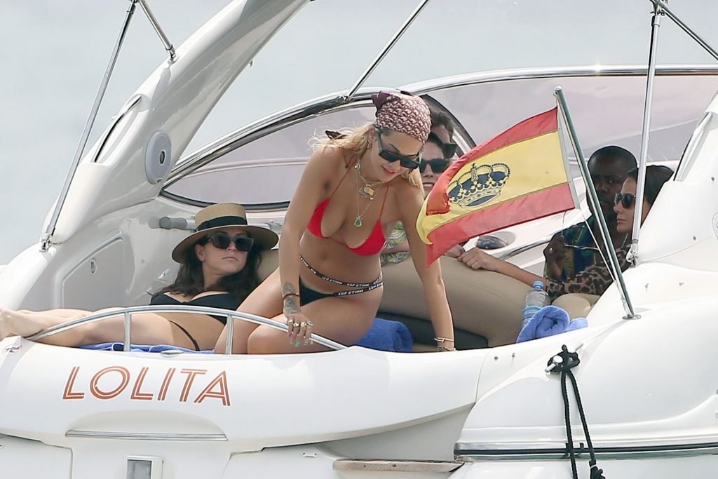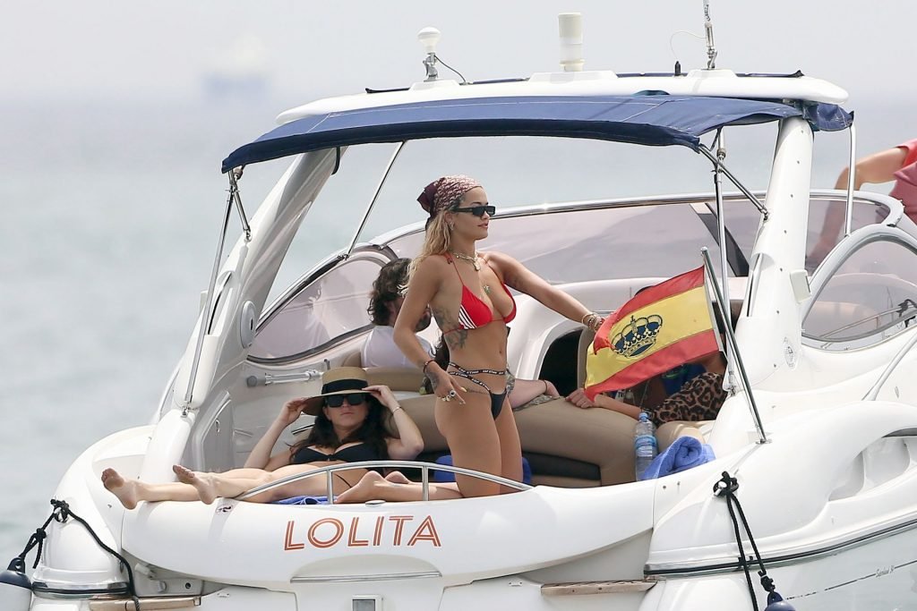 La cantante británica Rita Ora y sus amigos fueron fotografiados en un barco en Ibiza, 07/08/2019. Rita llevaba un pequeño bikini de White Fox mientras posaba con mucha actitud. El barco se llamaba “Lolita”.