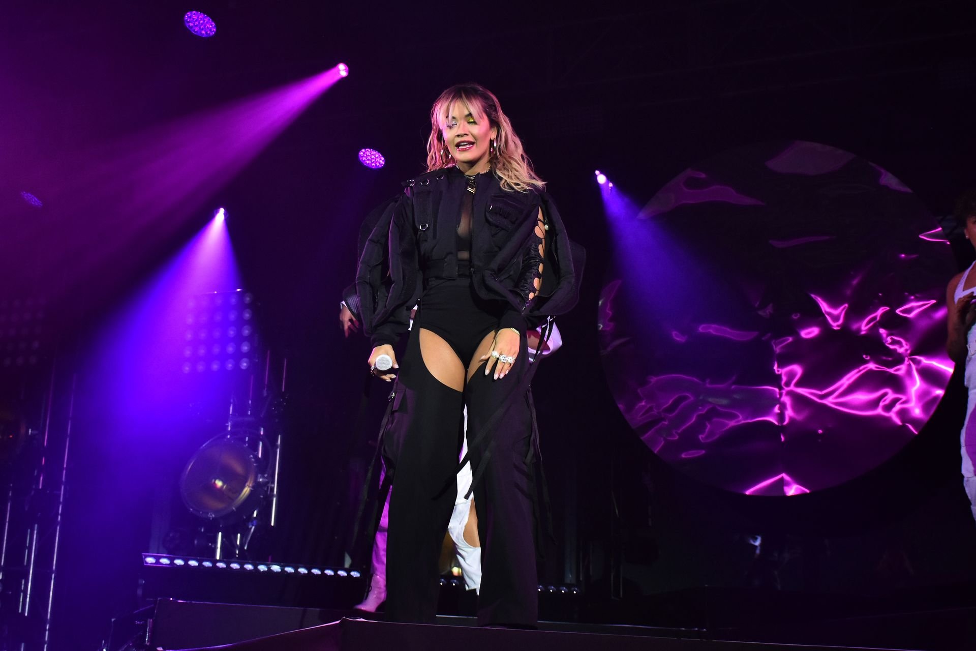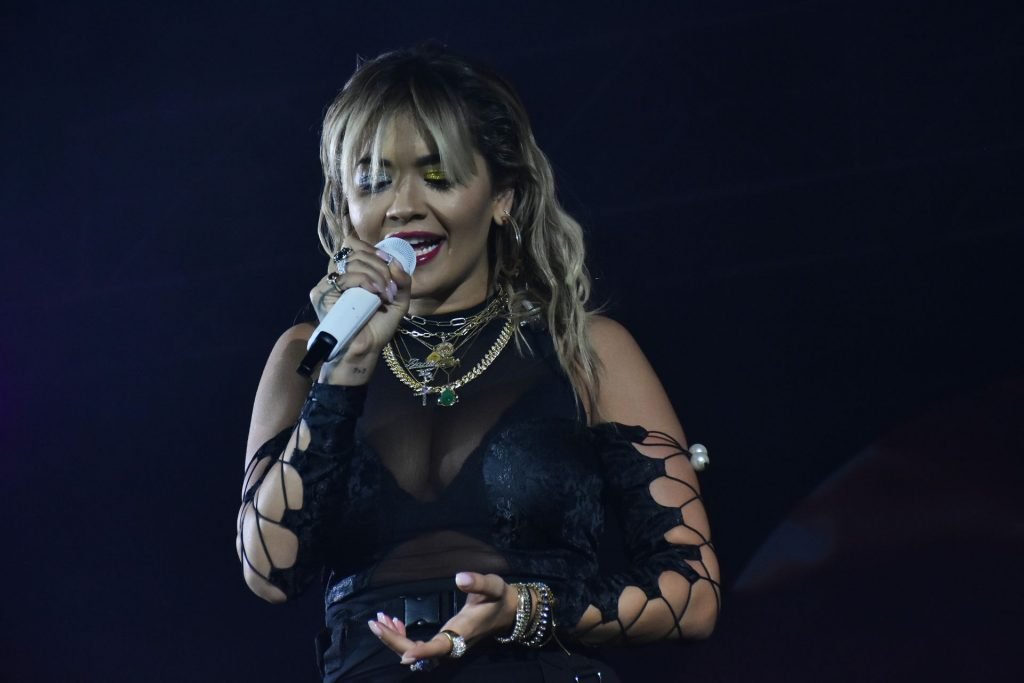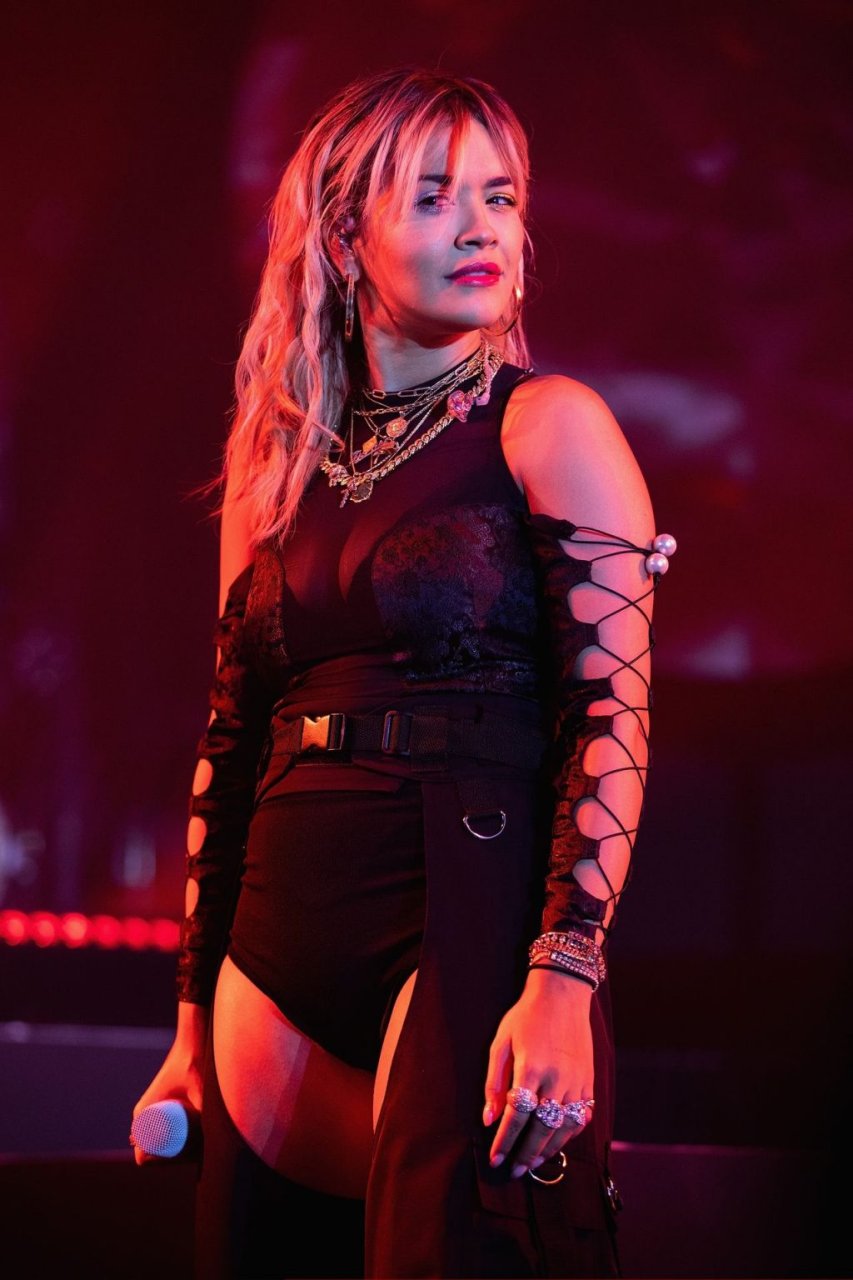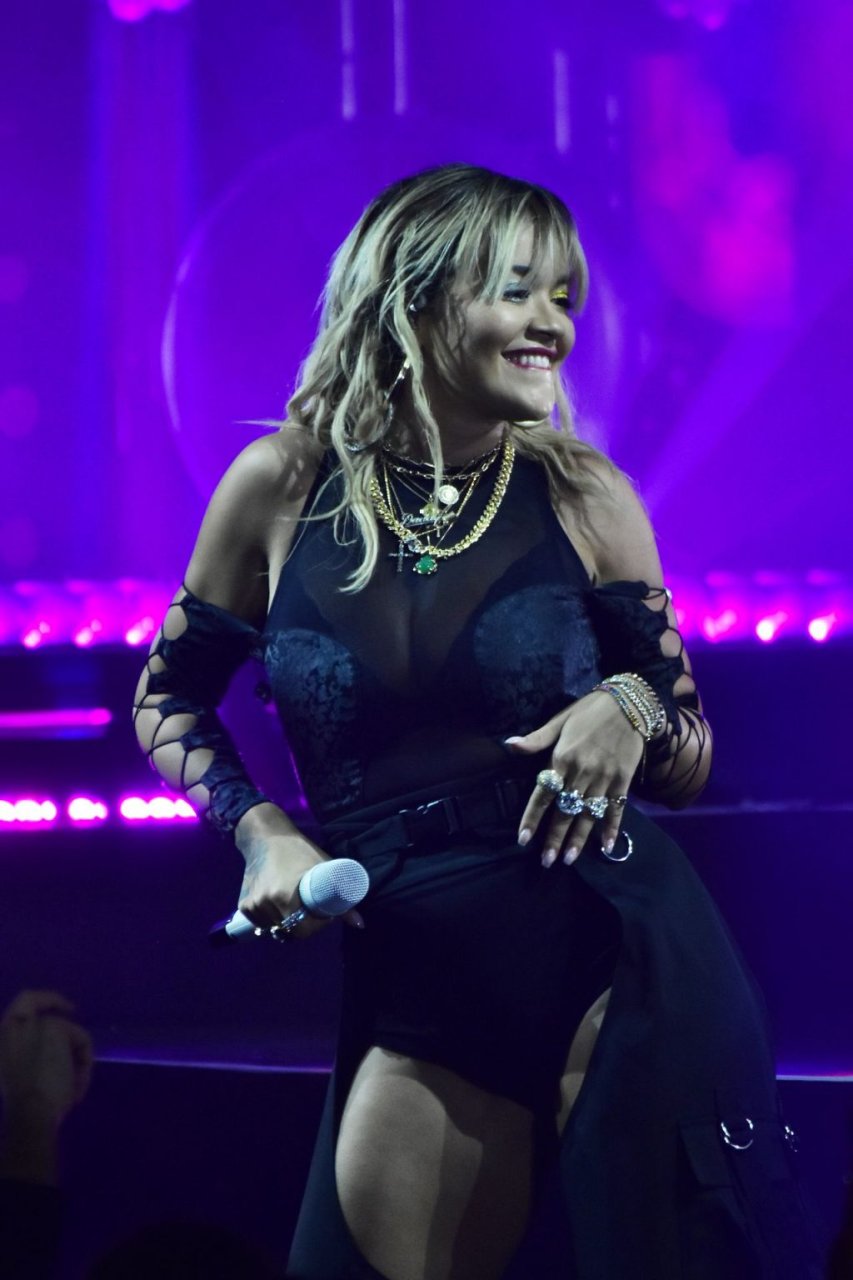 Singer Rita Ora performs at the American Express Gold Launch in Mexico City, 10/17/2019. She showed her cleavage and butt on stage.