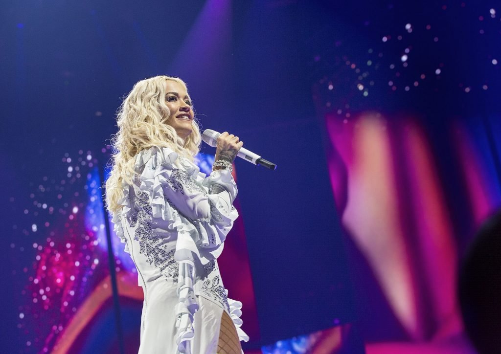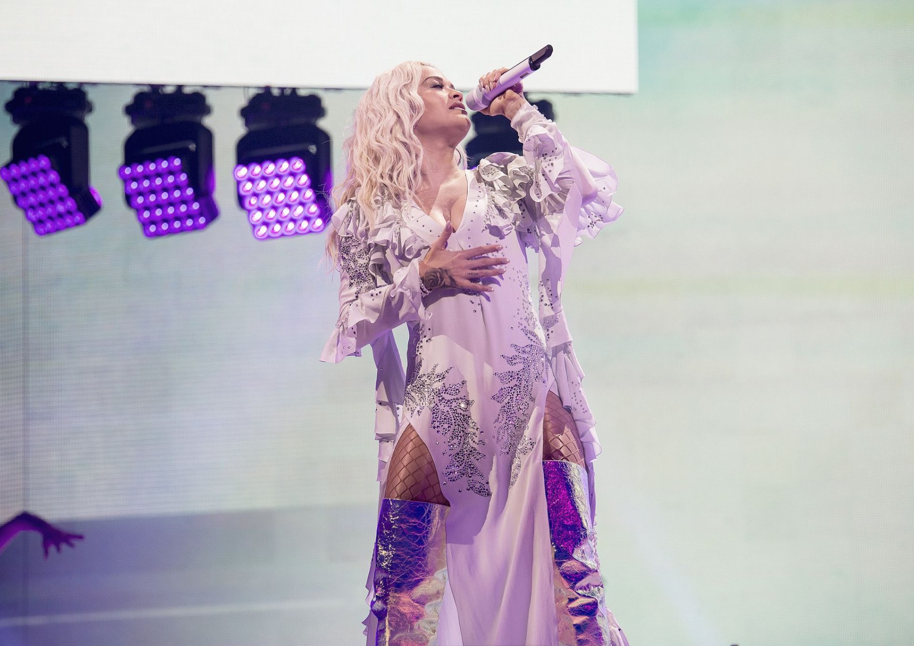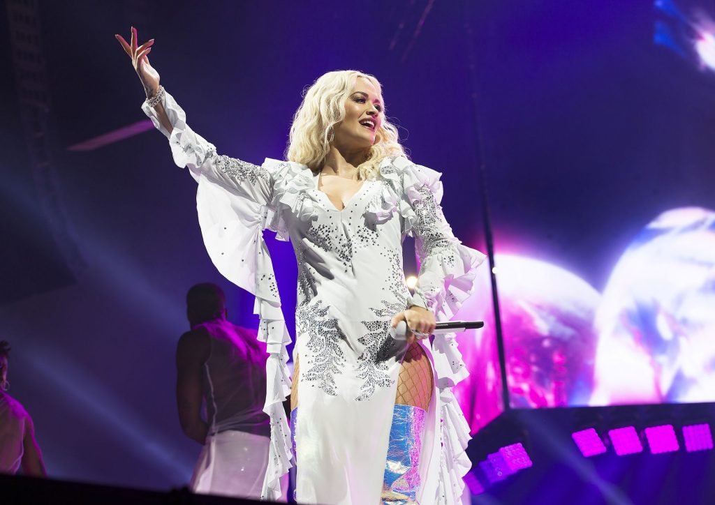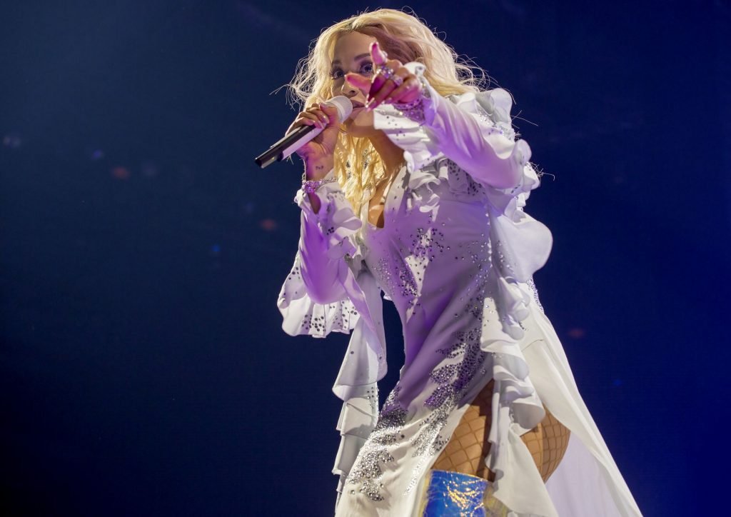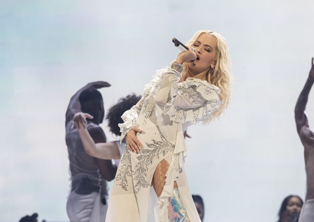 La cantante Rita Ora fue fotografiada en el escenario durante un concierto en vivo en el Liverpool M & S Bank Arena en Liverpool, 28/05/2019.
