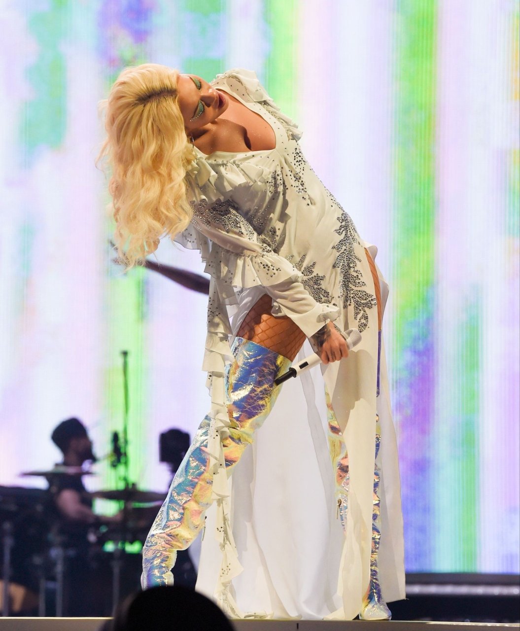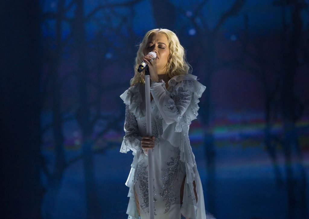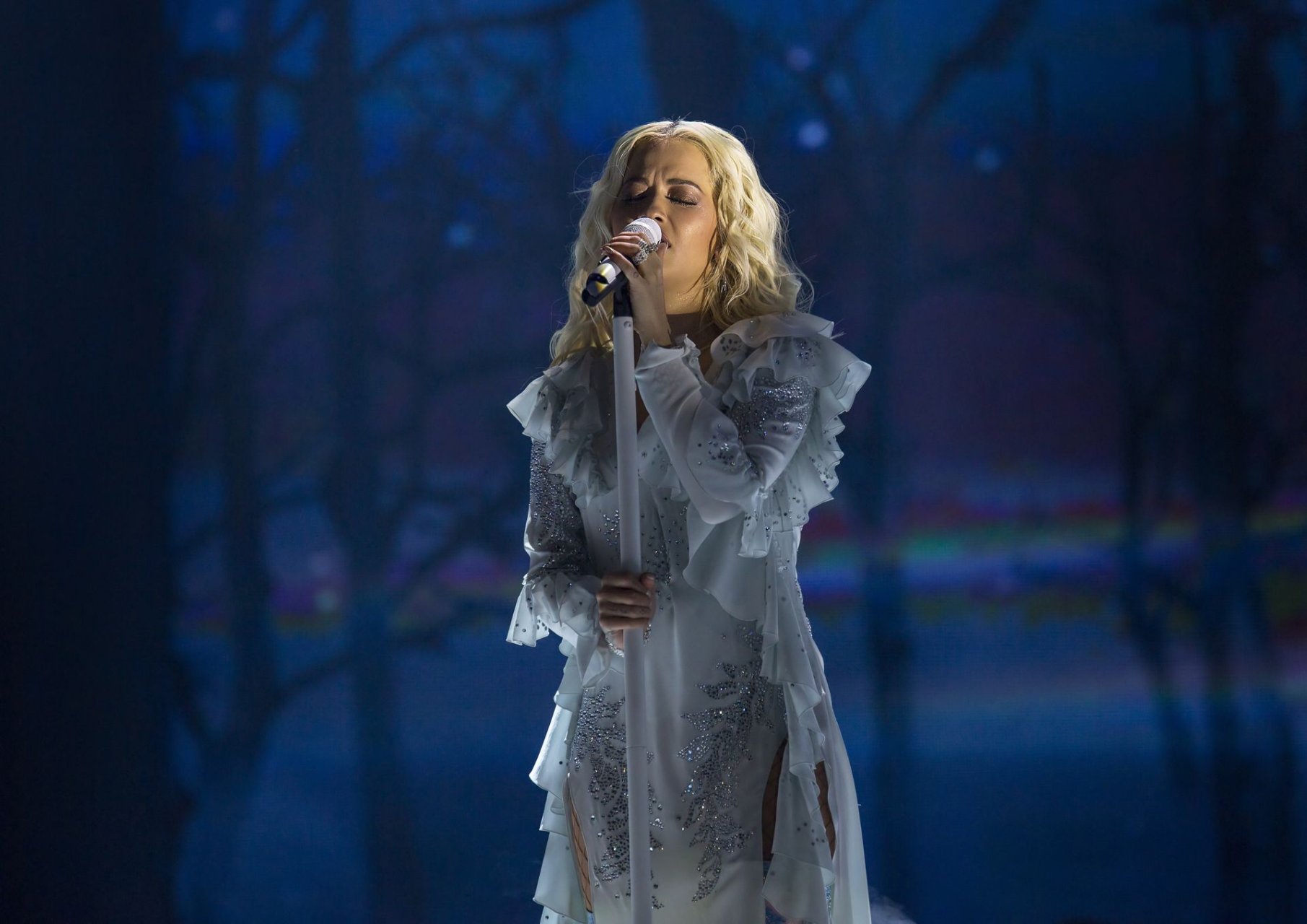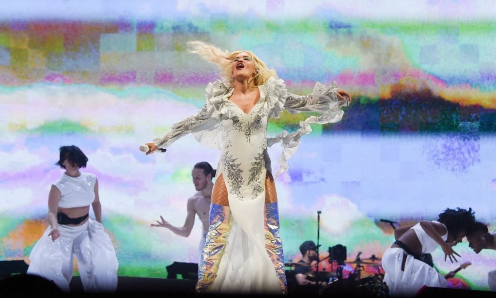 La cantante Rita Ora fue fotografiada en el escenario durante un concierto en vivo en el Liverpool M & S Bank Arena en Liverpool, 28/05/2019.