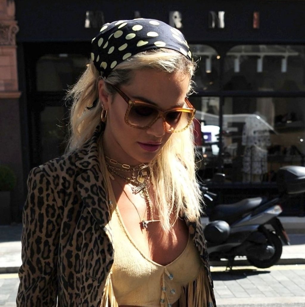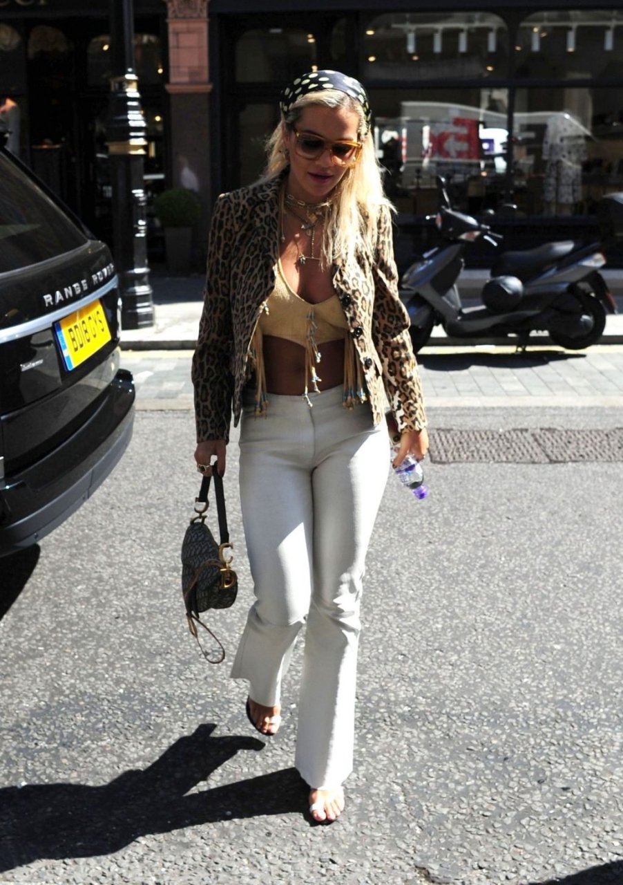 La cantante británica Rita Ora llegó al restaurante Scotts en Londres para comer algo, 07/04/2019. Mostró su top de bikini mientras hacía diligencias con su amiga Vas J Morgan.