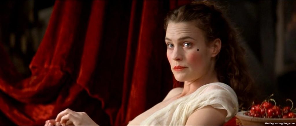 Robin Wright is reclined as she poses for an artist, her right breast in view as she is only partially wrapped in some fabric. She eats from a bowl of cherries while talking to a guy.