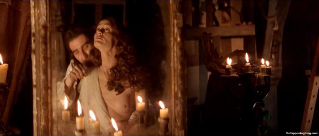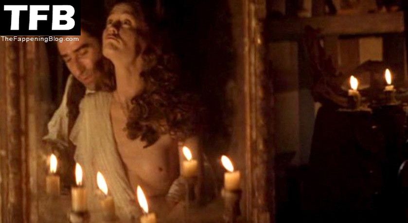 Wright is sitting in front of a mirror with her left breast in view as a guy sits behind her. We then see more of her left breast and her pregnant belly while she reclines on her side, and finally lies on her back next to the guy in bed.