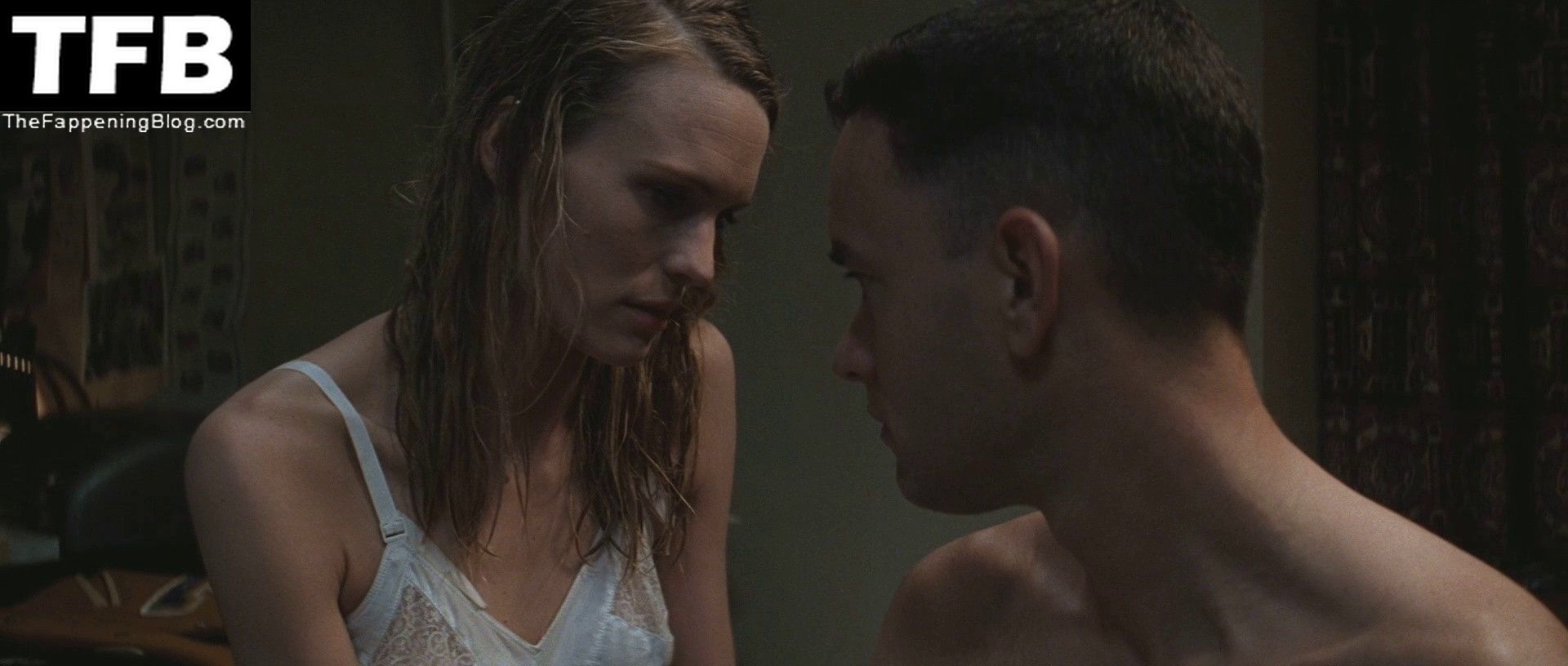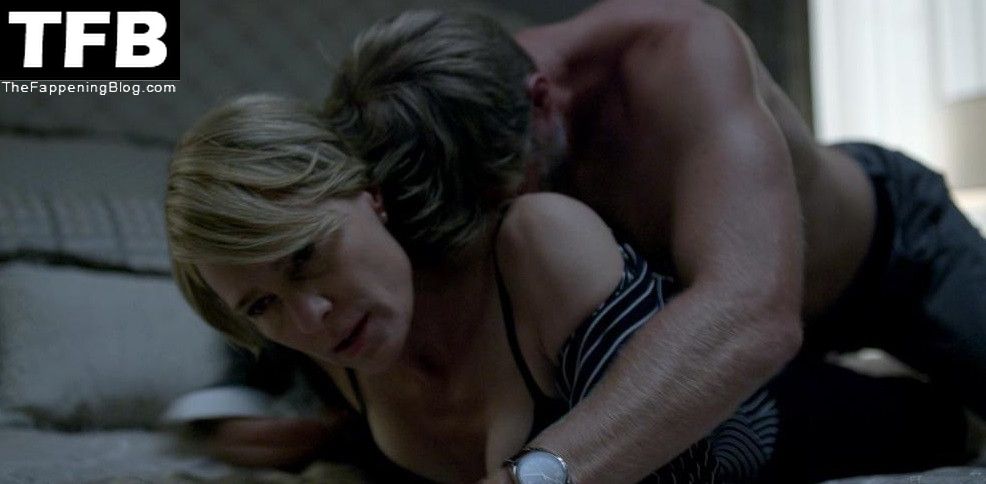 Robin Wright is leaning back against a wall as a guy unbuttons her shirt and gives us a close-up look at her breasts, which he kisses. The guy then stands up and she wraps her legs around him as they begin to have sex standing.