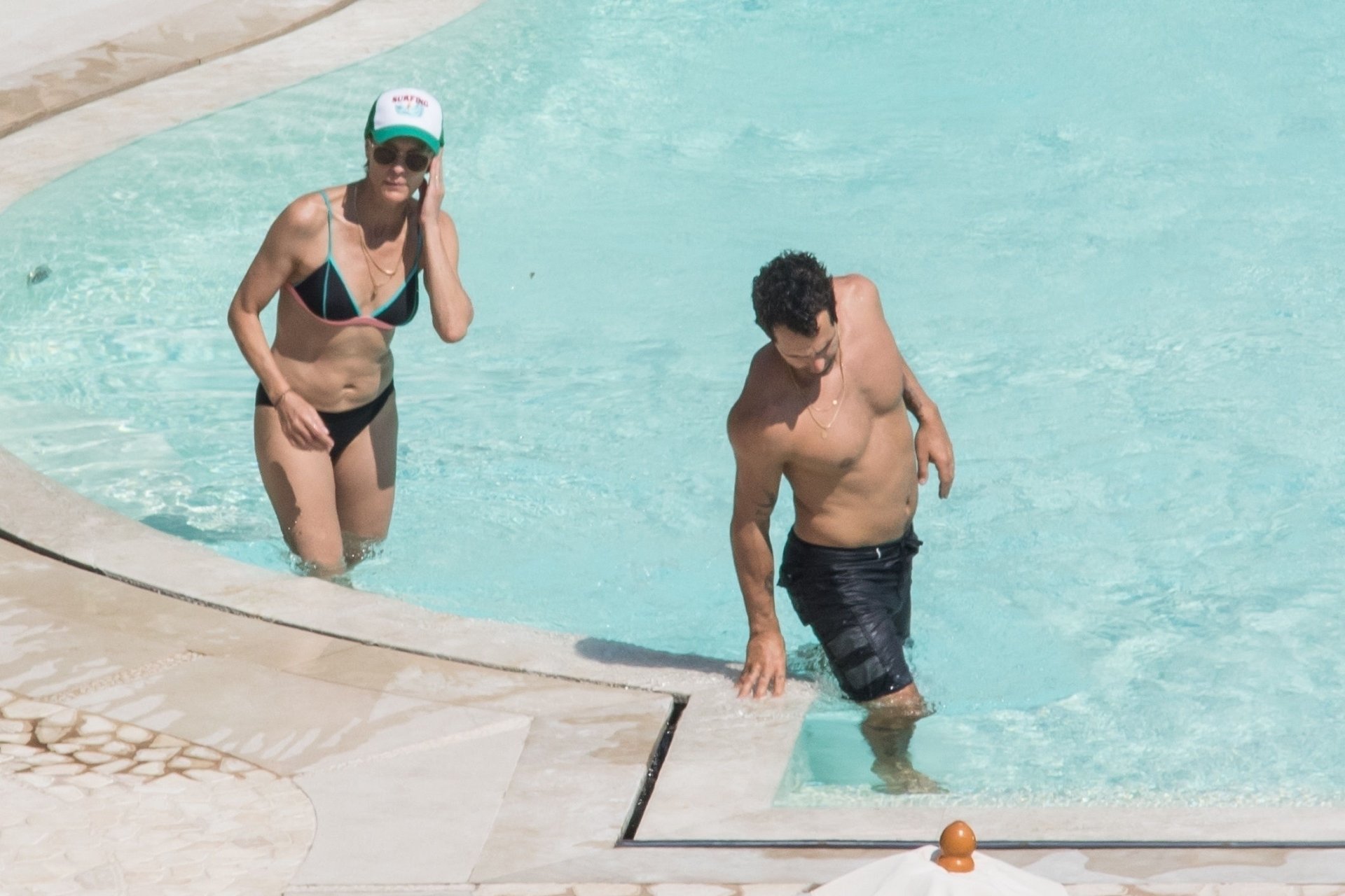 La actriz estadounidense enamorada Robin Wright y su novio Clement Giraudet están junto a la piscina en su resort y muestran muestras públicas de afecto durante sus vacaciones en Positano, 25/07/2018.