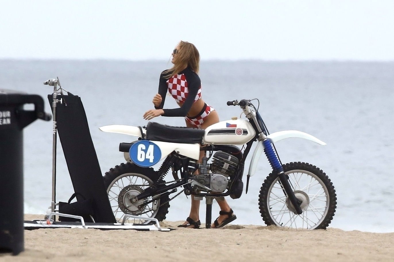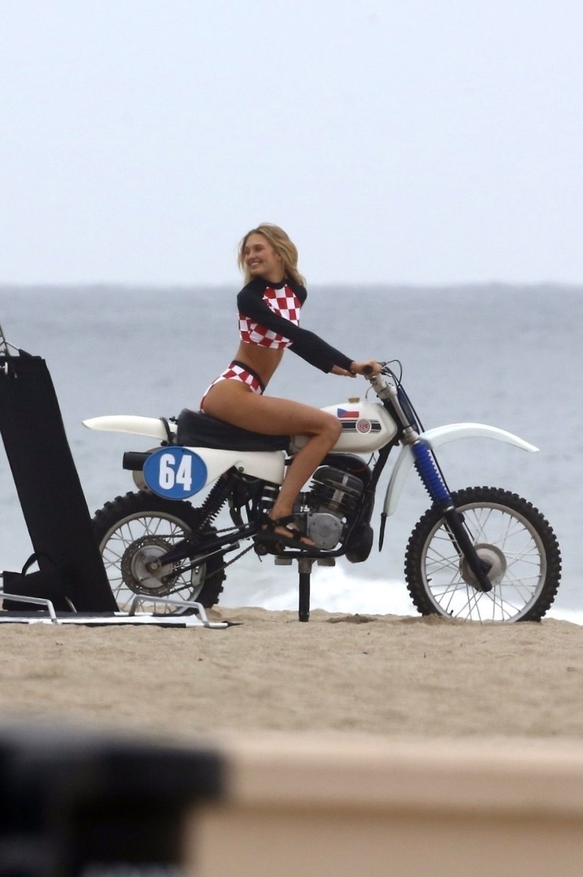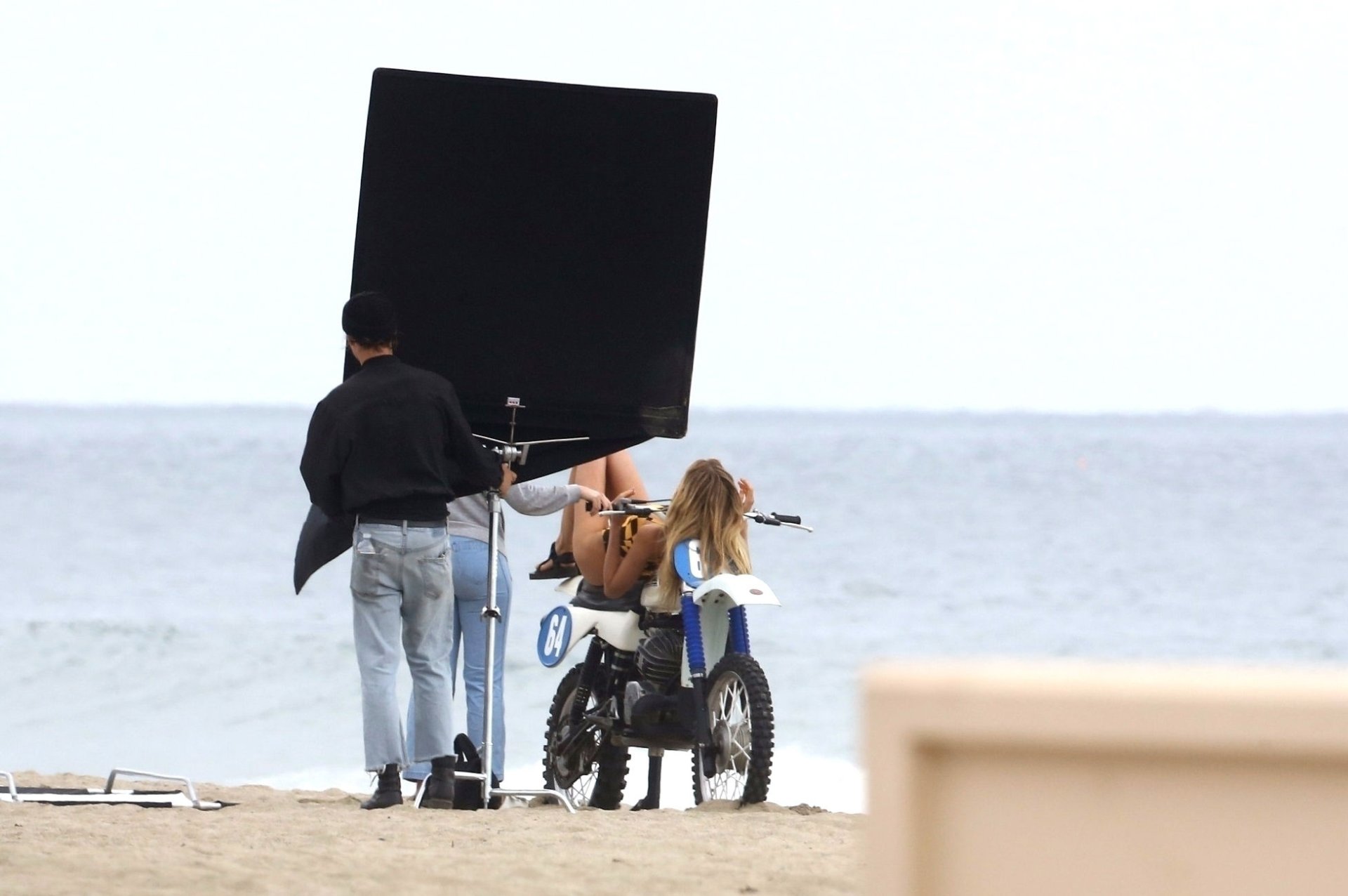 La modelo holandesa Romee Strijd (22) muestra sus largas piernas en la playa para una sesión de fotos en Malibu, 13/05/2018. Romee lucía un par de calcetas hasta el muslo, una camiseta teñida y una parte inferior de bikini blanca para la sesión de fotos.