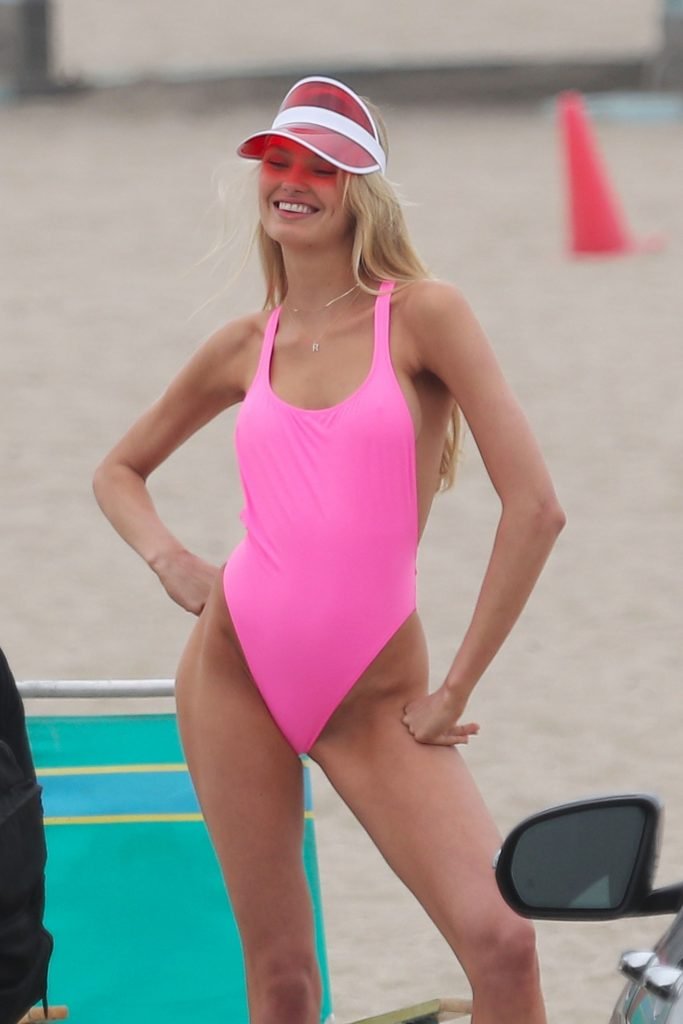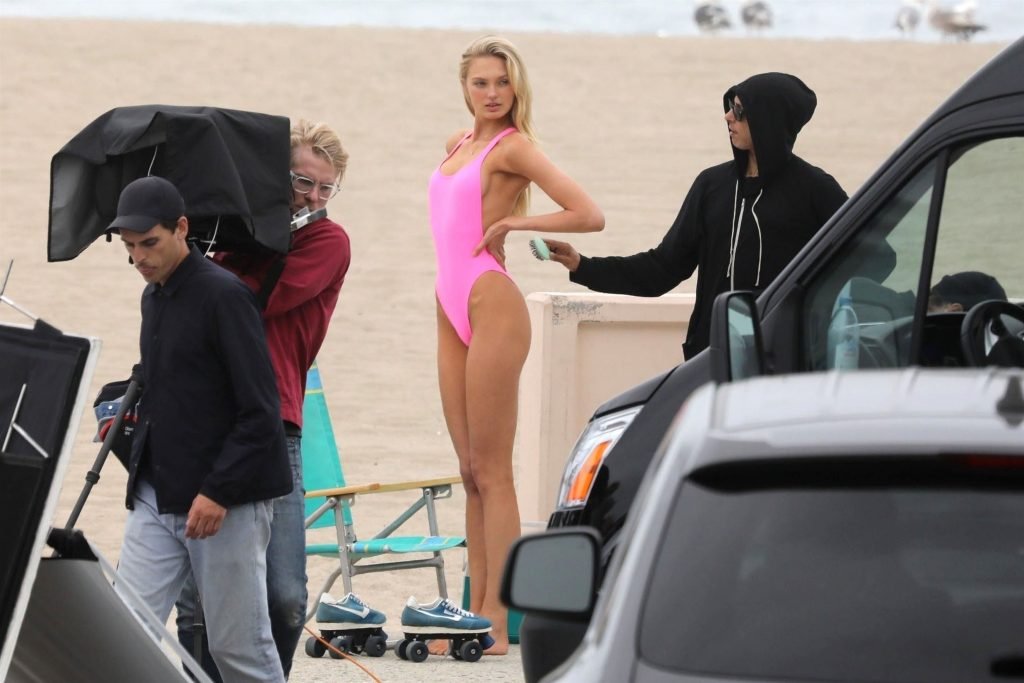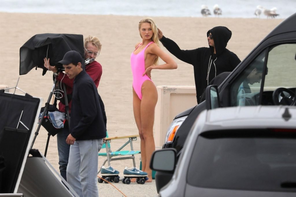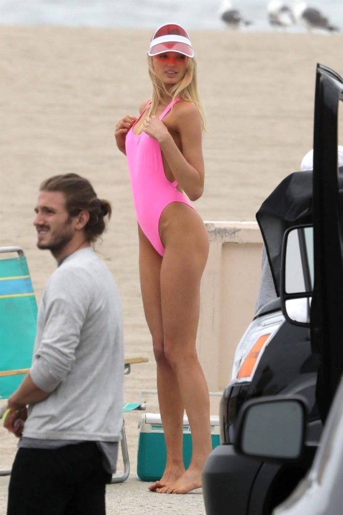 Modelo neerlandesa, el Ángel de Victoria’s Secret Romee Van Strijd (22) posa en la playa para una sesión de fotos en Malibu, 13/05/2018. Romee mostraba su cuerpo tonificado con un traje de baño rosa.