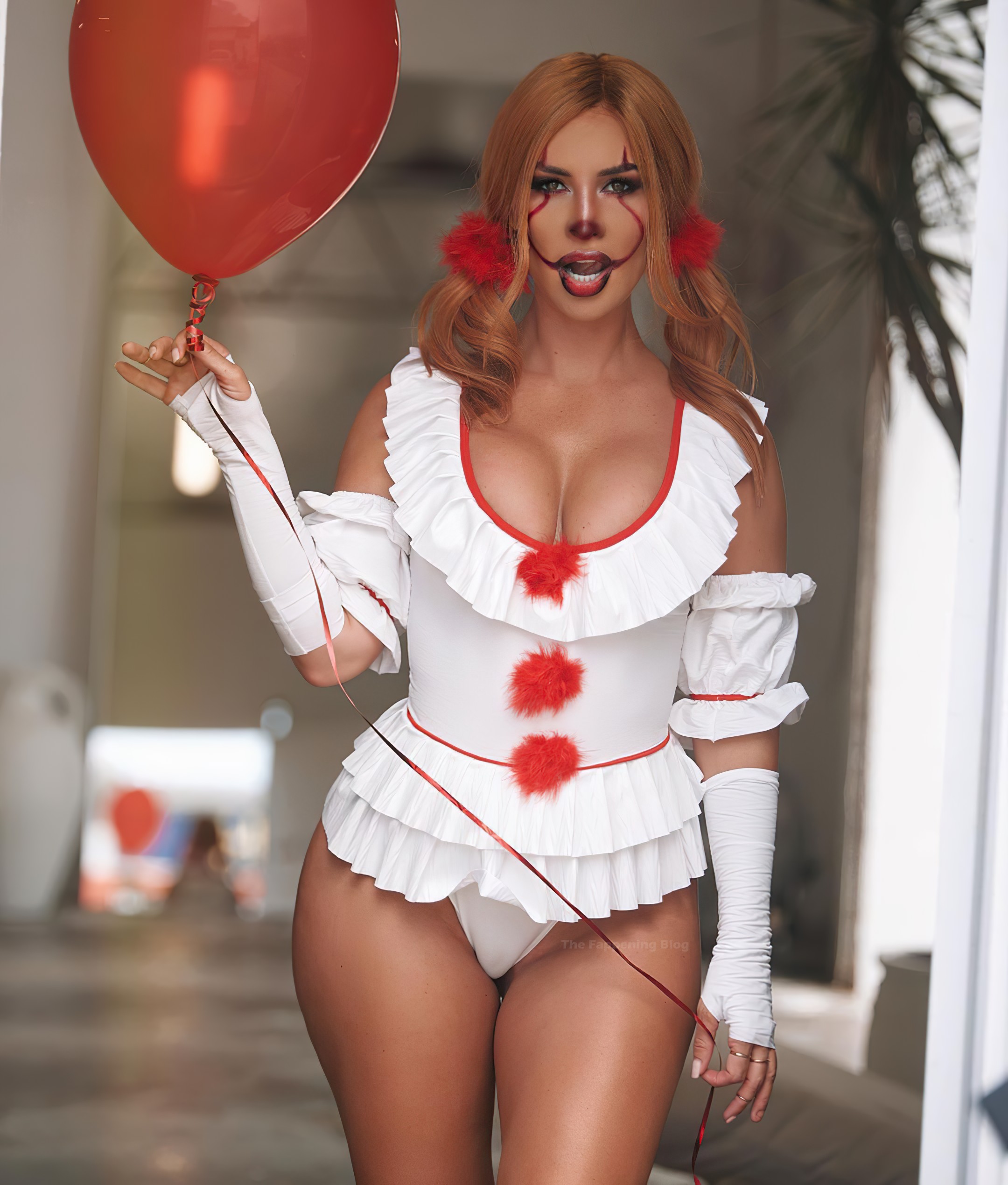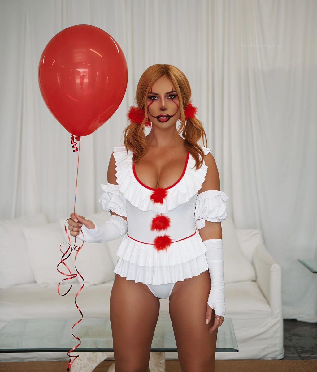 La modelo curvilínea Rosanna Arkle muestra sus globos y trasero mientras posa como un payaso de “It” en una sesión de fotos en redes sociales, 31/10/2020.