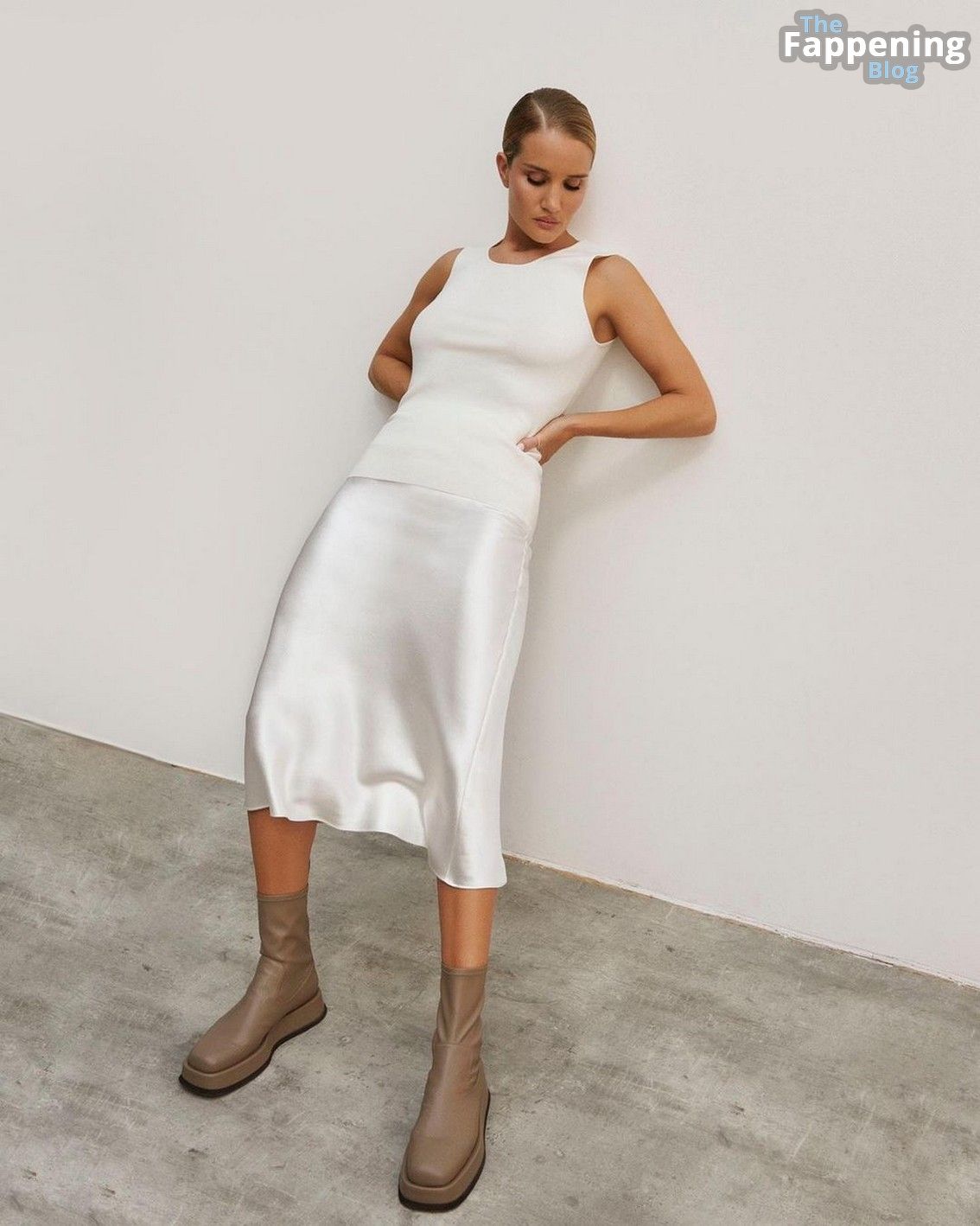 La modelo lleva botas de cuero con tacón combinadas con un mini vestido de seda del mismo tono, y para aumentar el protagonismo, Rosie Huntington-Whiteley mostró un vistazo de sus bragas al levantar la falda. Esta combinación resulta súper elegante. Rosie mezcla botines gruesos color latte con una falda blanca de seda y una camiseta de algodón acanalada. Ese contraste simplemente realza el toque femenino.