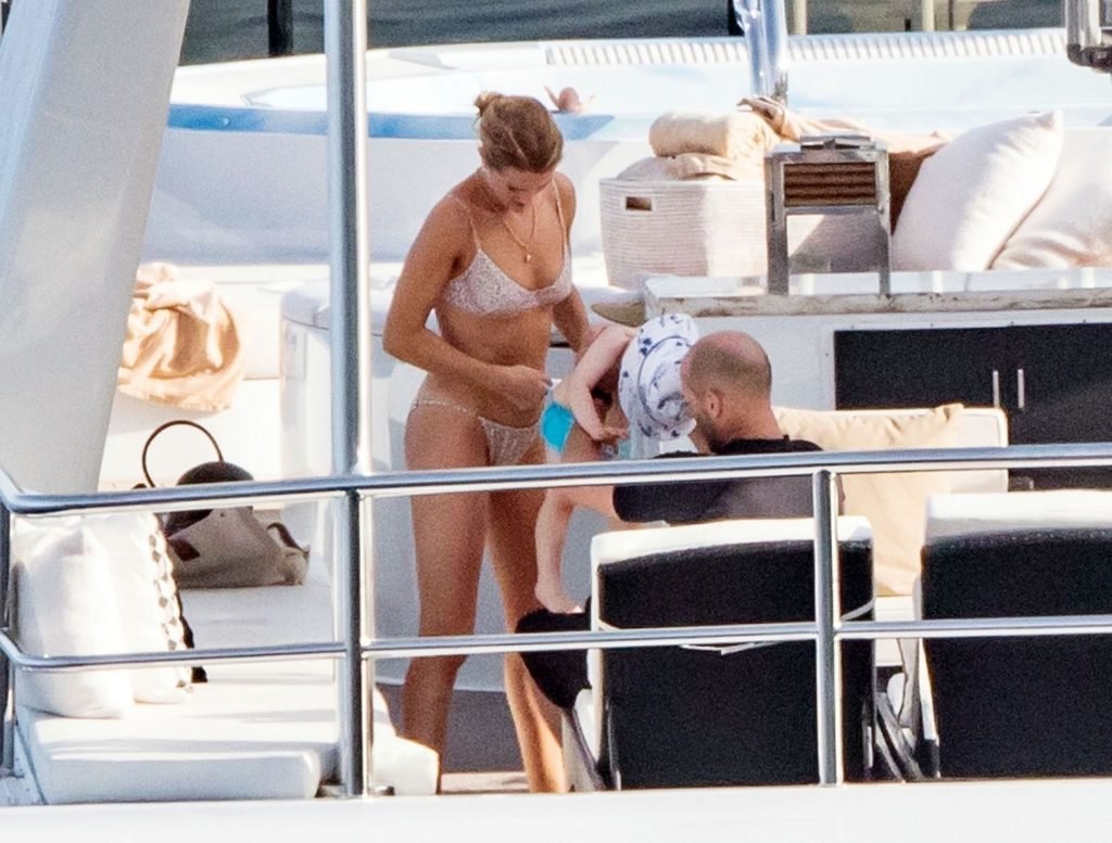 La familia se ve en su barco de lujo con Rosie mostrando su esbelto físico con un pequeño bikini mientras observa a su esposo lleno de acción Jason navegar por las aguas llevando a su hijo Jack en un emocionante paseo en lancha rápida.