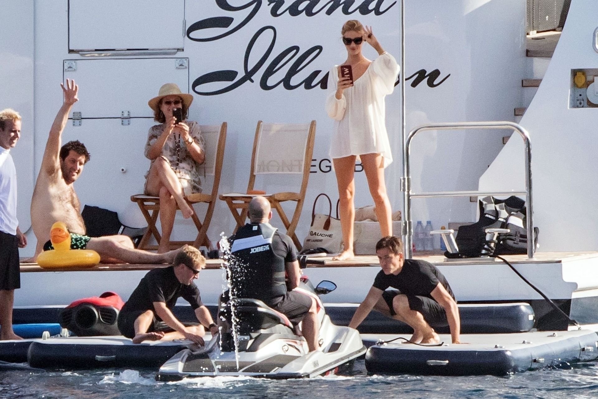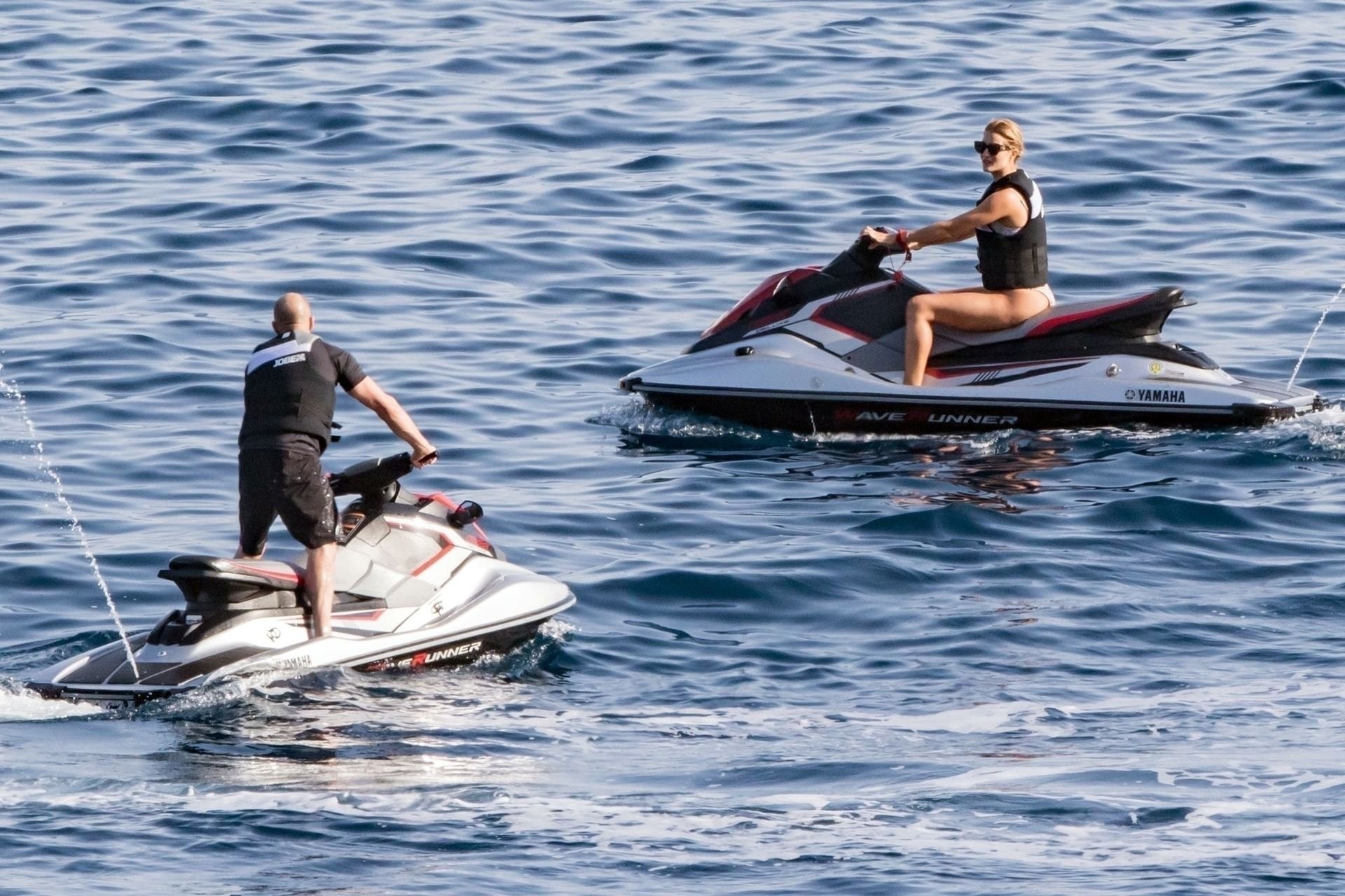 La familia se ve en su barco de lujo con Rosie mostrando su esbelto físico con un pequeño bikini mientras observa a su esposo lleno de acción Jason navegar por las aguas llevando a su hijo Jack en un emocionante paseo en lancha rápida.