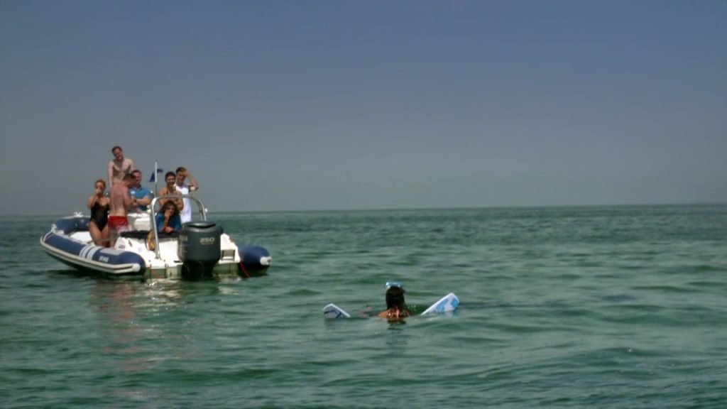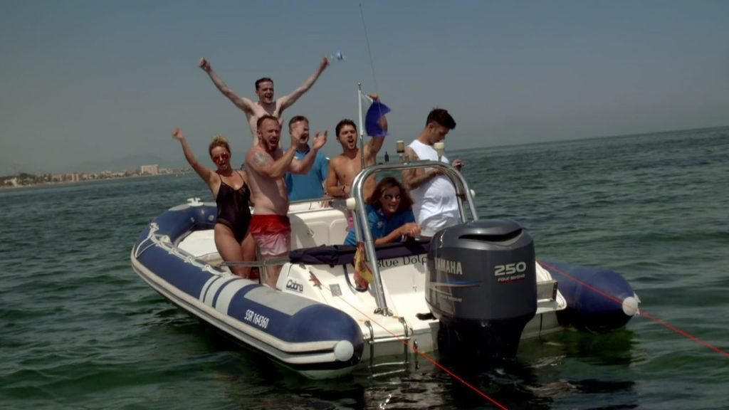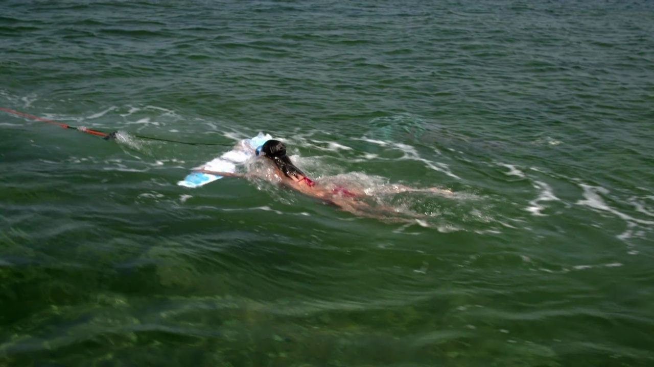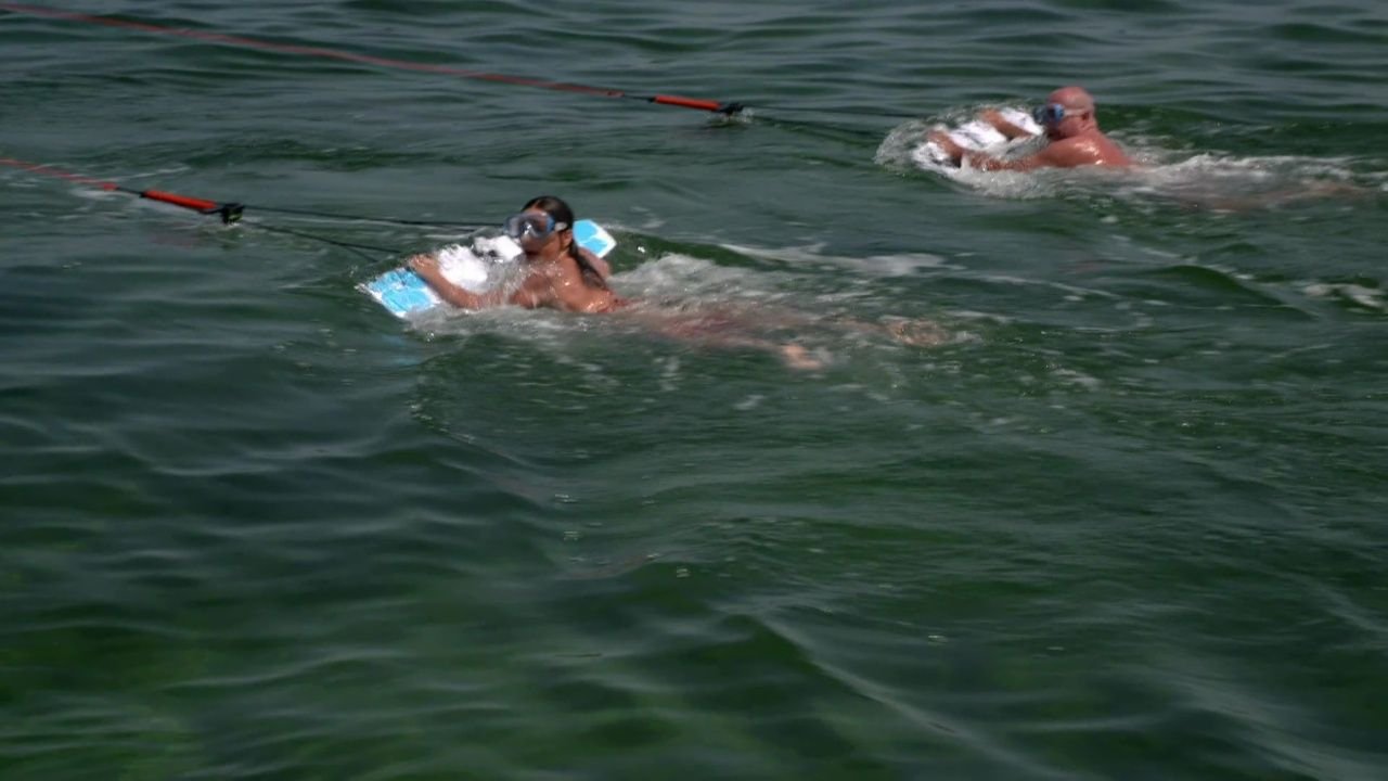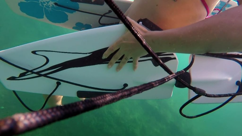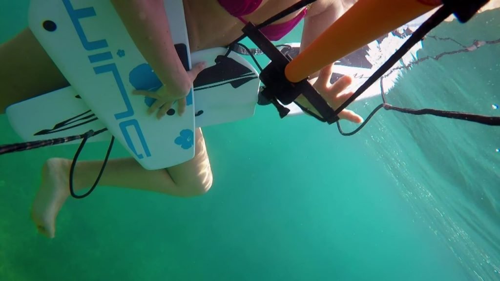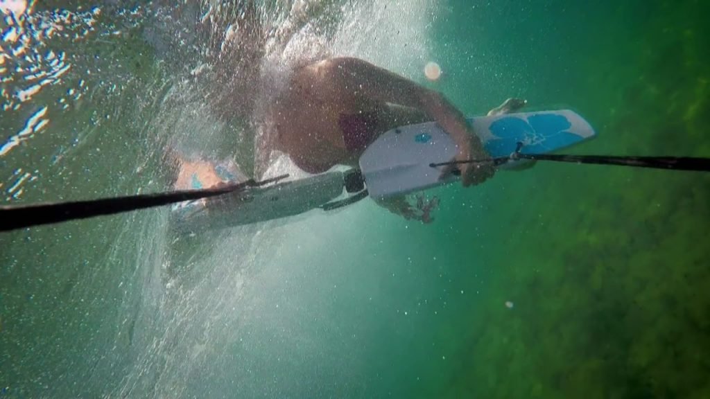 La estrella de la televisión reality Roxanne Pallett (36) pierde la parte inferior de su bikini mientras practica Subwing en “Celebrity Coach Trip.” Transmitido en E4 (enero 2019).