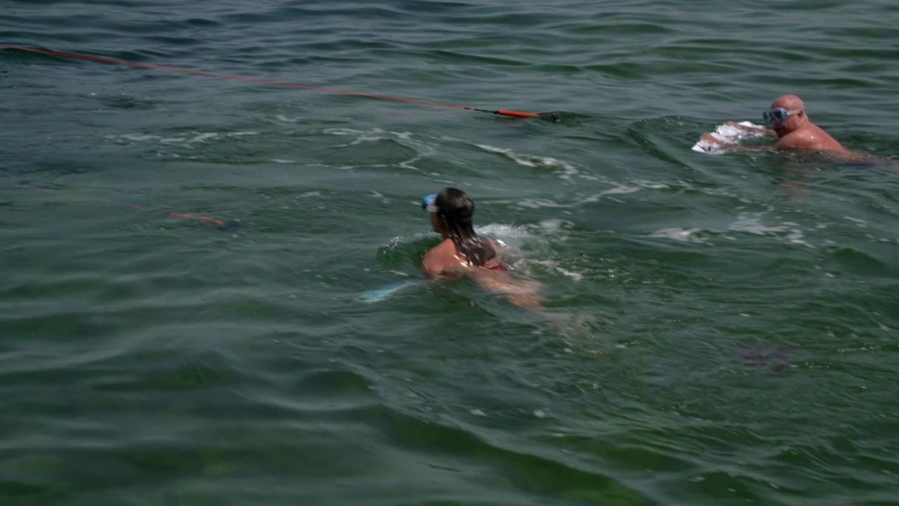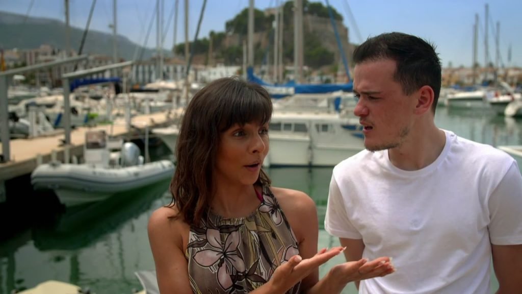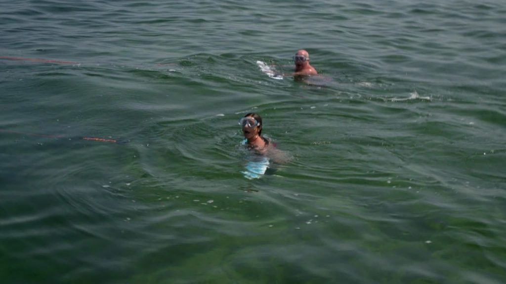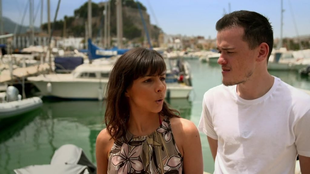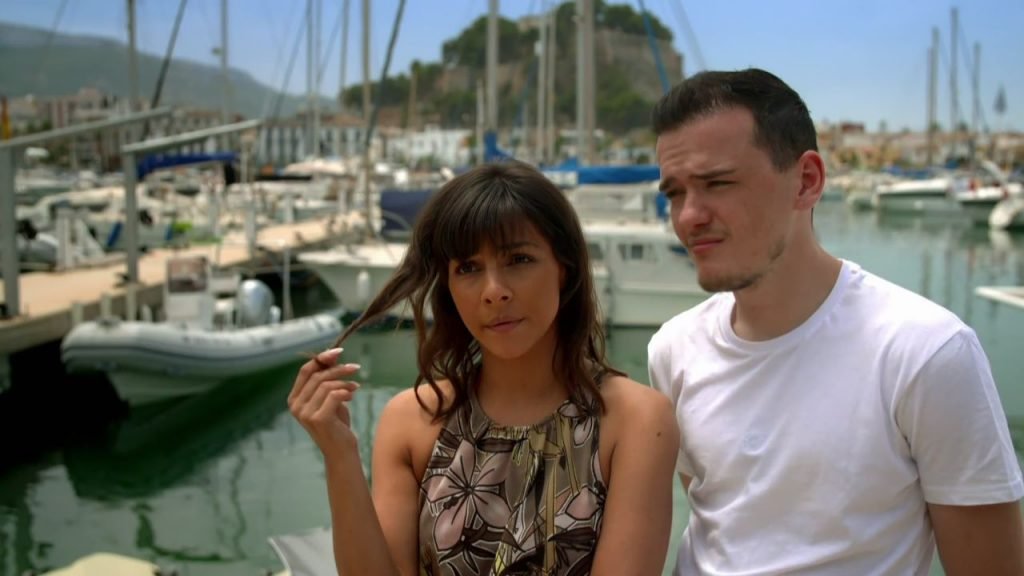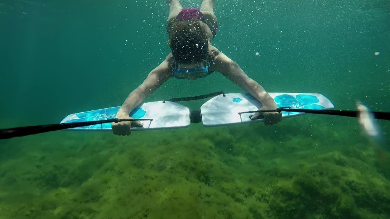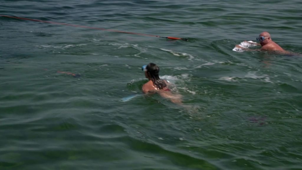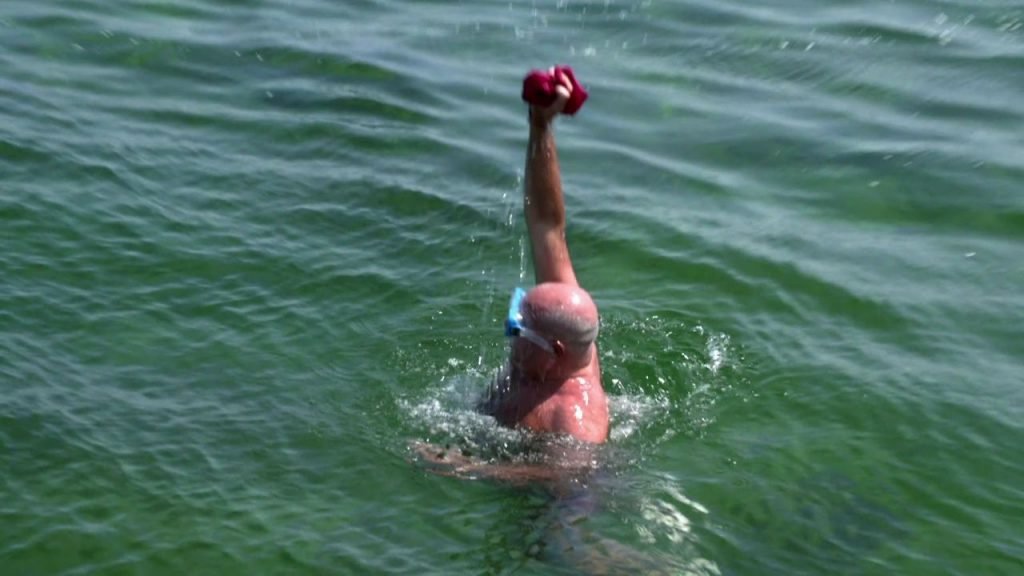 La estrella de la televisión reality Roxanne Pallett (36) pierde la parte inferior de su bikini mientras practica Subwing en “Celebrity Coach Trip.” Transmitido en E4 (enero 2019).