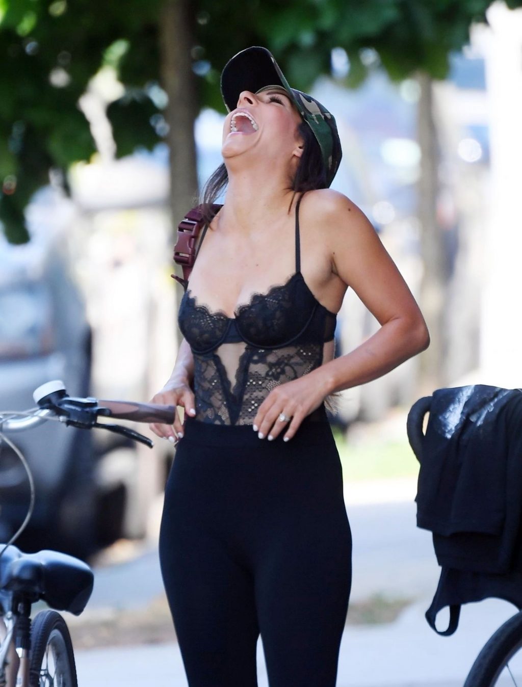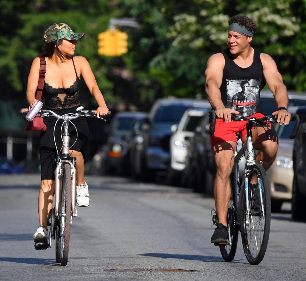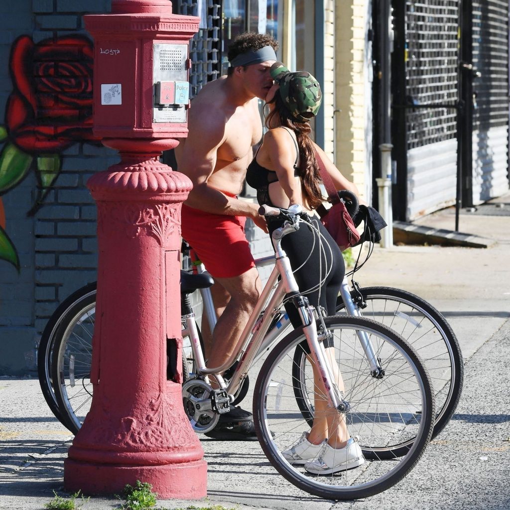 Recién casados Roxanne Pallett & Jason Carrion son vistos pedaleando cerca de su nueva casa adosada de piedra en Nueva York durante la ola de calor abrasadora, 23/07/2020.