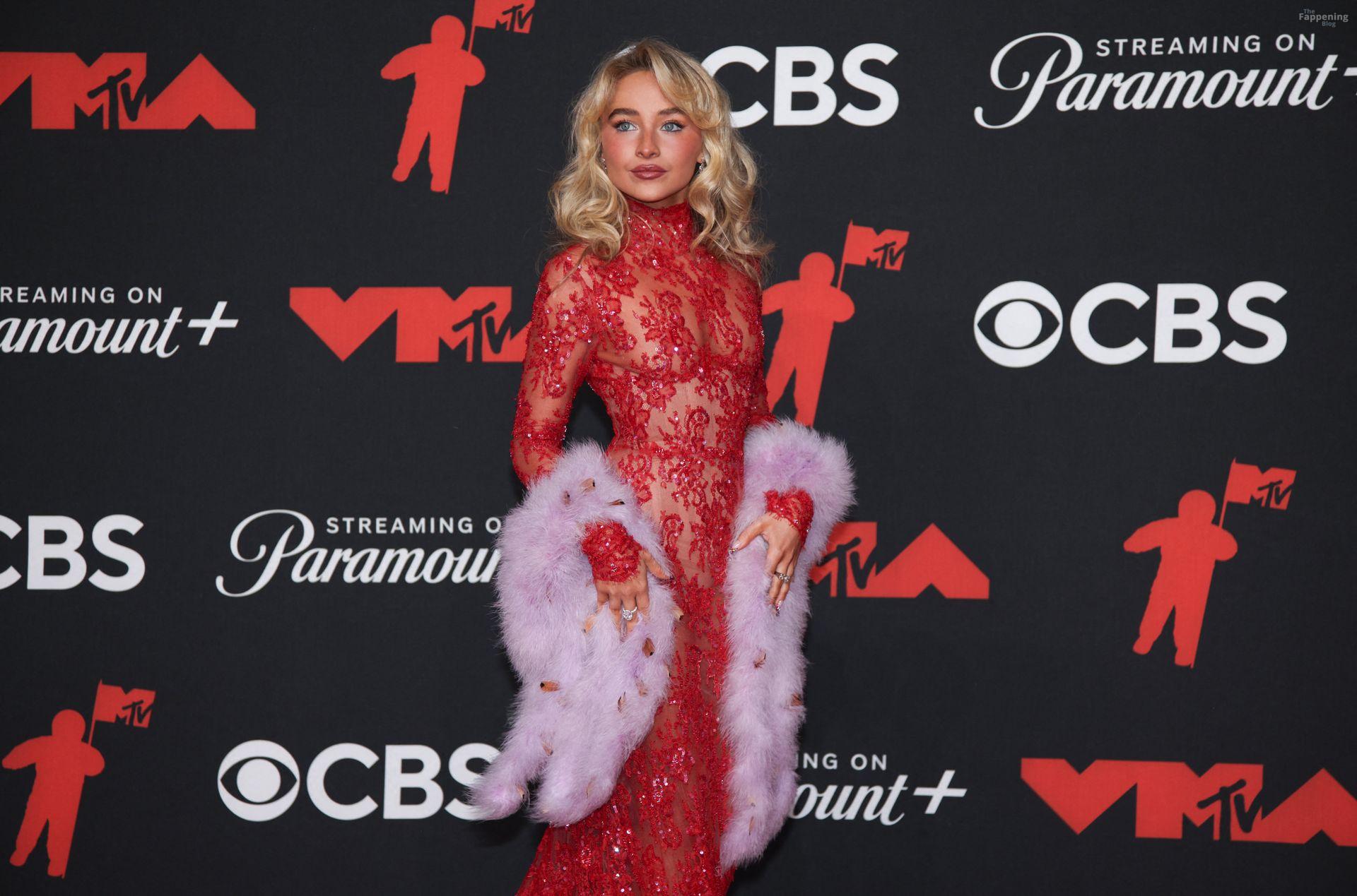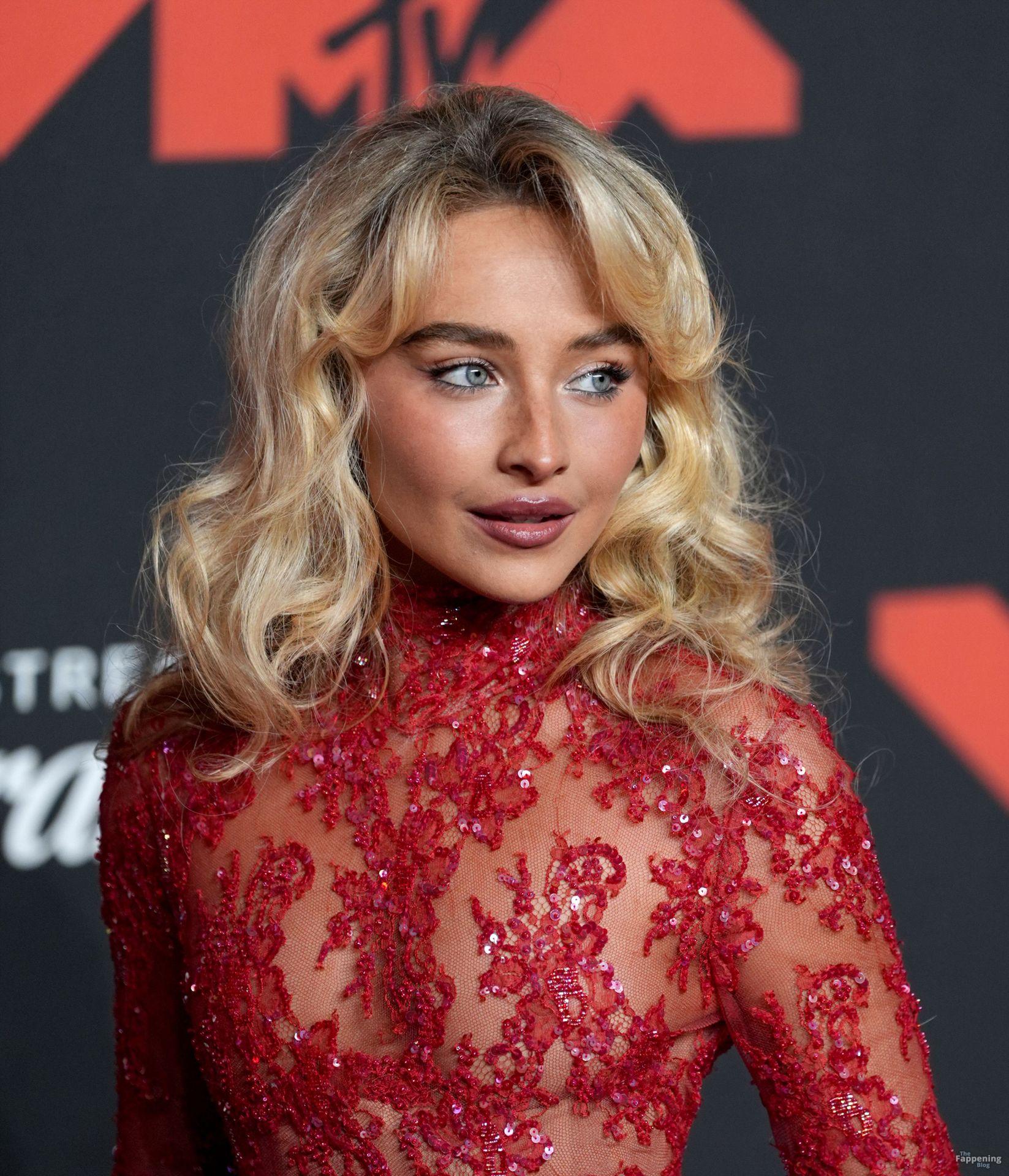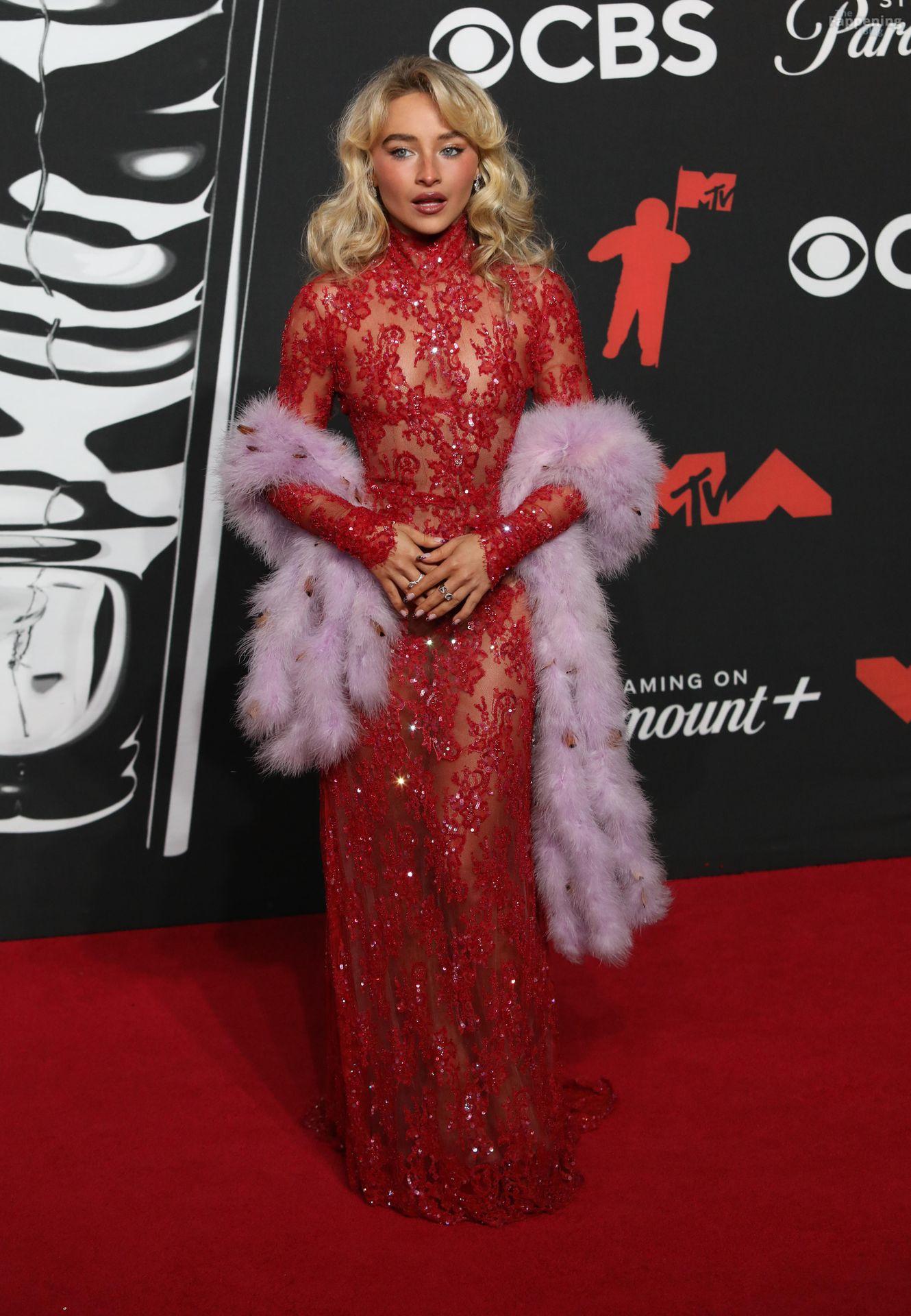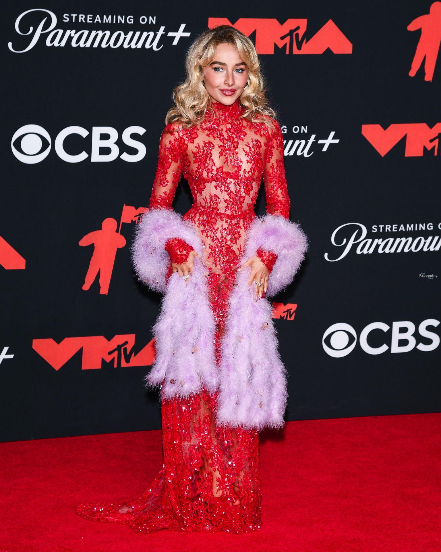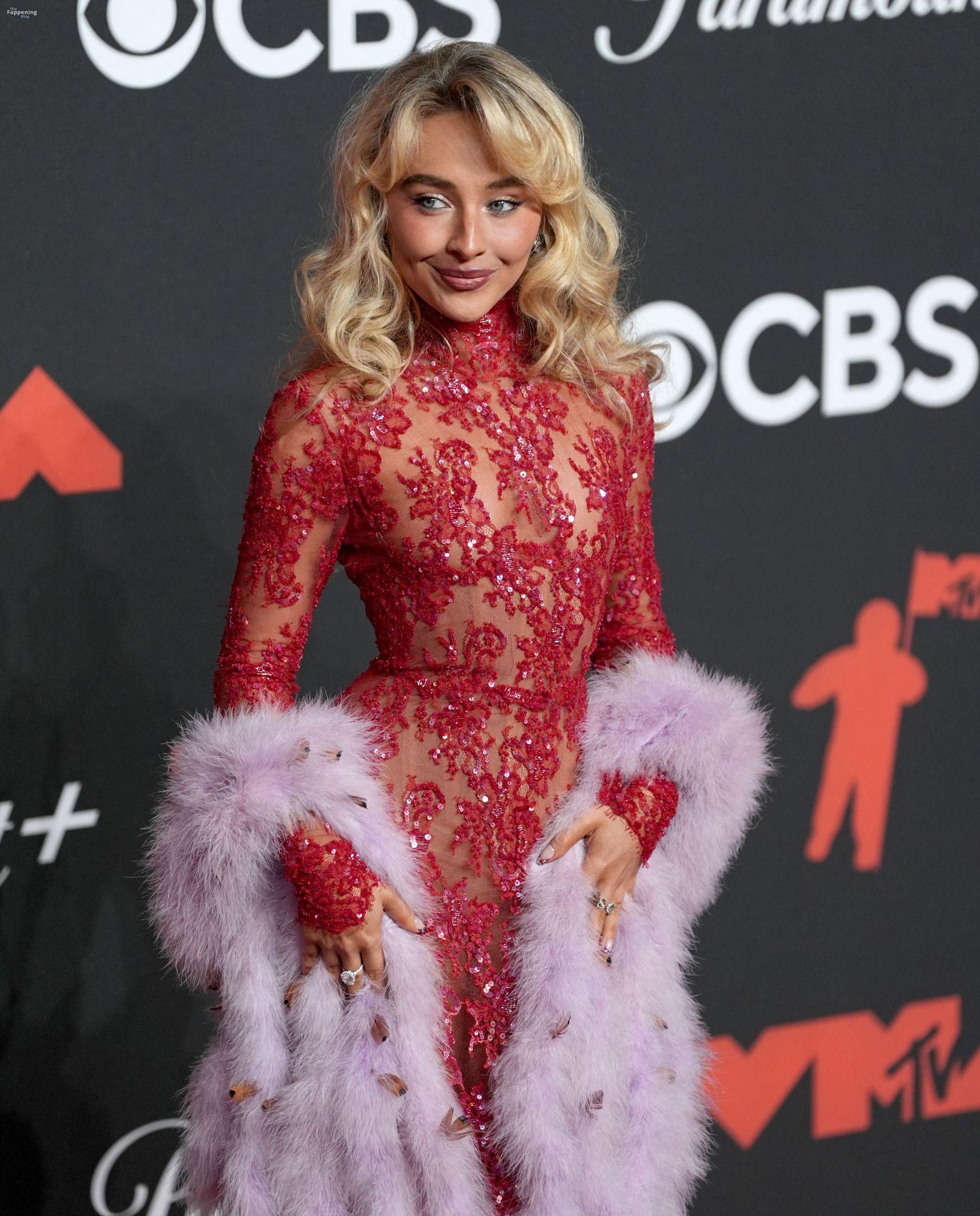 Sabrina Carpenter dominó los MTV Video Music Awards 2025 en UBS Arena el 7 de septiembre de 2025 en Elmont. Caminó por la alfombra roja con un vestido de encaje rojo transparente cubierto de lentejuelas, que abrazaba su figura pequeña y mostraba sus pechos.