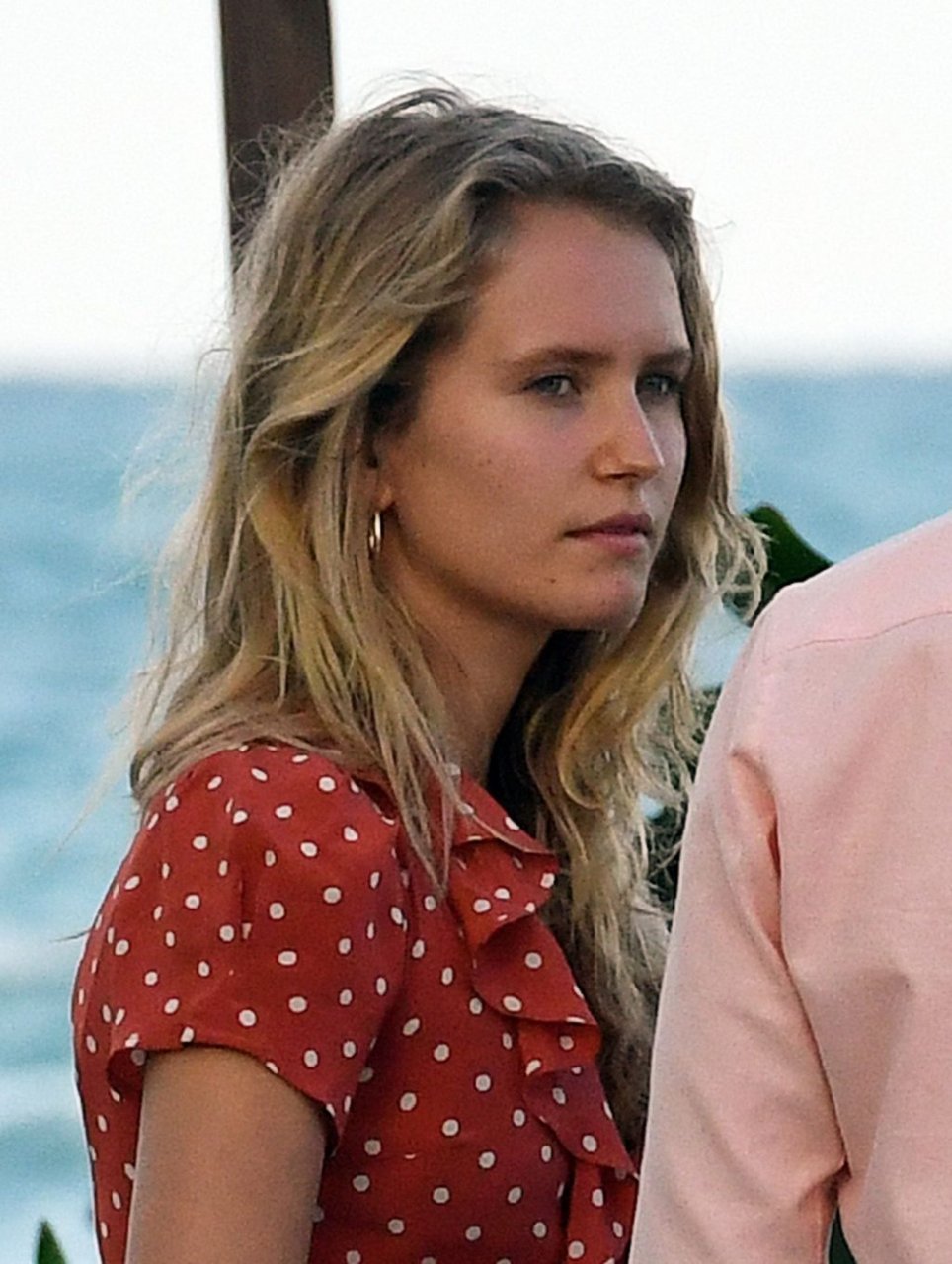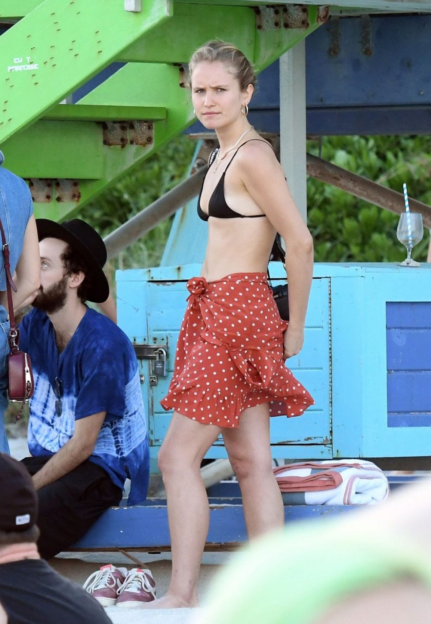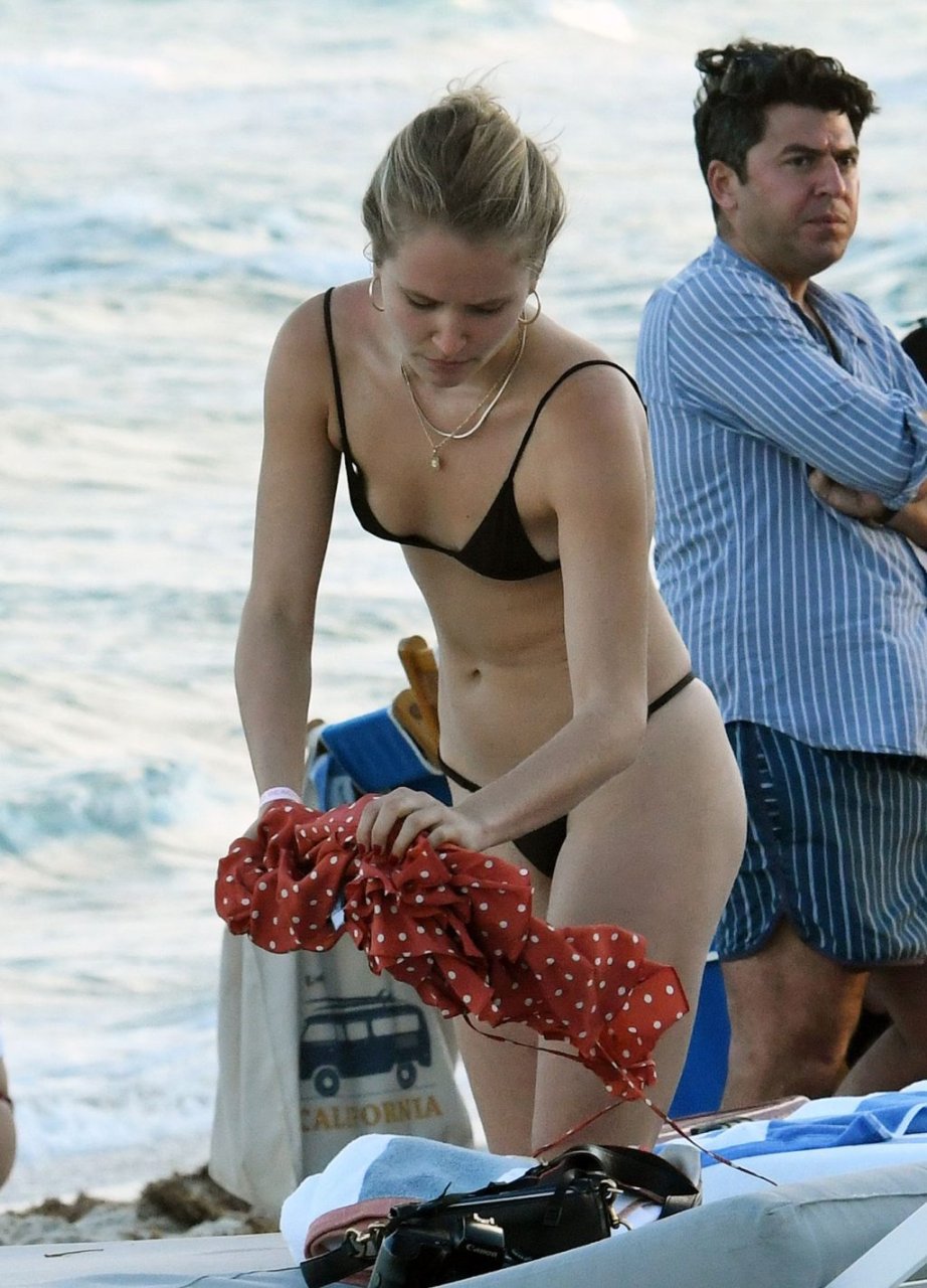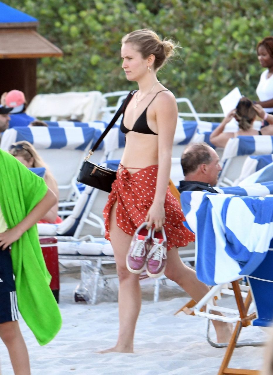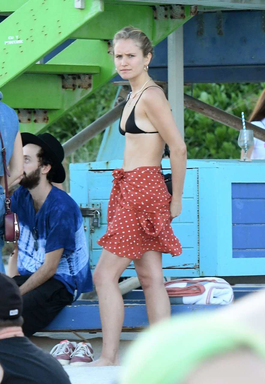 Titless modelo Sailor Brinkley Cook lleva un pequeño bikini negro mientras se da un baño al atardecer en la playa de Miami, 12/07/2018.