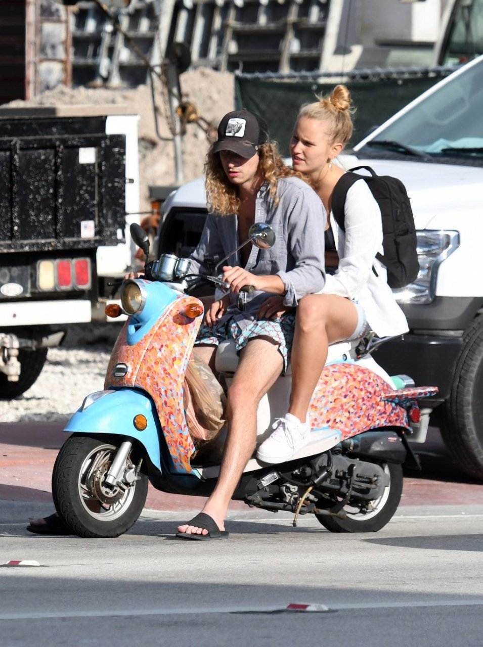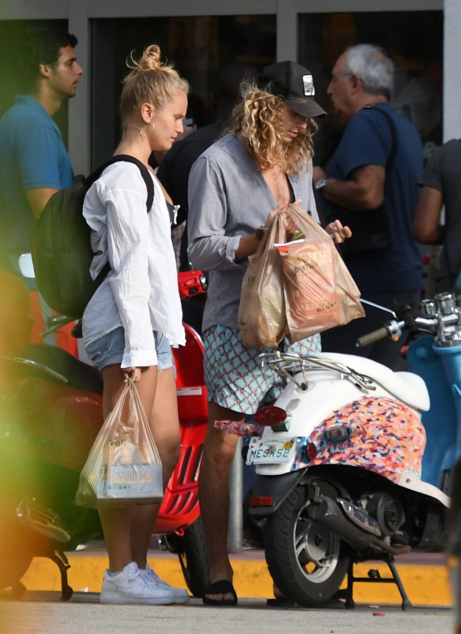 La modelo Sailor Brinkley Cook lleva un top de bikini negro mientras monta un scooter con su novio Ben Sosne por Miami Beach, 29/04/2019.