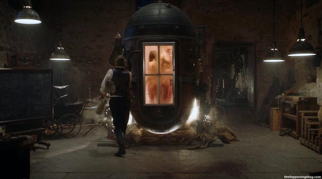 Básicamente, en la primera escena, vemos a un hombre y a Sara Vickers completamente desnudos mientras están en alguna máquina. Los dos giran mientras el segundo hombre se acerca a la máquina, y trae algunas toallas o mantas para ellos. No estoy seguro. De todas formas, tenemos una gran vista de los pechos y la vagina con vello de Sara Vickers. ¡Si eres fan de la zona peluda (merkin), probablemente disfrutarás esta escena!