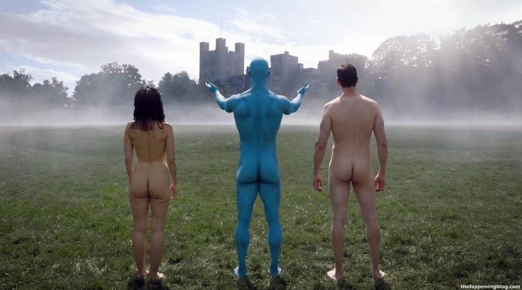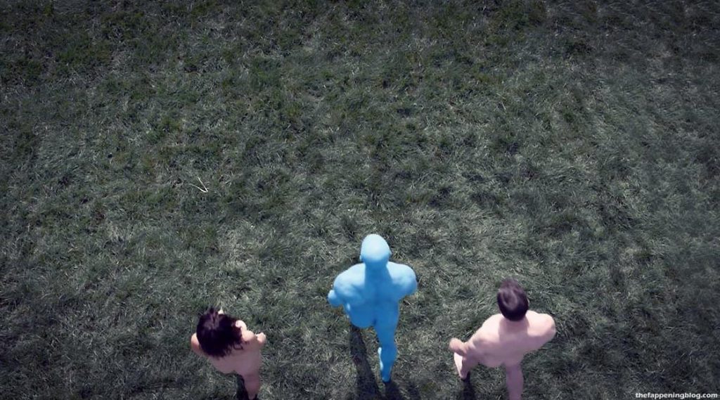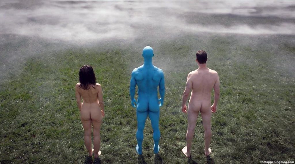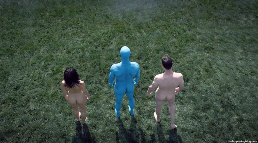 And now, the second scene from the ‘Watchmen’ series. In the next edit, miss Sara Vickers (with her body double) is once again seen with two dudes as they’re all fully naked! Sara Vickers is seen nude from above as she walks across a grass field with two men, one of whom is blue. Again, we have a good view of her butt as the camera view rotates down behind her.