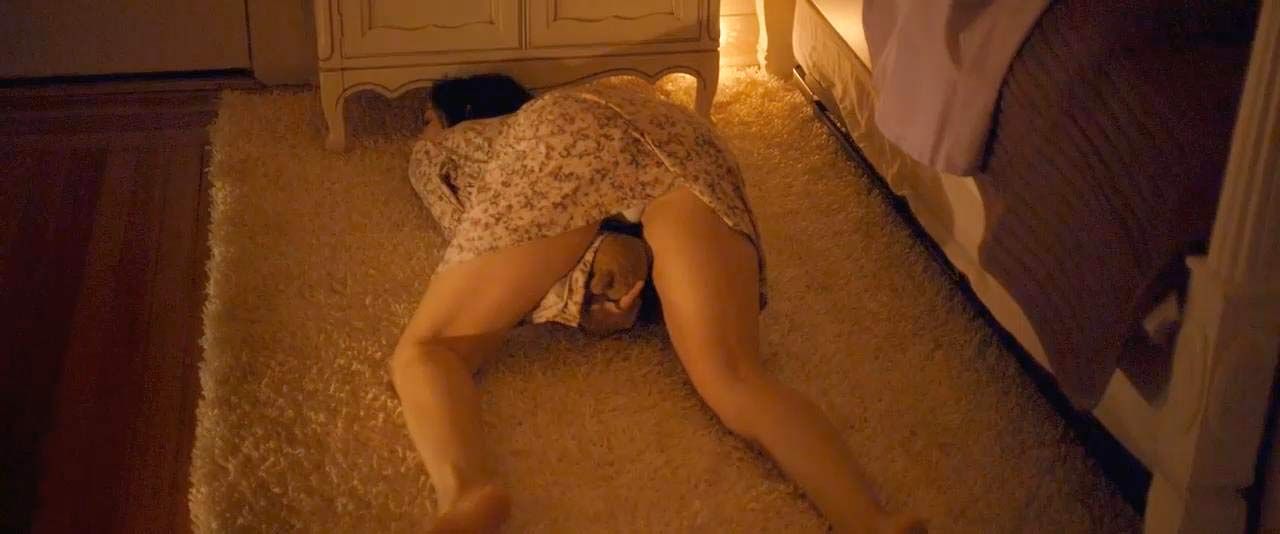 Sarah Silverman is lying on her stomach on the floor. She raises her butt in the air and puts a teddy bear down between her legs to grind against it and masturbate.