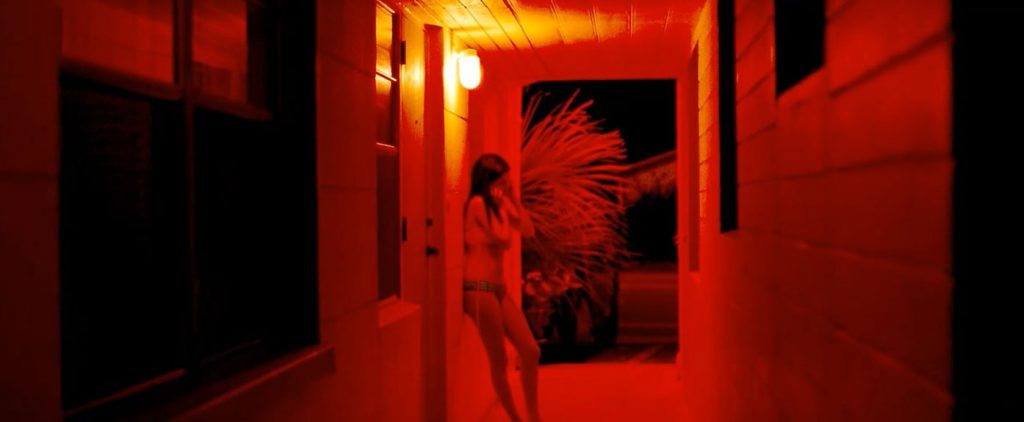 In the first scene, we see Selena Gomez, wearing an orange bikini top with the straps undone and green bikini bottoms while standing in a corridor and then sitting on a bed while chatting on the floor phone.
