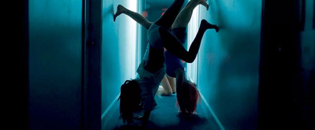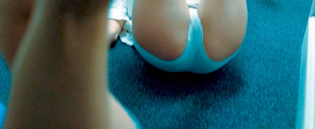In the next scene, we see Selena Gomez as she crawls on the ground in a hallway, rolls around on her back laughing, and does handstands before running away with Vanessa Hudgens (in a blue top and some jean shorts), Ashley Benson (who was in a pink top, and some jean shorts as well), and Rachel Korine (the one with the pink hair) giving us several looks at her ass and in between her legs in white panties.