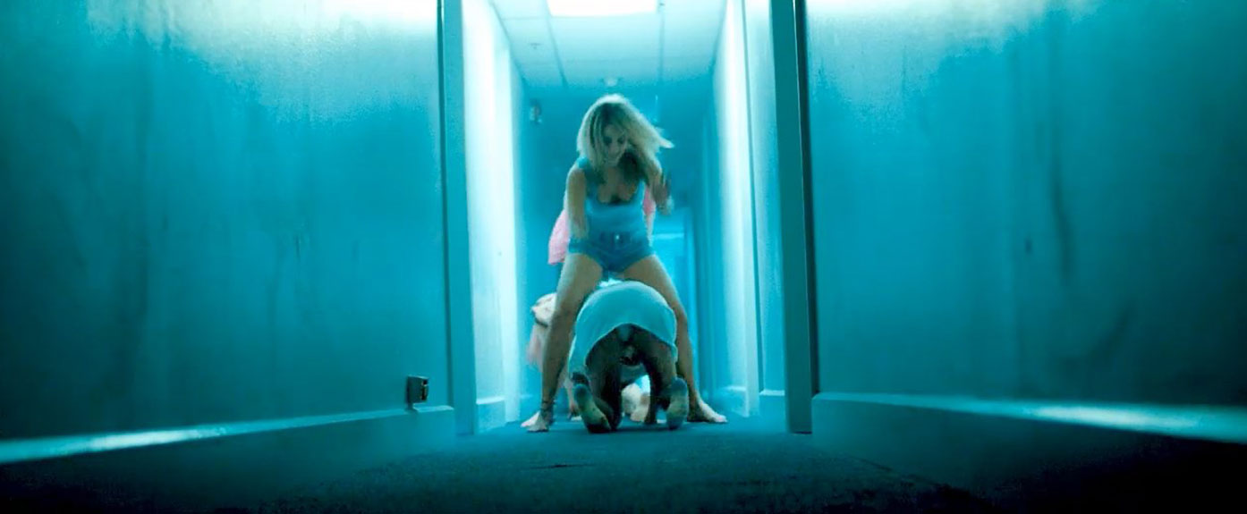 In the next scene, we see Selena Gomez as she crawls on the ground in a hallway, rolls around on her back laughing, and does handstands before running away with Vanessa Hudgens (in a blue top and some jean shorts), Ashley Benson (who was in a pink top, and some jean shorts as well), and Rachel Korine (the one with the pink hair) giving us several looks at her ass and in between her legs in white panties.