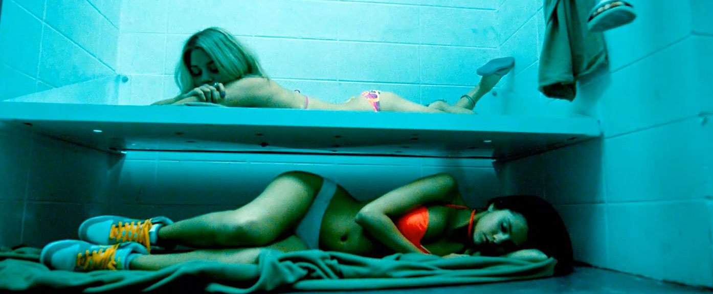 And now folks here’s the last scene! In this scene, Selena Gomez sits in a police station wearing blue bikini bottoms and an orange bikini top before sleeping in a prison cell alongside Vanessa Hudgens (who is in a purple bikini), Ashley Benson (pink bikini), and Rachel Korine (who is in a blue bikini).