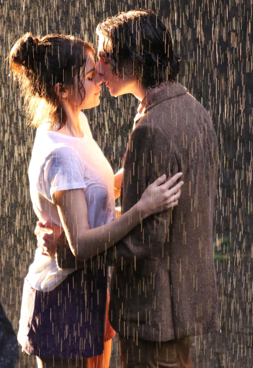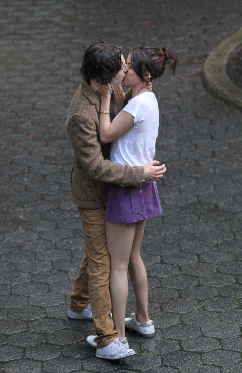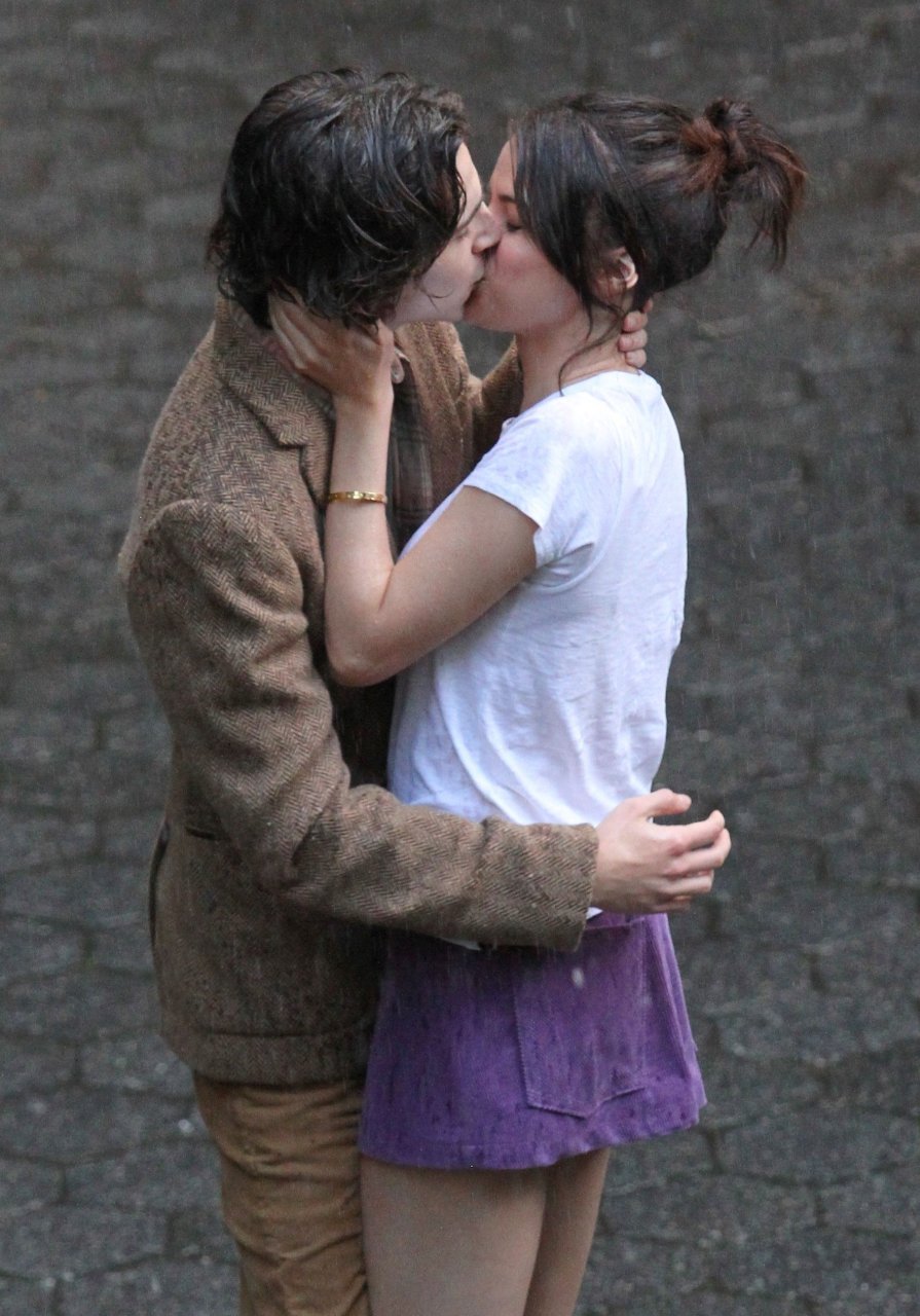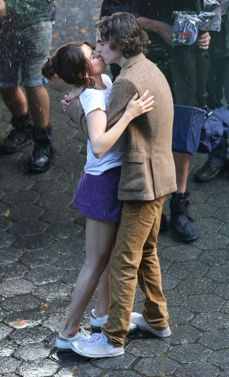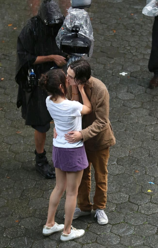 Actriz y cantante Selena Gomez y Timothee Chalamet se besan apasionadamente durante una escena romántica bajo la lluvia en el set del Proyecto de Película Sin Título de Woody Allen en Central Park, Manhattan, Ciudad de Nueva York, 27/09/2017.