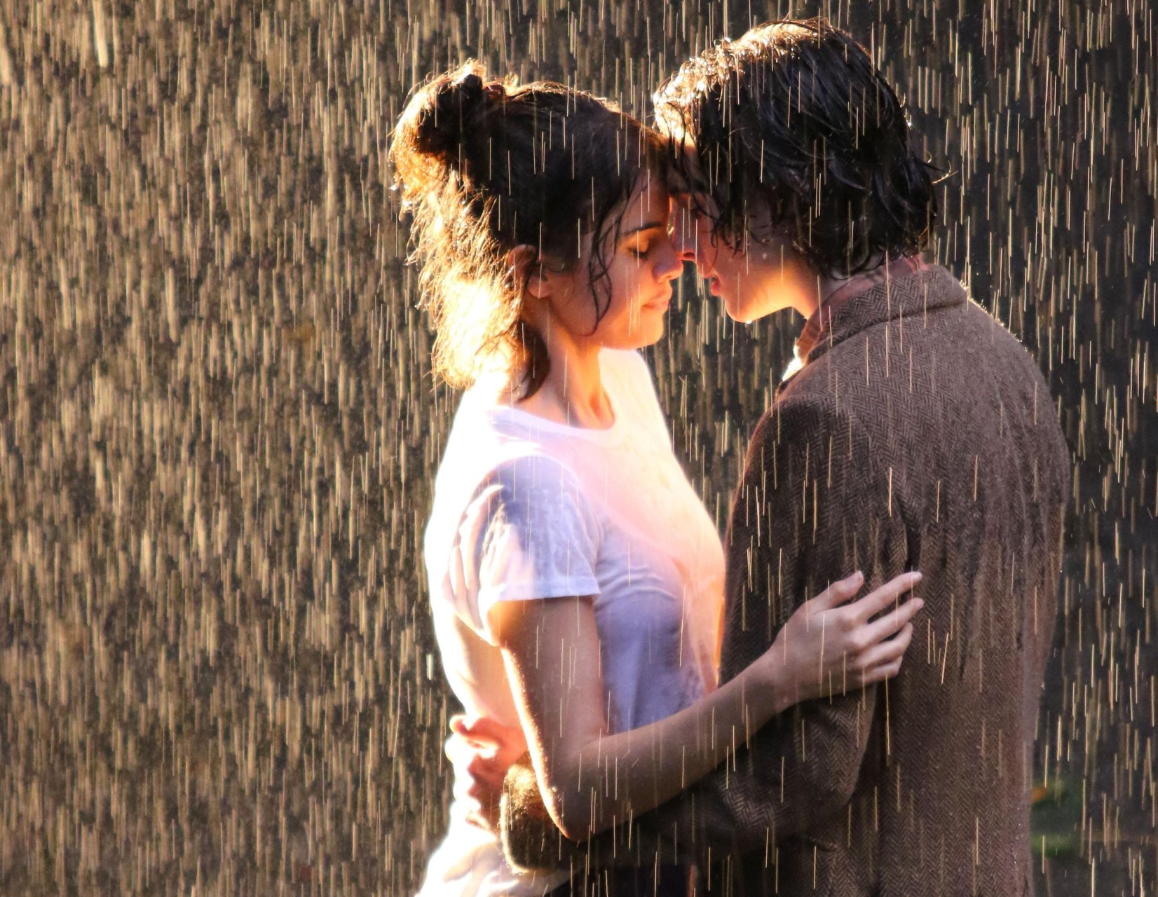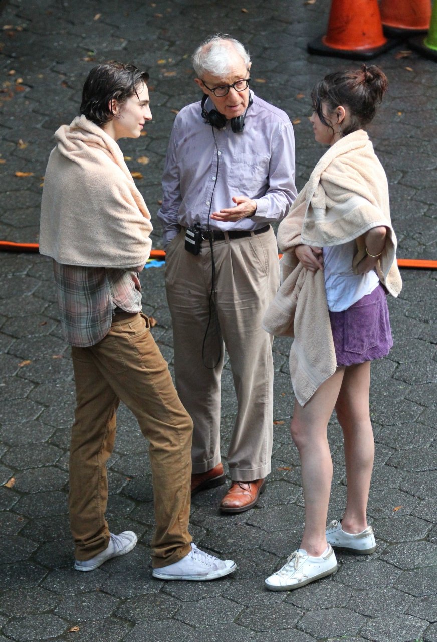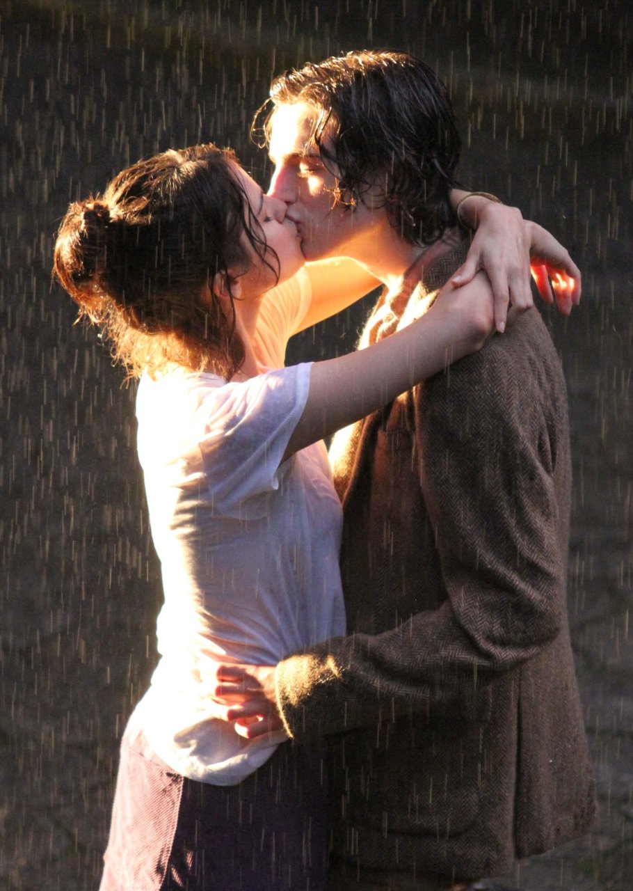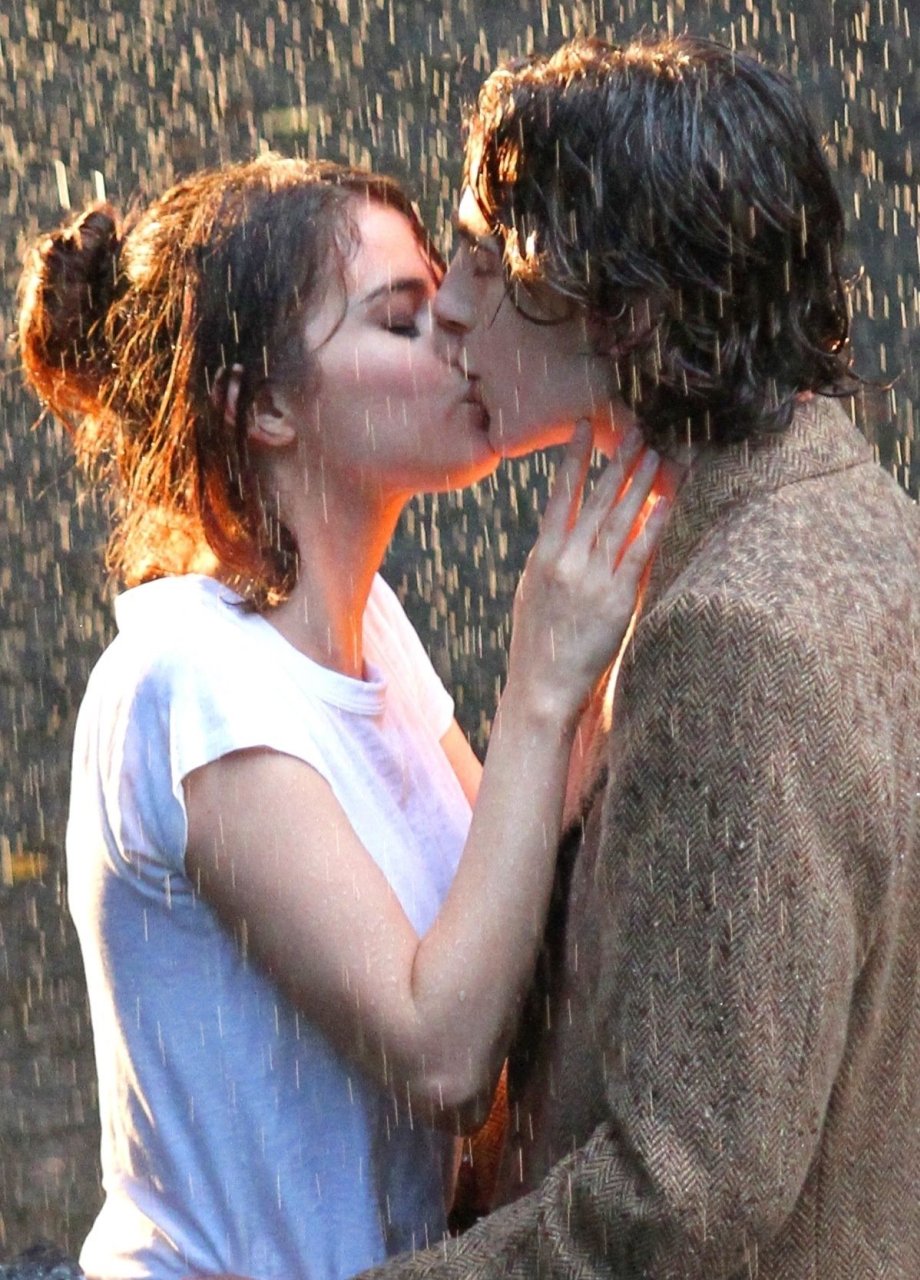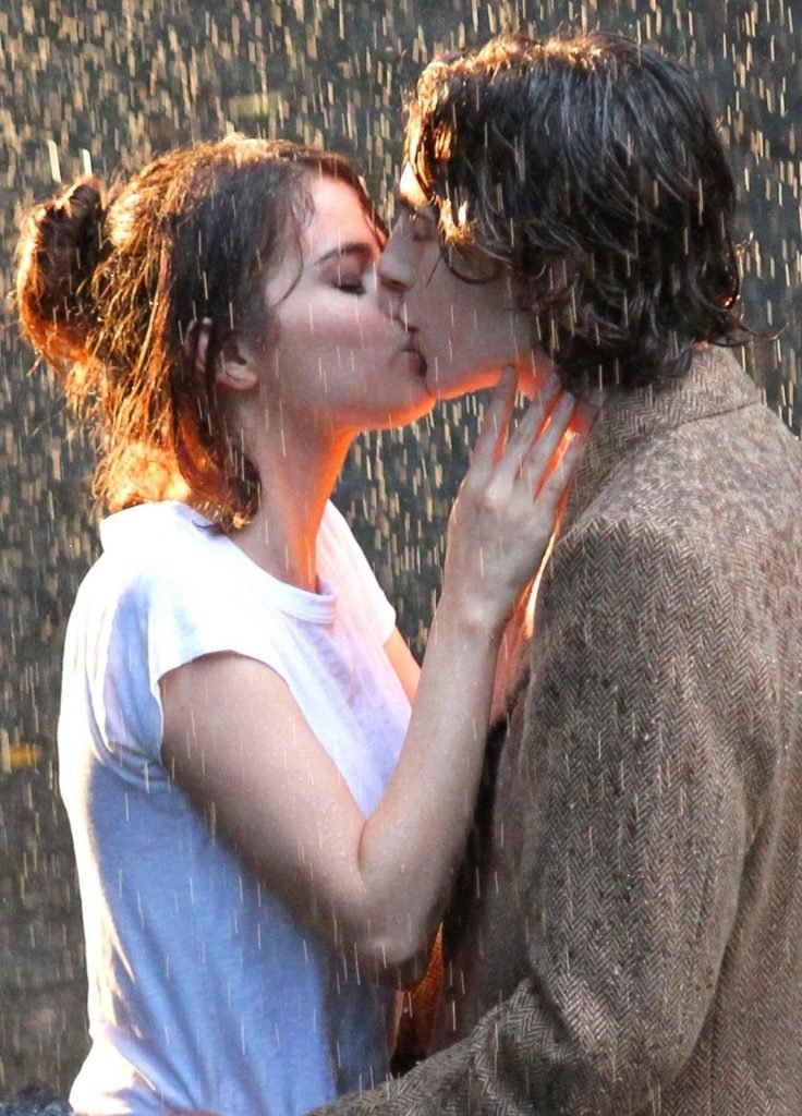 Actriz y cantante Selena Gomez y Timothee Chalamet se besan apasionadamente durante una escena romántica bajo la lluvia en el set del Proyecto de Película Sin Título de Woody Allen en Central Park, Manhattan, Ciudad de Nueva York, 27/09/2017.