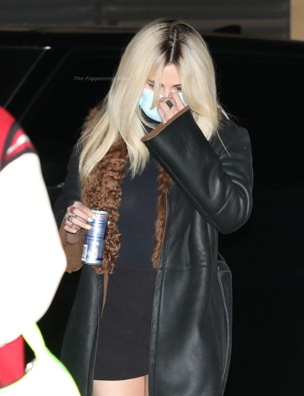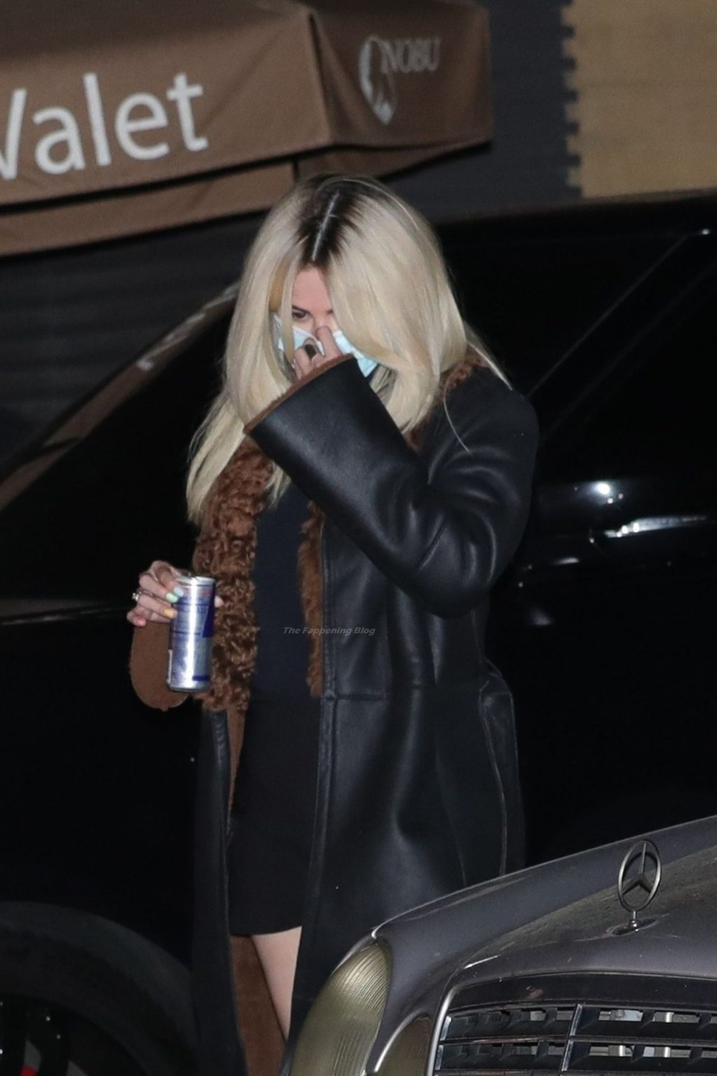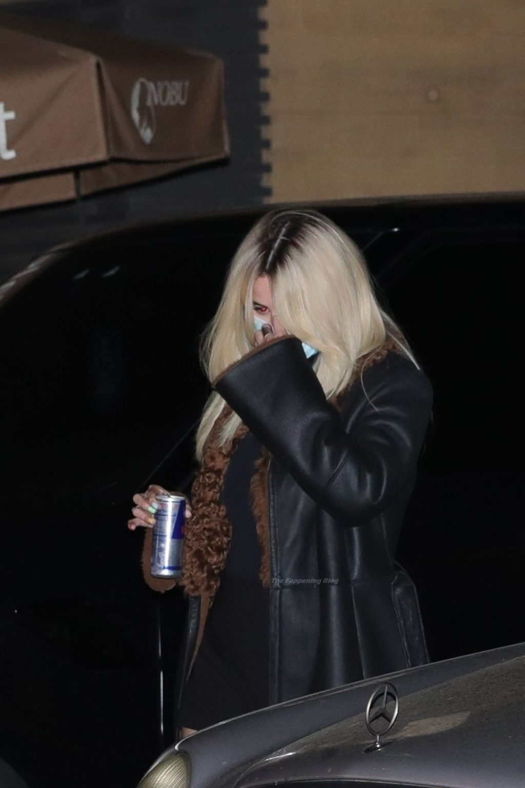 Llevando un mini vestido semi-transparente, la joven de 28 años mostró orgullosamente sus piernas mientras se dirigía a su vehículo después de su cena.