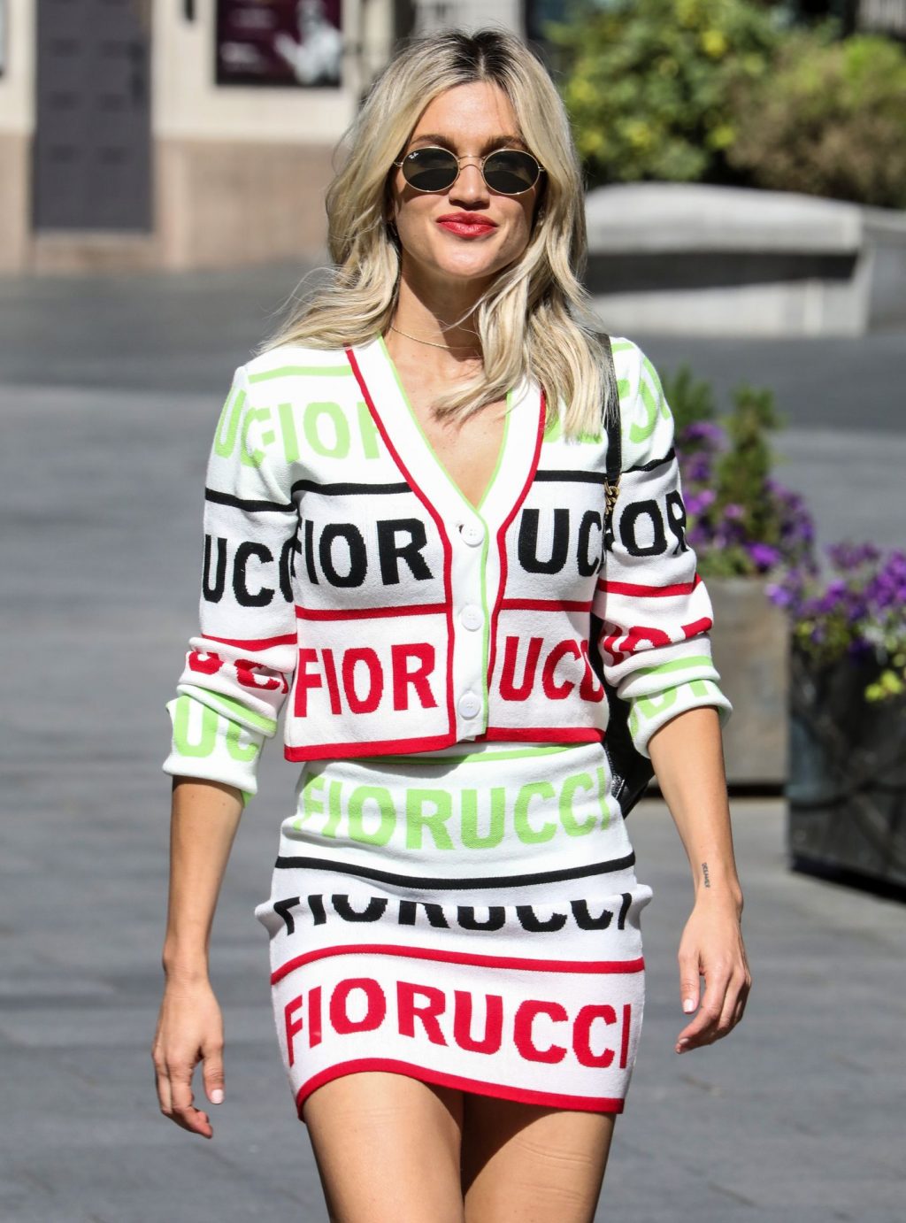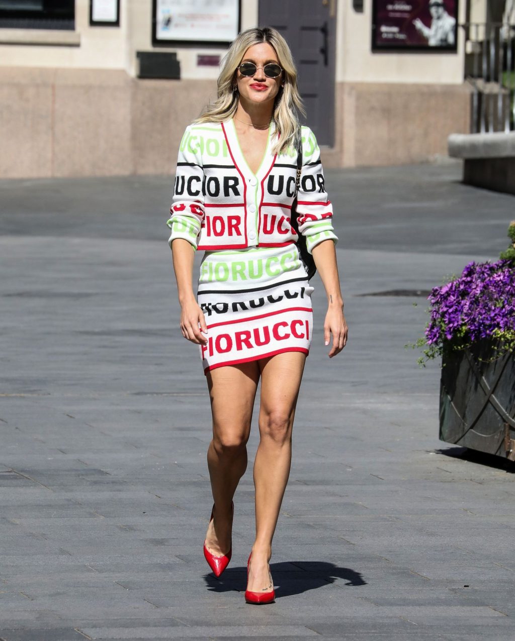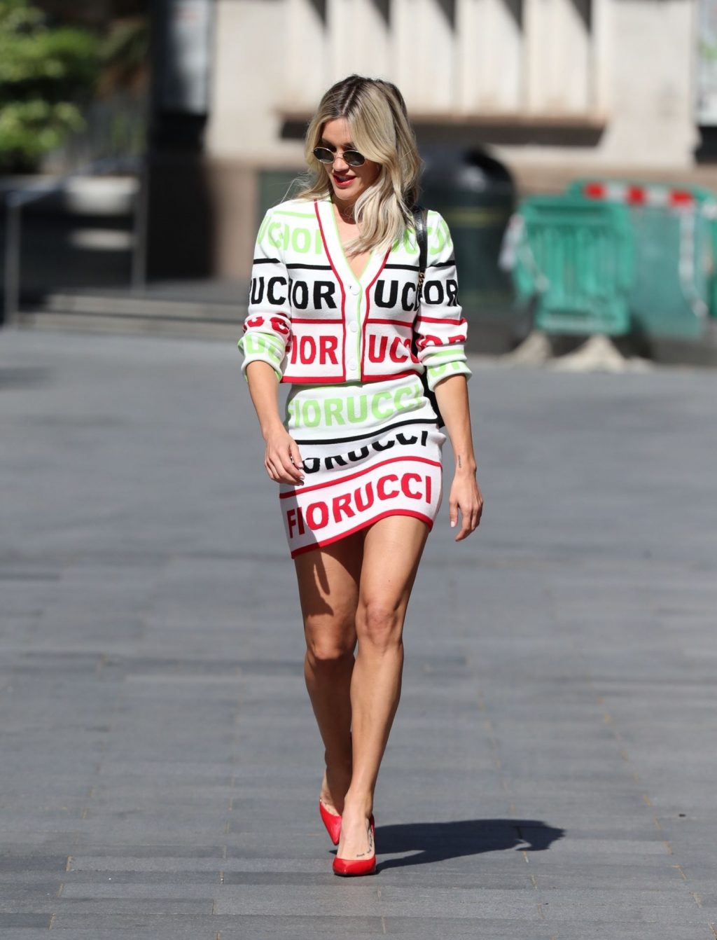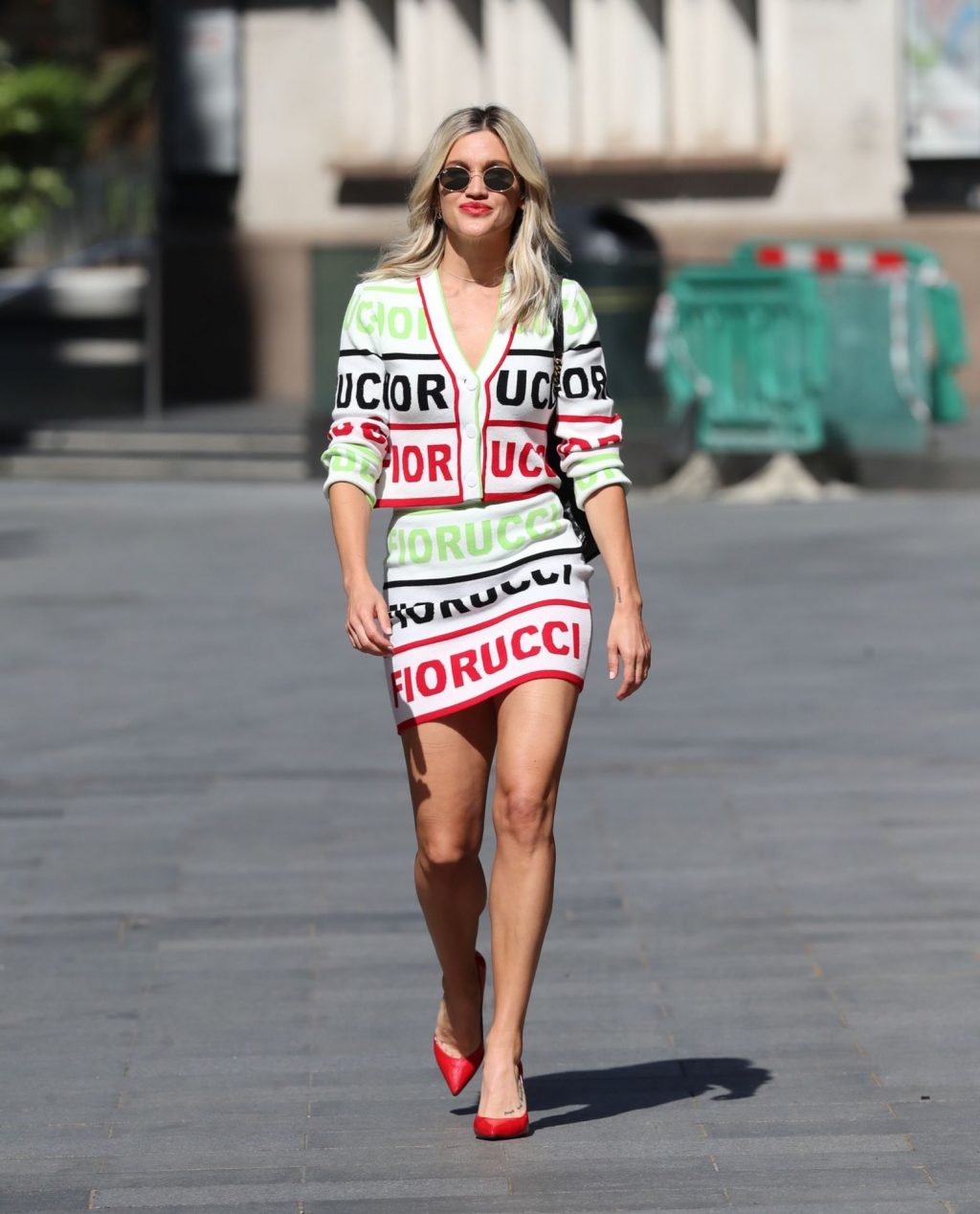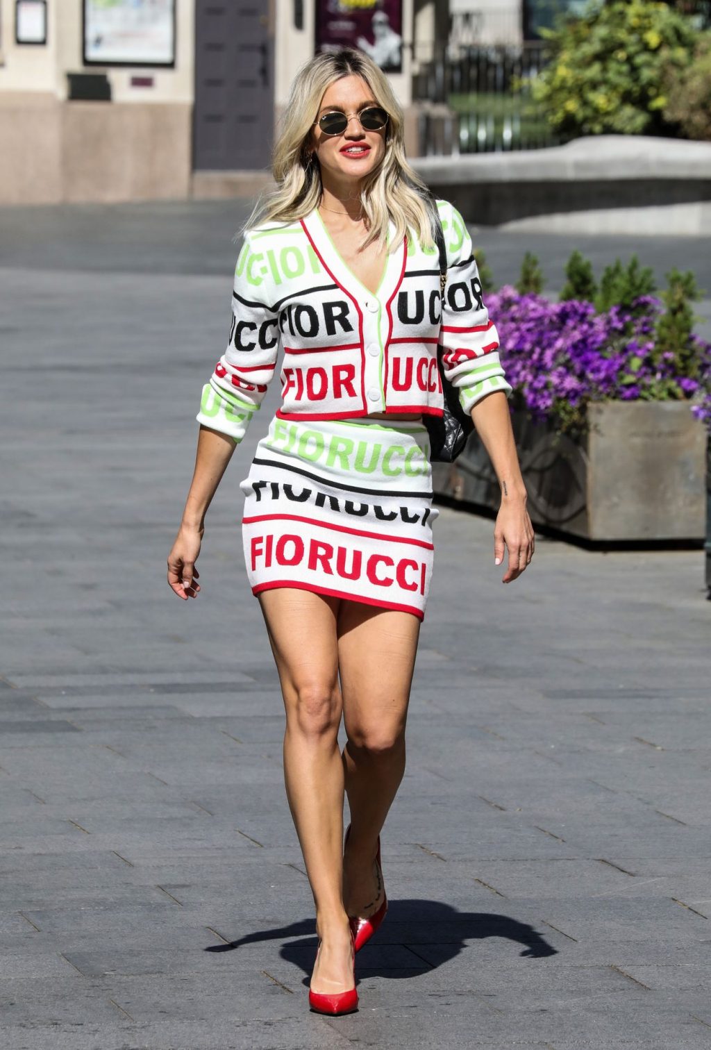 La cantante y personalidad mediática Ashley Roberts (38) con piernas largas es fotografiada saliendo de los estudios Global después de su programa en Heart Radio con un conjunto de dos piezas con top y falda estampados – Londres, 20/05/2020.