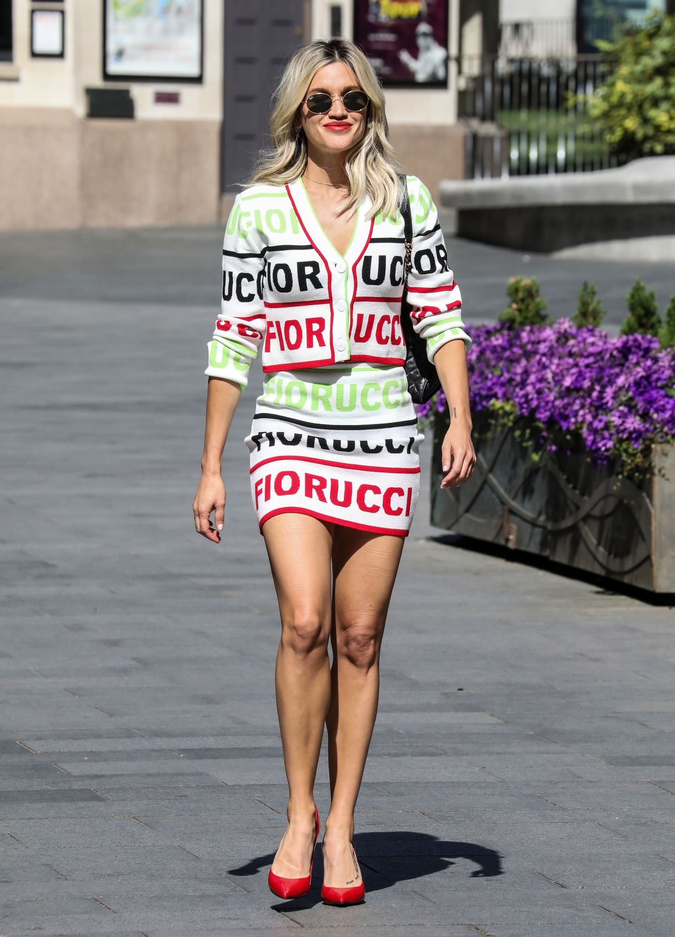 La cantante y personalidad mediática Ashley Roberts (38) con piernas largas es fotografiada saliendo de los estudios Global después de su programa en Heart Radio con un conjunto de dos piezas con top y falda estampados – Londres, 20/05/2020.