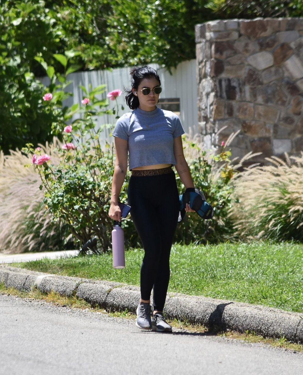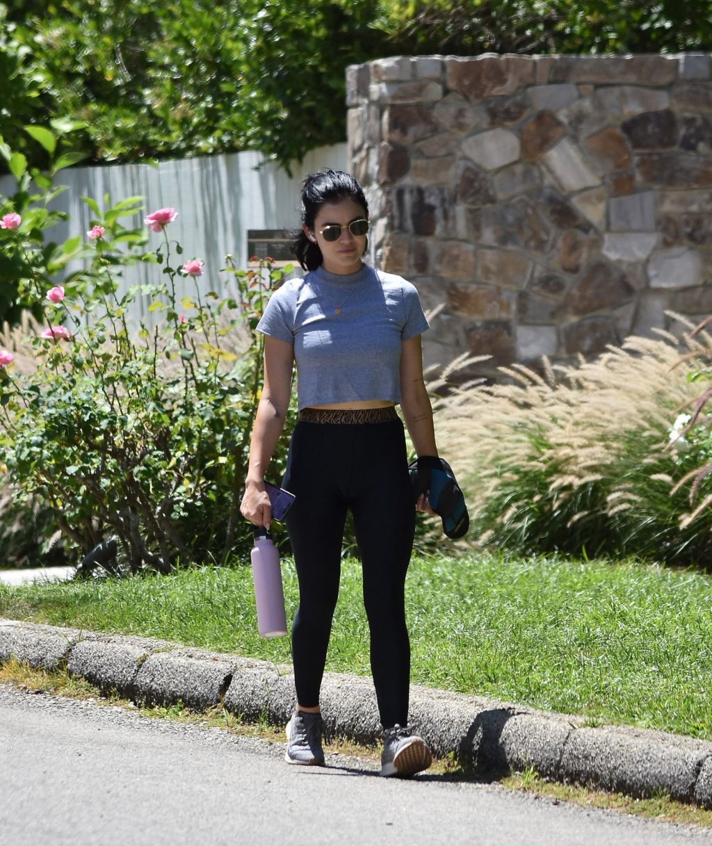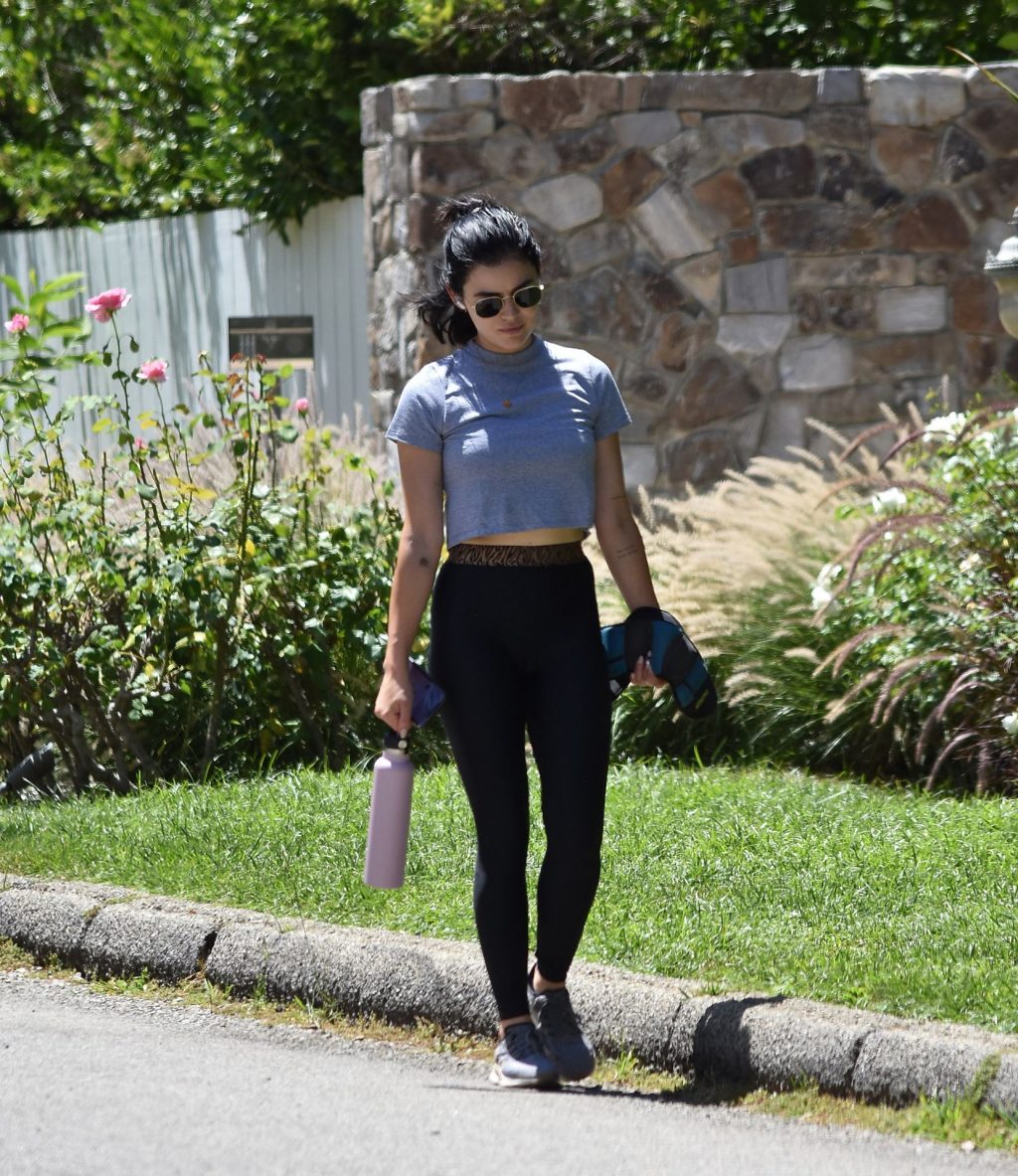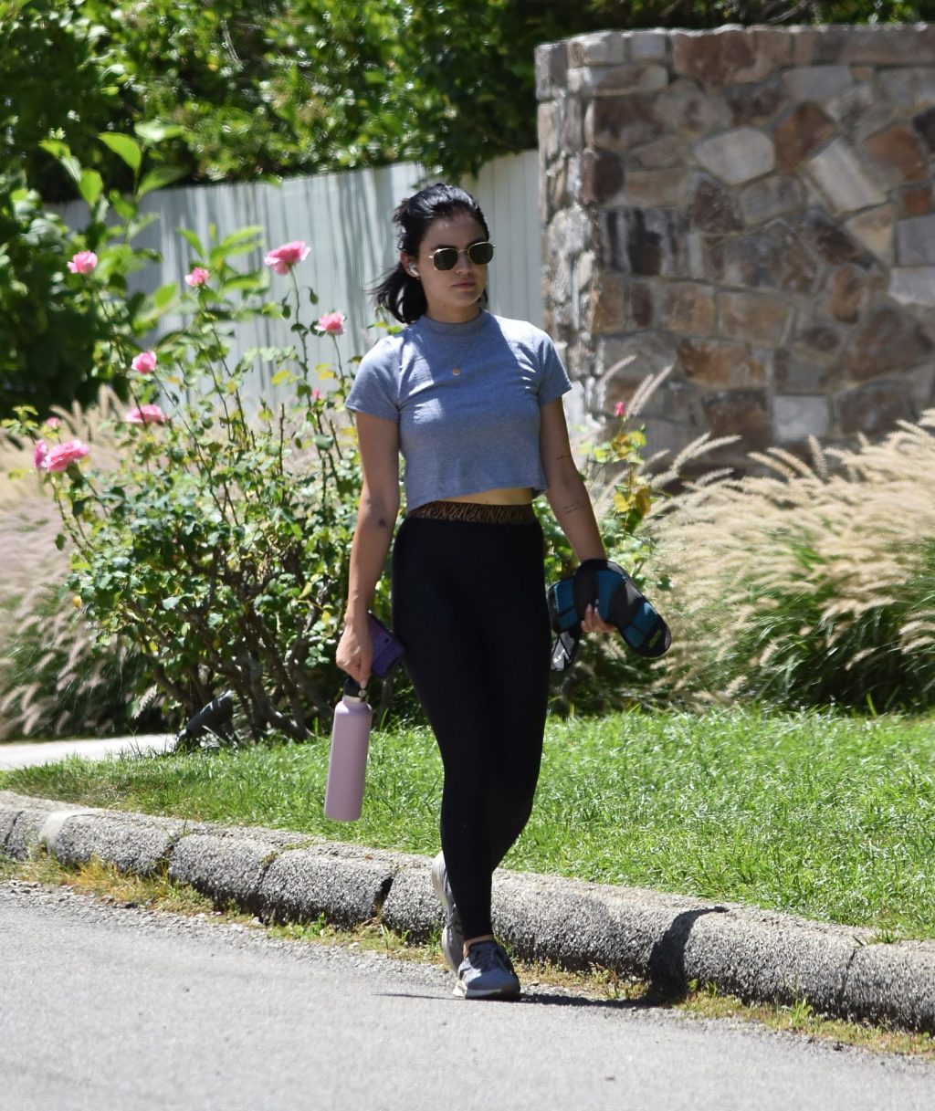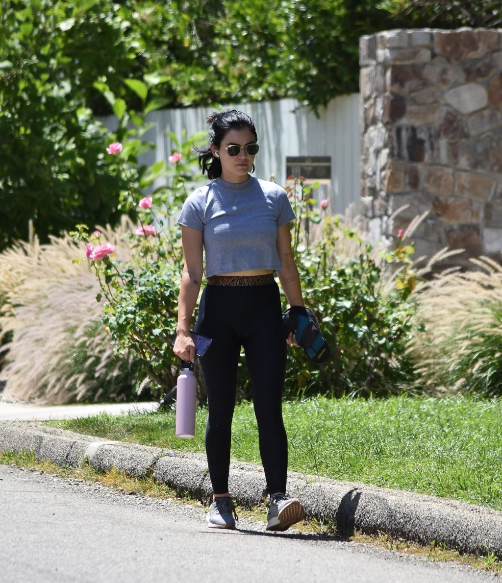 Lucy Hale sale a pasear por Los Ángeles, 12/06/2020. La actriz de 30 años llevaba una botella de agua rosa y vestía un top corto gris que dejaba el abdomen al descubierto, mallas negras y zapatillas negras.