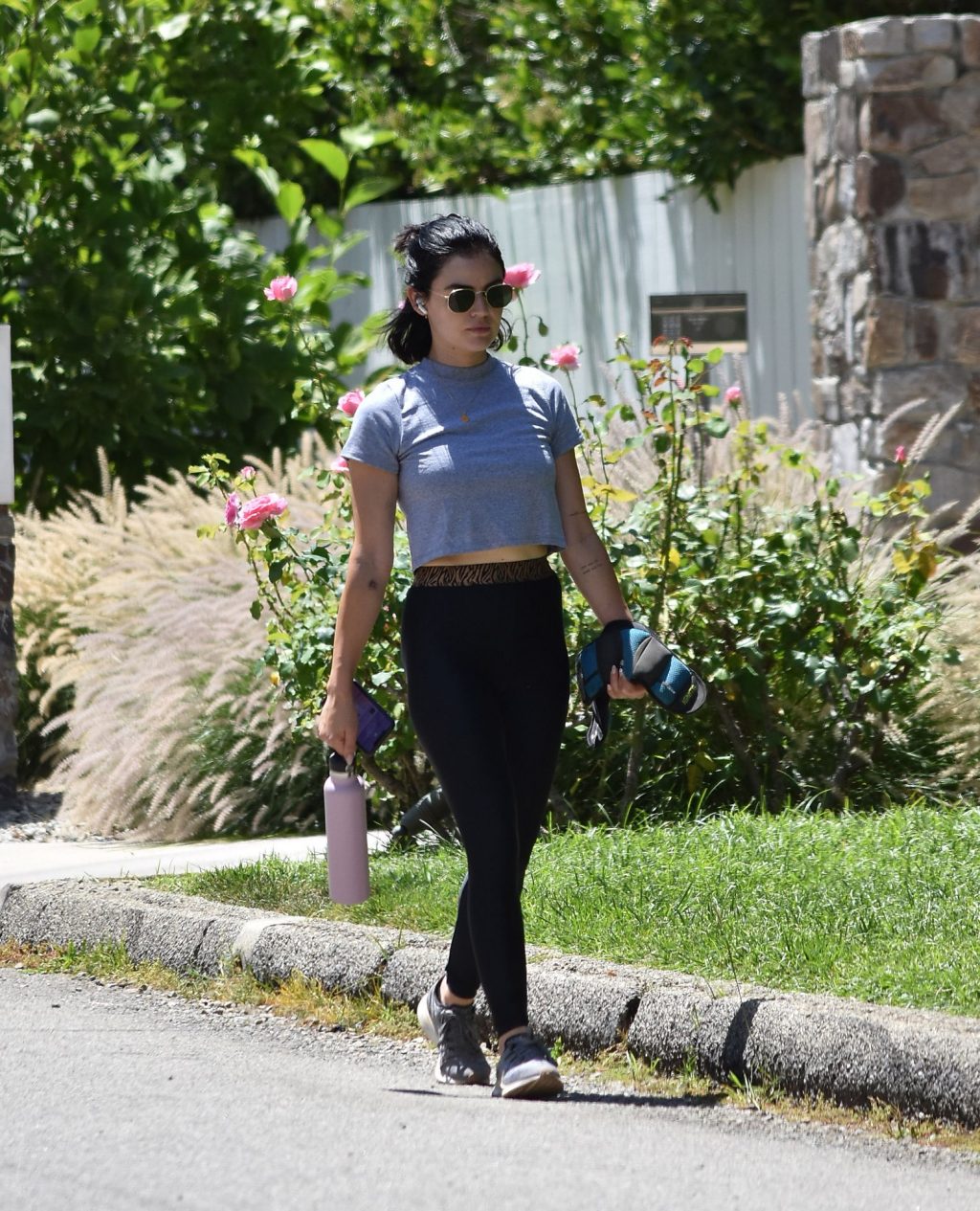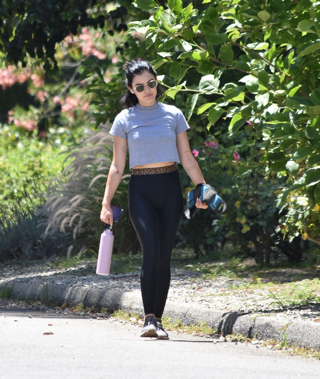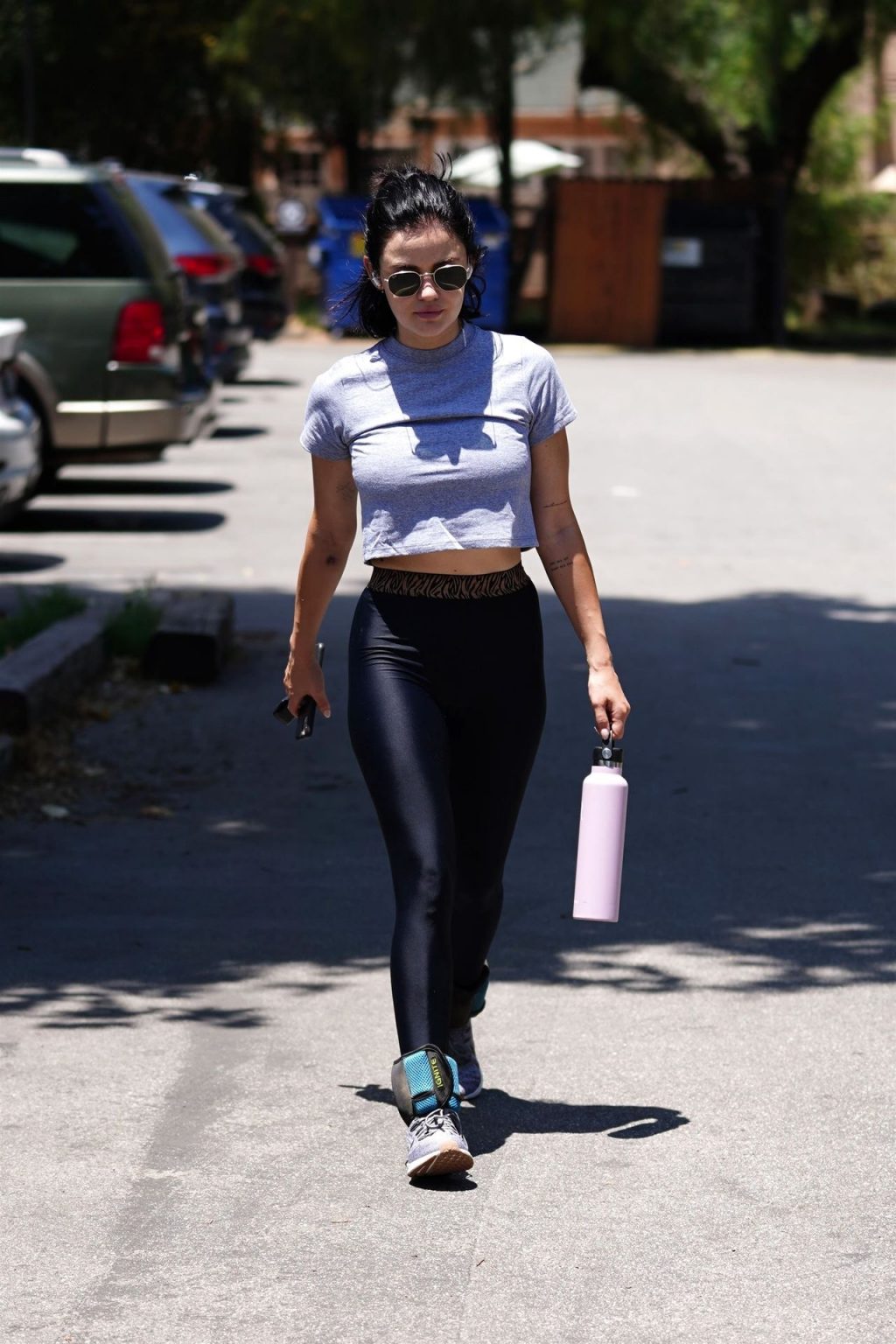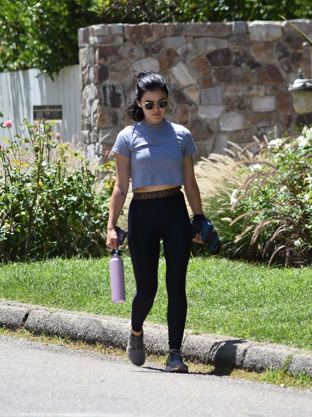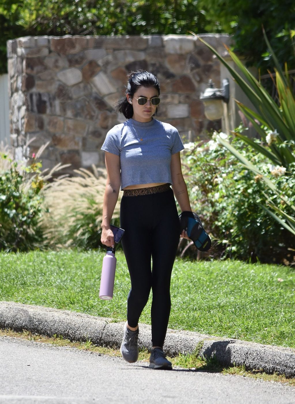Lucy Hale sale a pasear por Los Ángeles, 12/06/2020. La actriz de 30 años llevaba una botella de agua rosa y vestía un top corto gris que dejaba el abdomen al descubierto, mallas negras y zapatillas negras.