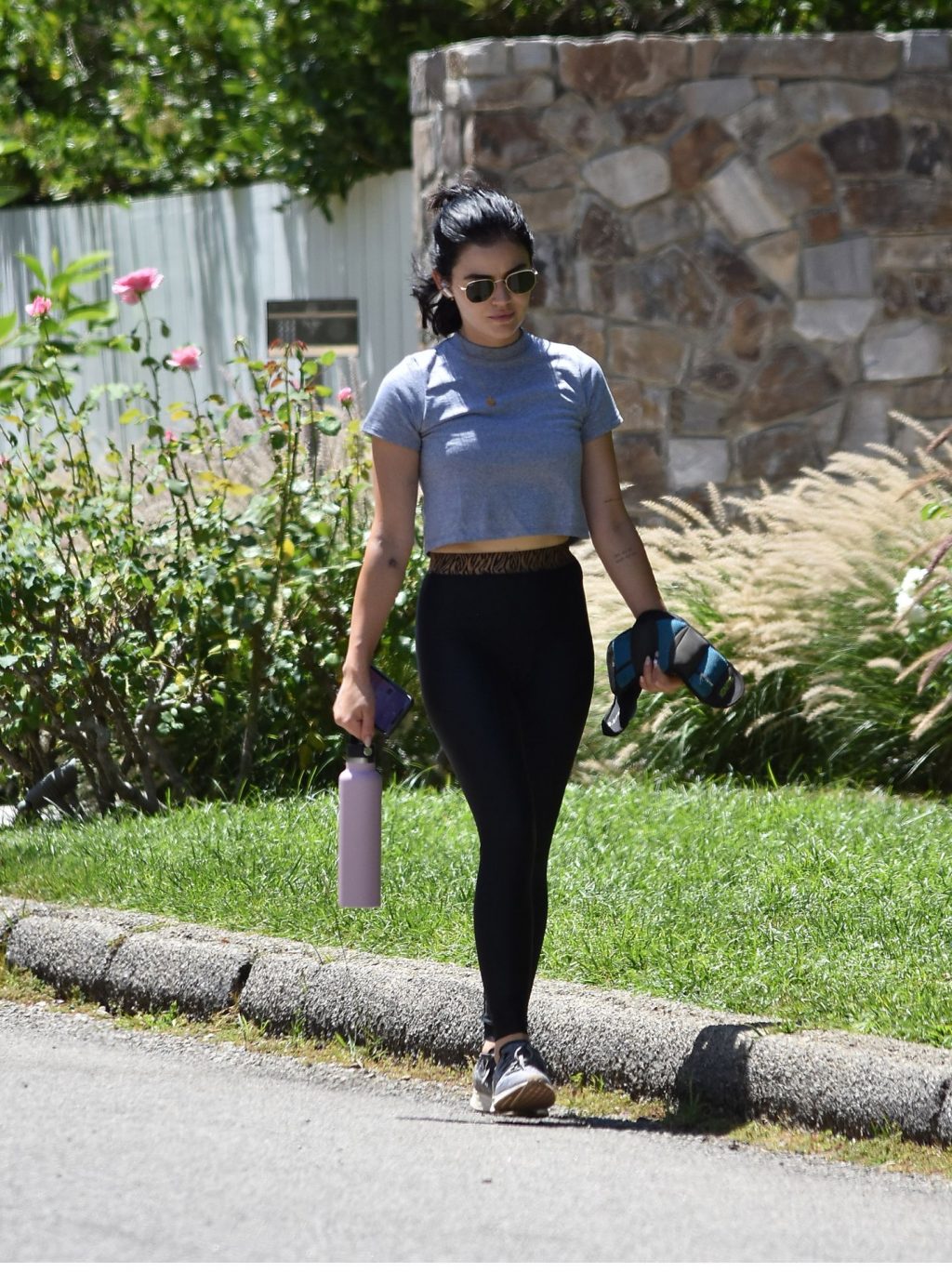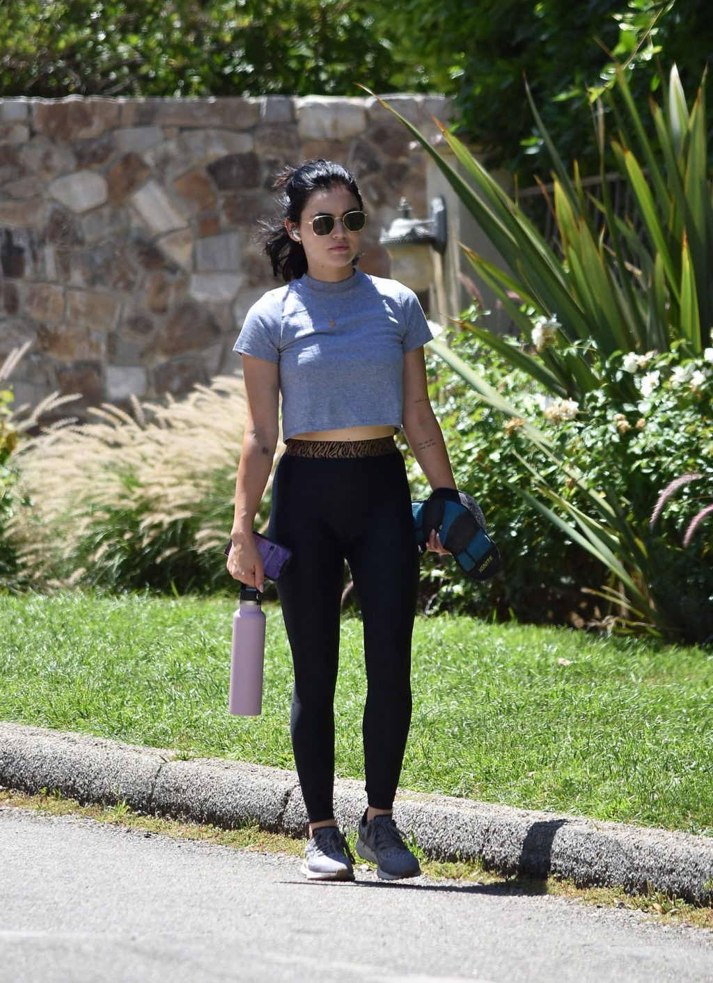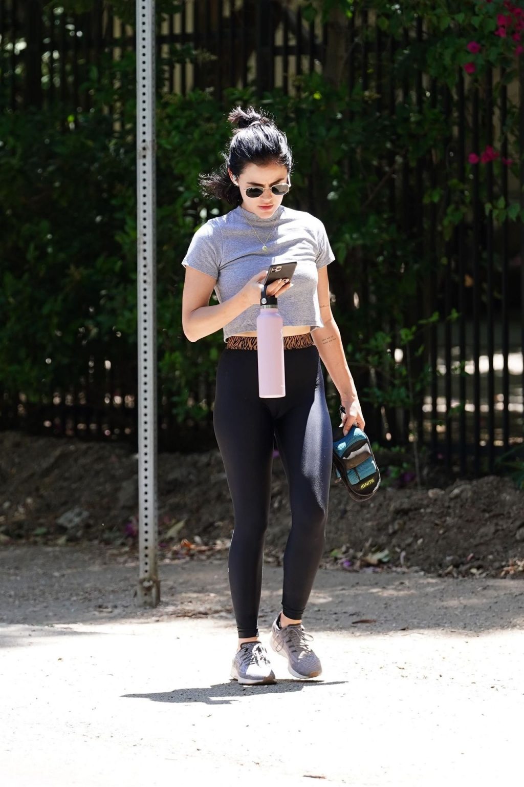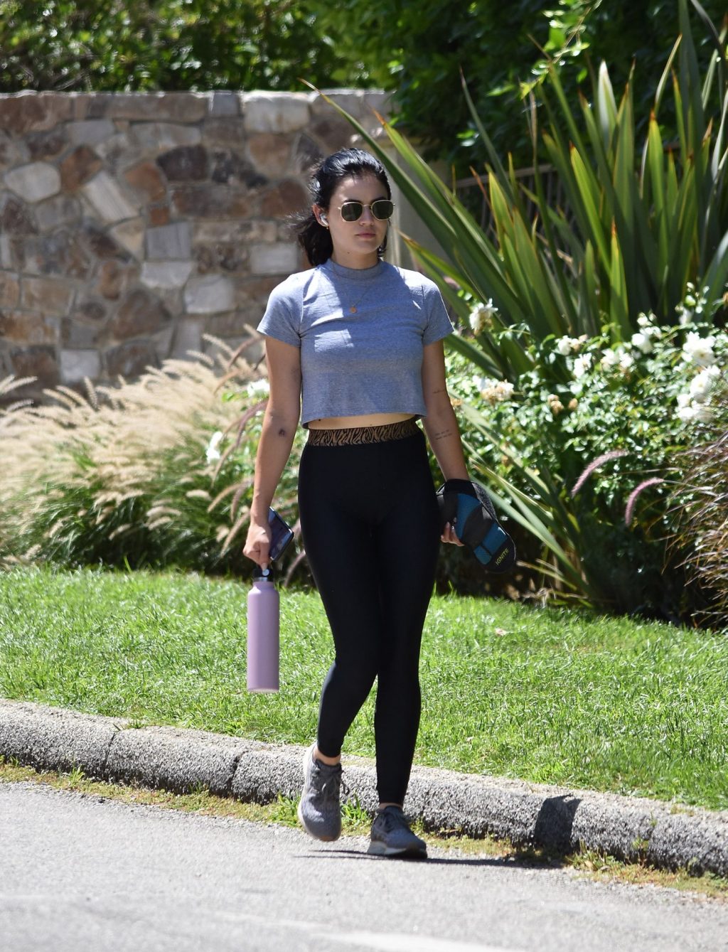 Lucy Hale sale a pasear por Los Ángeles, 12/06/2020. La actriz de 30 años llevaba una botella de agua rosa y vestía un top corto gris que dejaba el abdomen al descubierto, mallas negras y zapatillas negras.