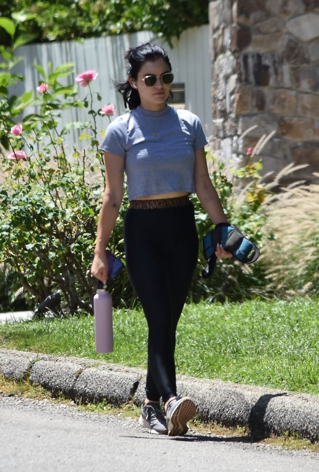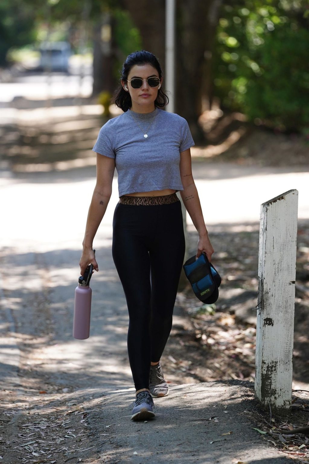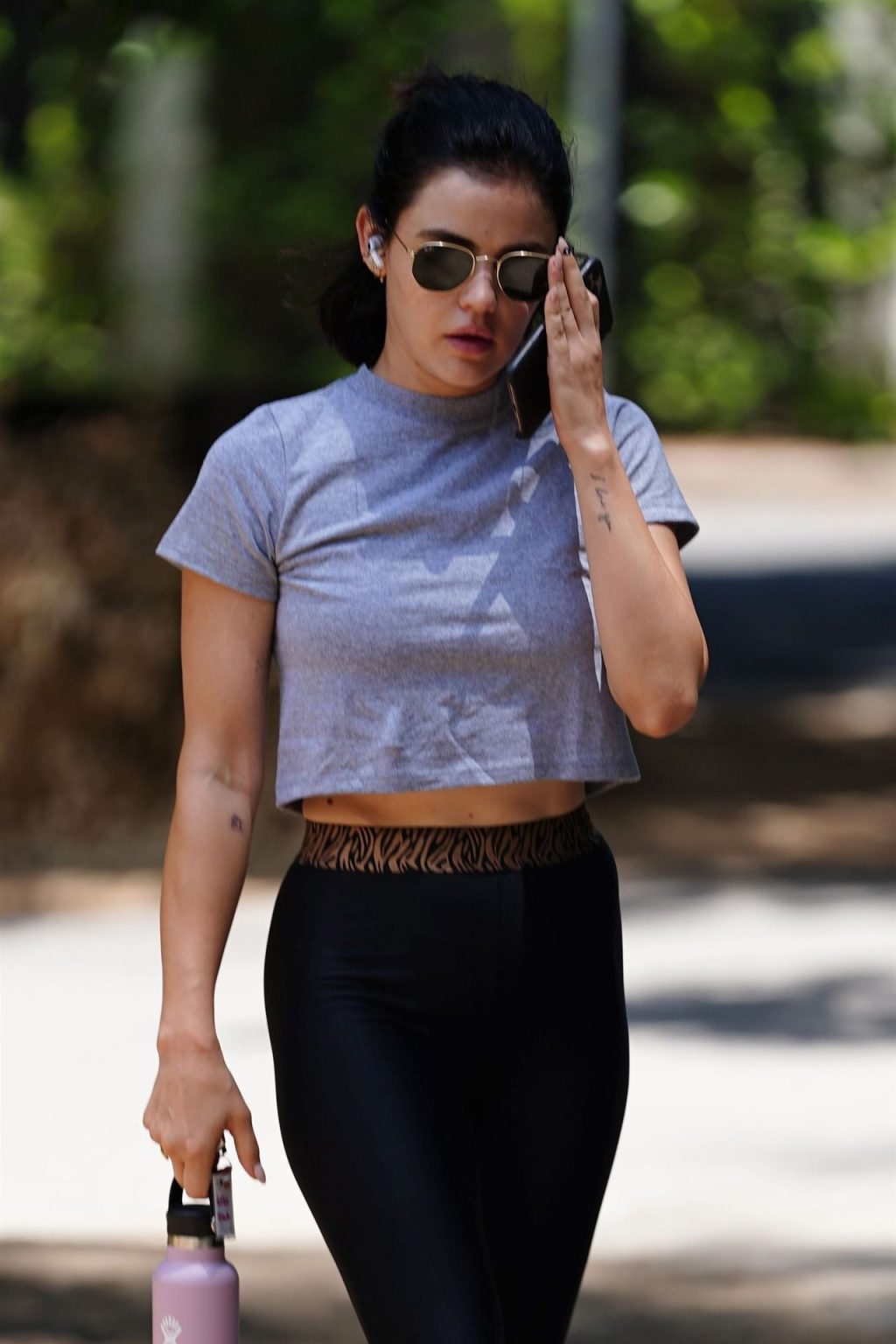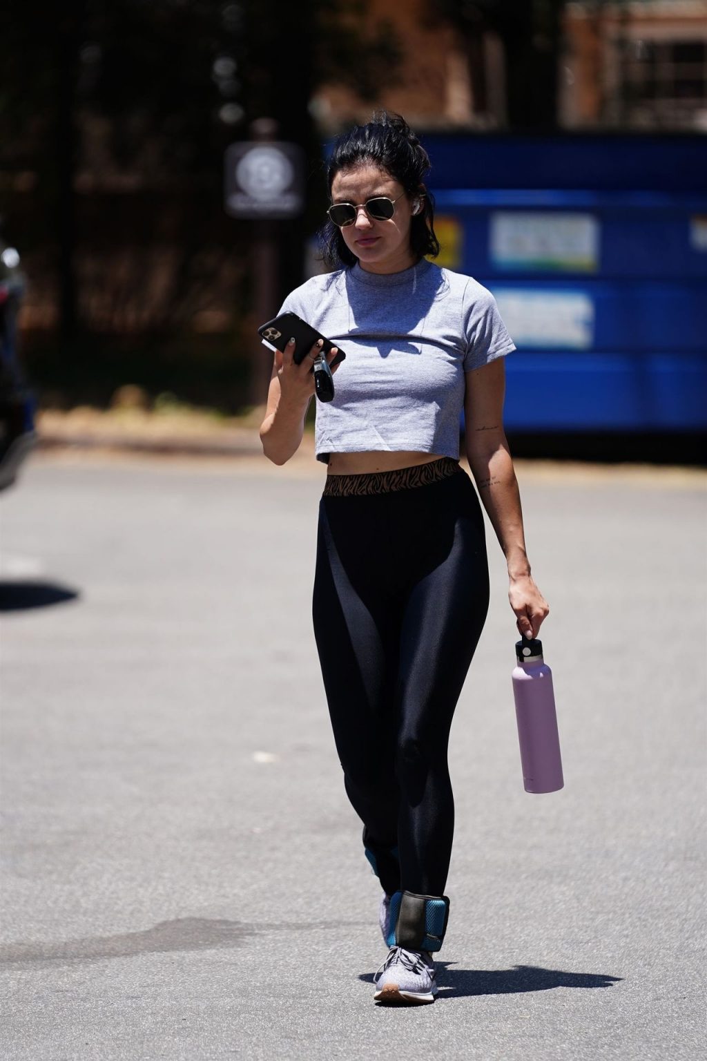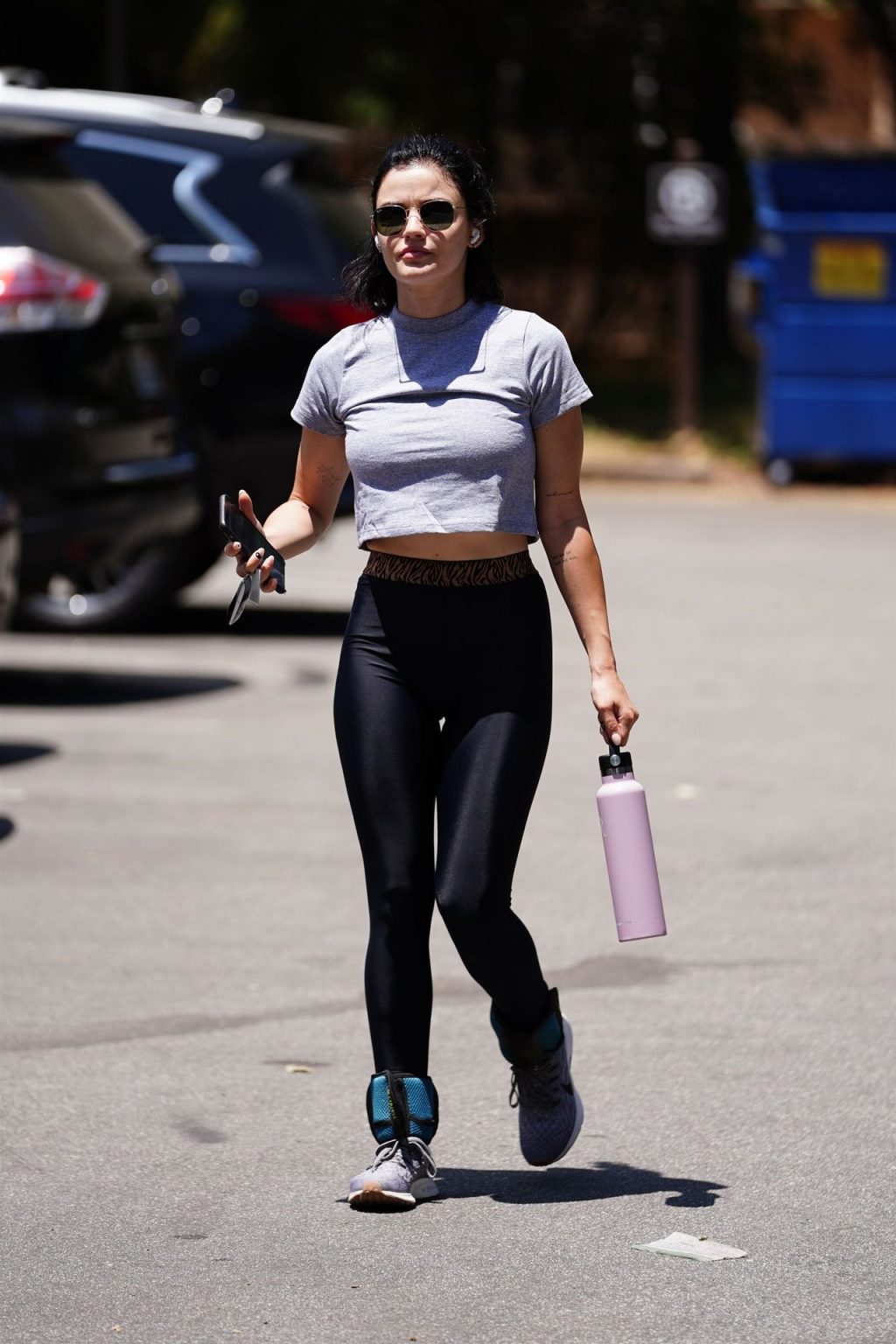 Lucy Hale sale a pasear por Los Ángeles, 12/06/2020. La actriz de 30 años llevaba una botella de agua rosa y vestía un top corto gris que dejaba el abdomen al descubierto, mallas negras y zapatillas negras.